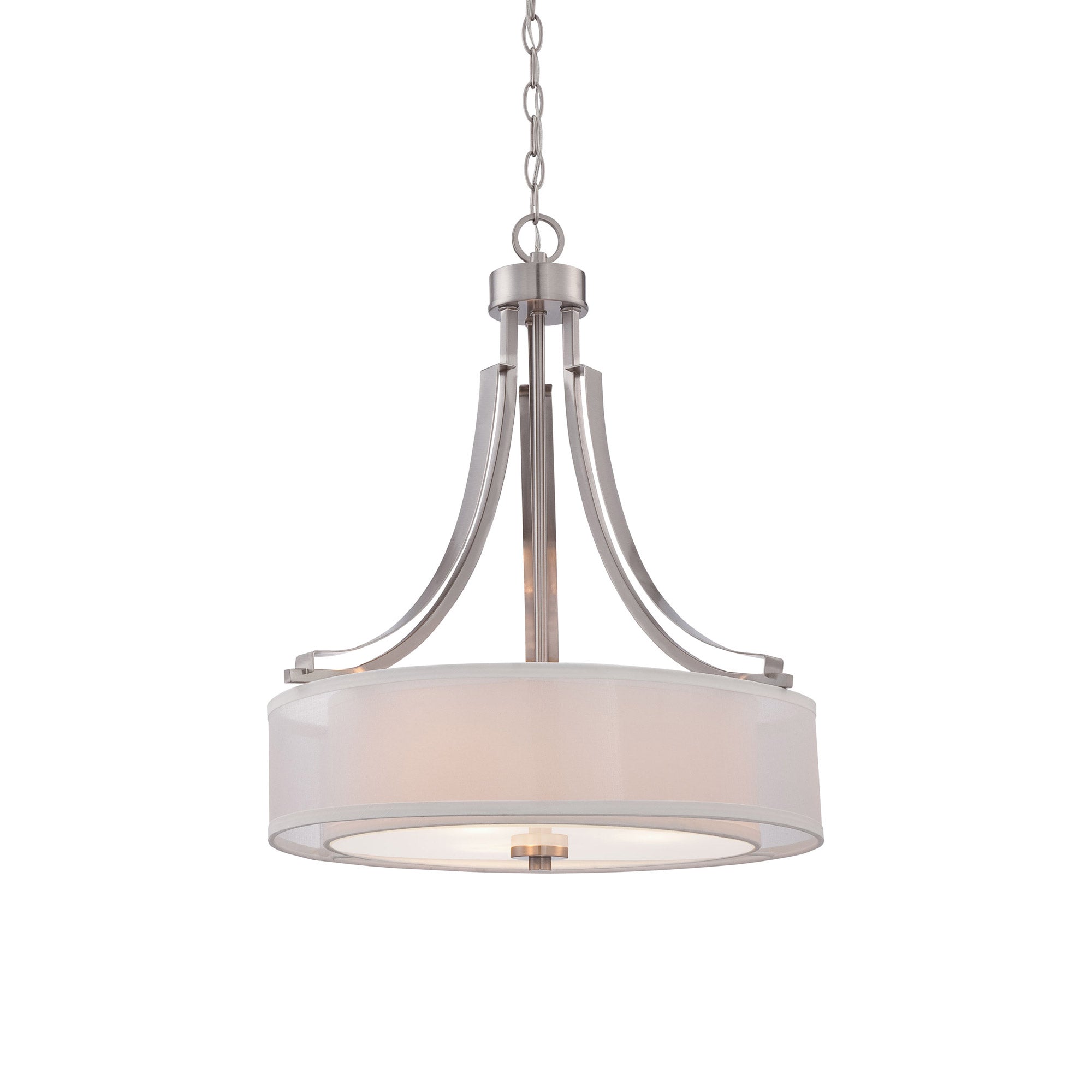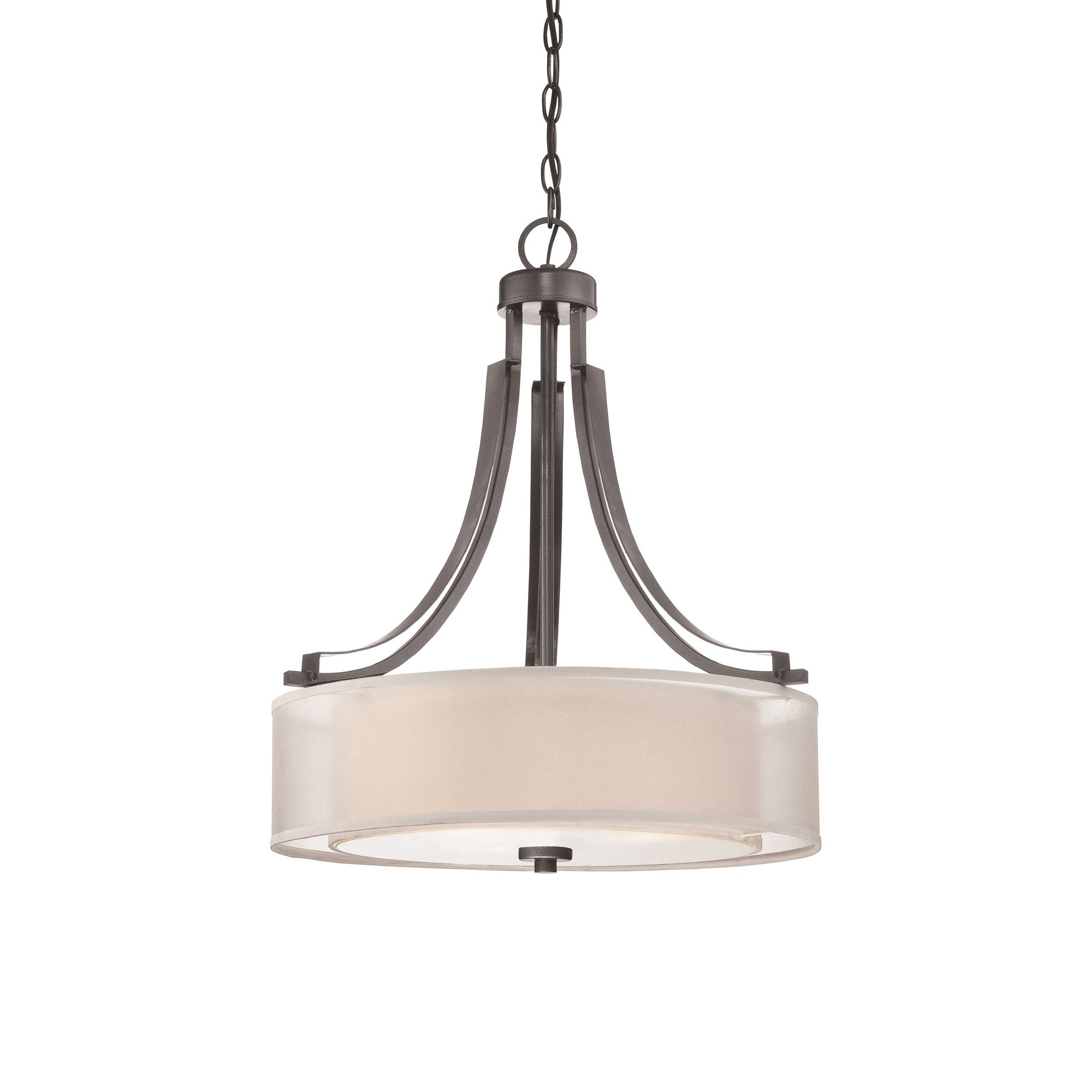 An ultra-elegant drum silhouette plays on the heartstrings of custom designers as the Parsons Studio Pendant Light from Minka Lavery adds a special focus. This decadent fixture works with layering on multiple fronts, as a double-shade design delivers optimal diffusion and openwork metal framing is sleek and romantic. Choose this pendant to make an exquisite style statement.