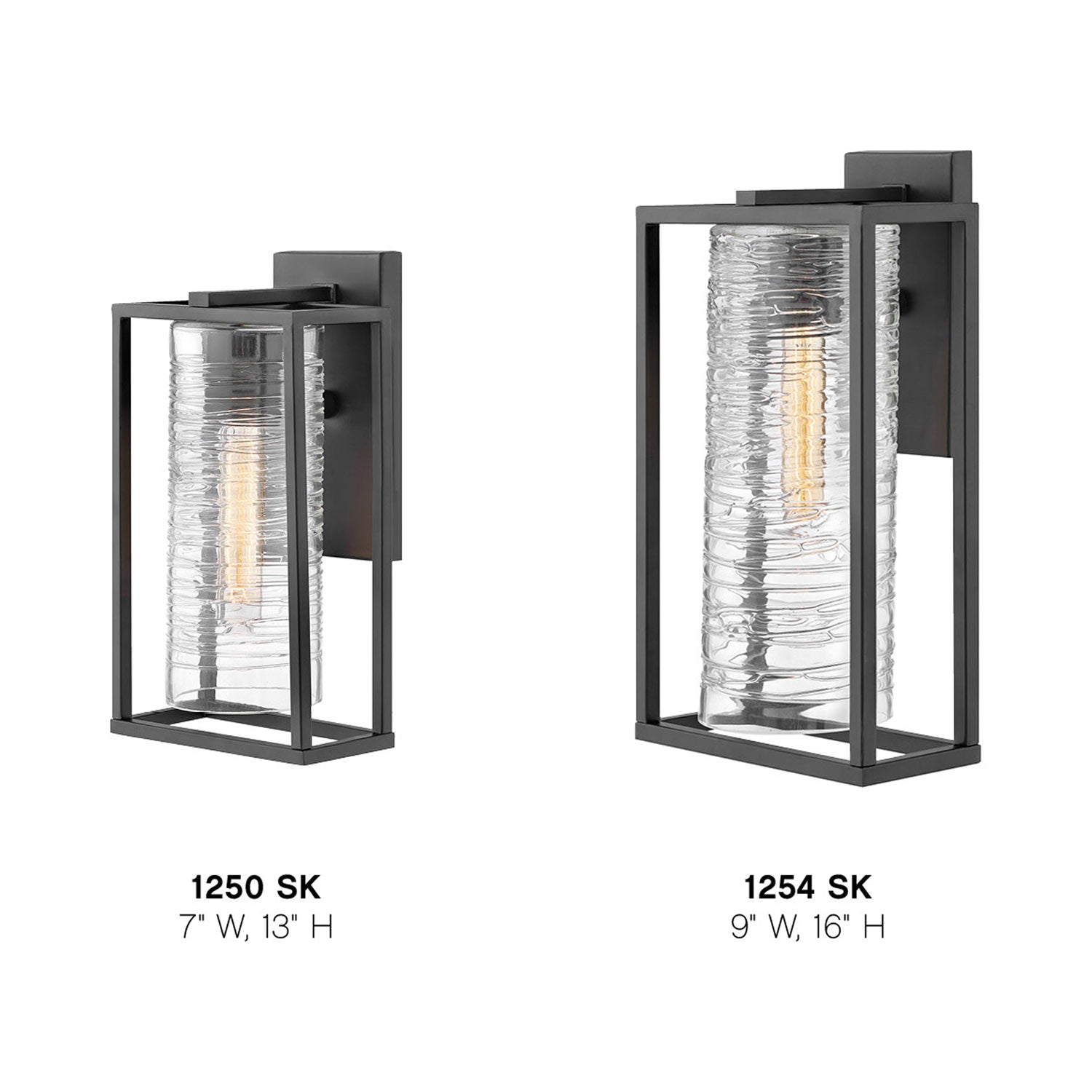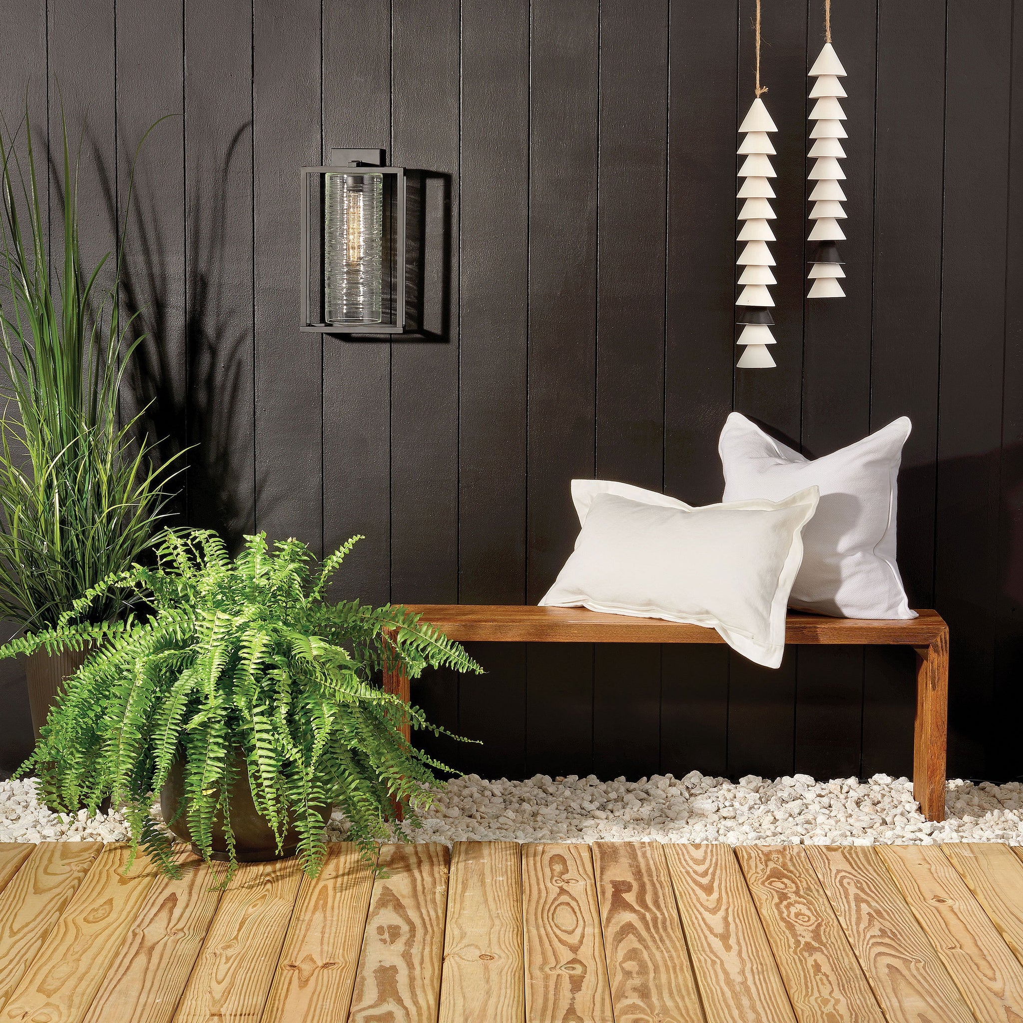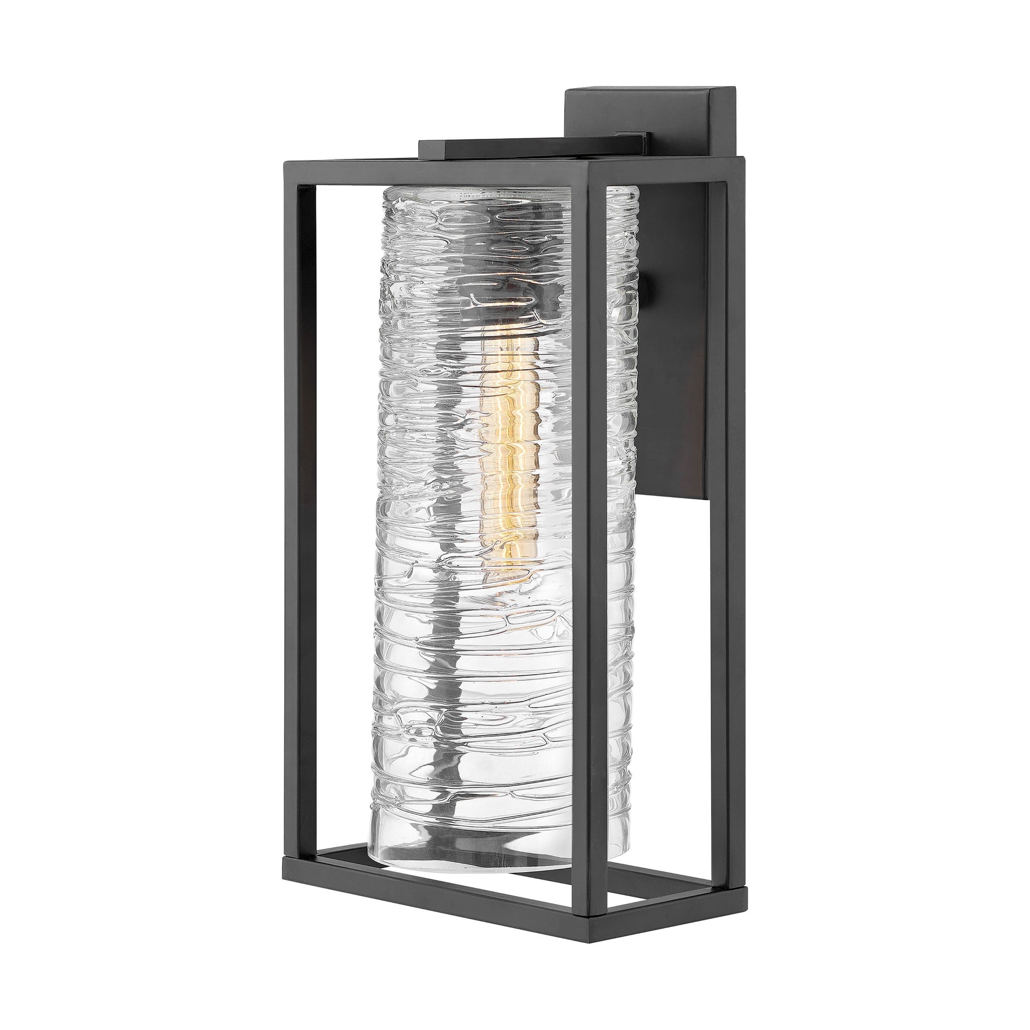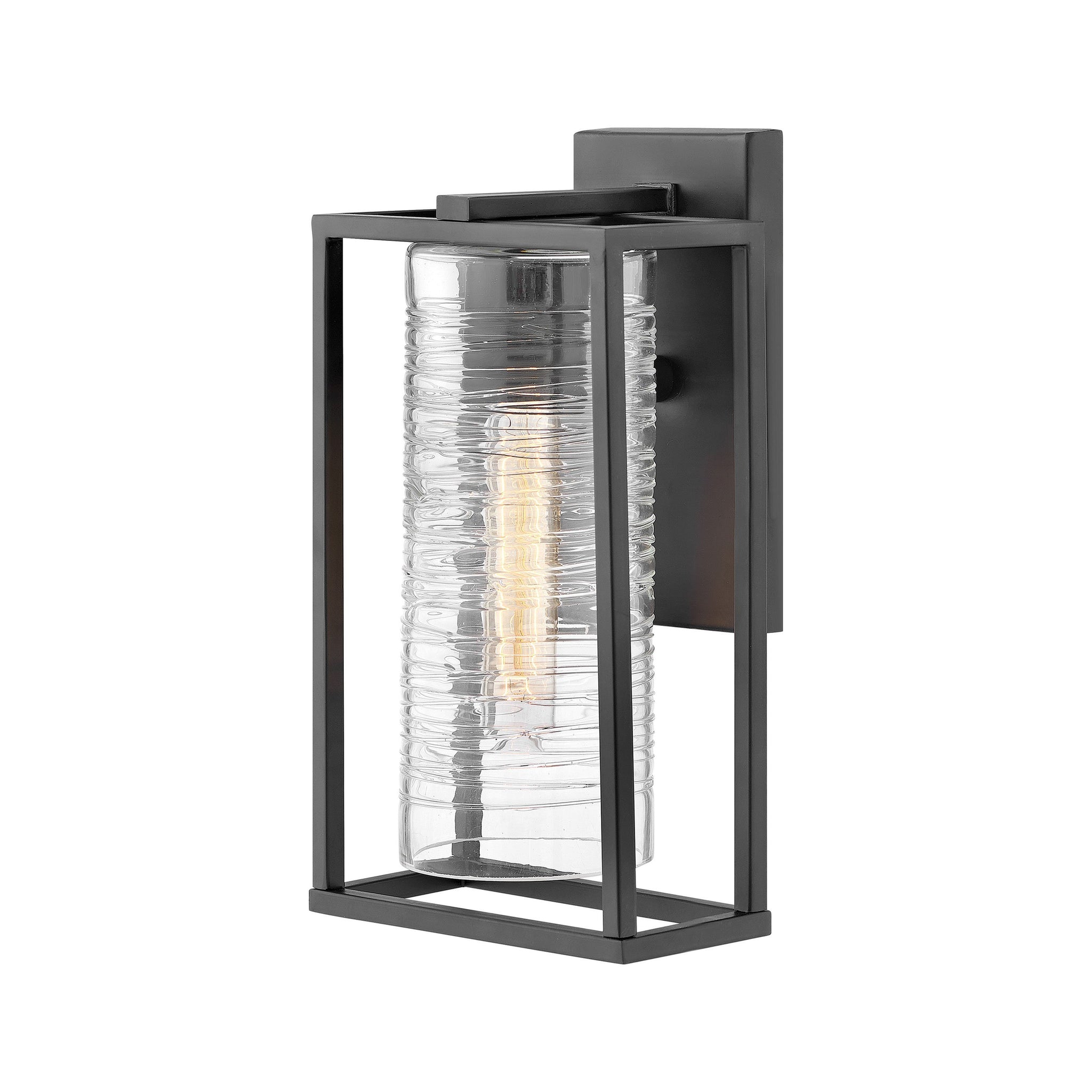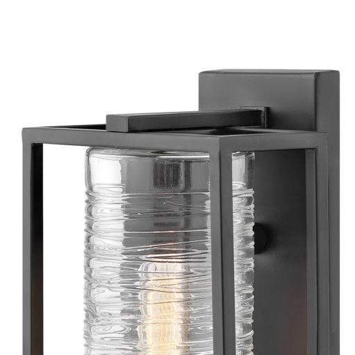 Pax Glass Outdoor Wall Light features a stunning clear, spun glass cylinder as a dramatic focal point, with its bold linear shape enclosed in a sleek geometric Satin Black frame. Pairing the modern minimalist design with an elongated vintage T-bulb is recommended to fully illuminate the glass and complement the overall aesthetic.