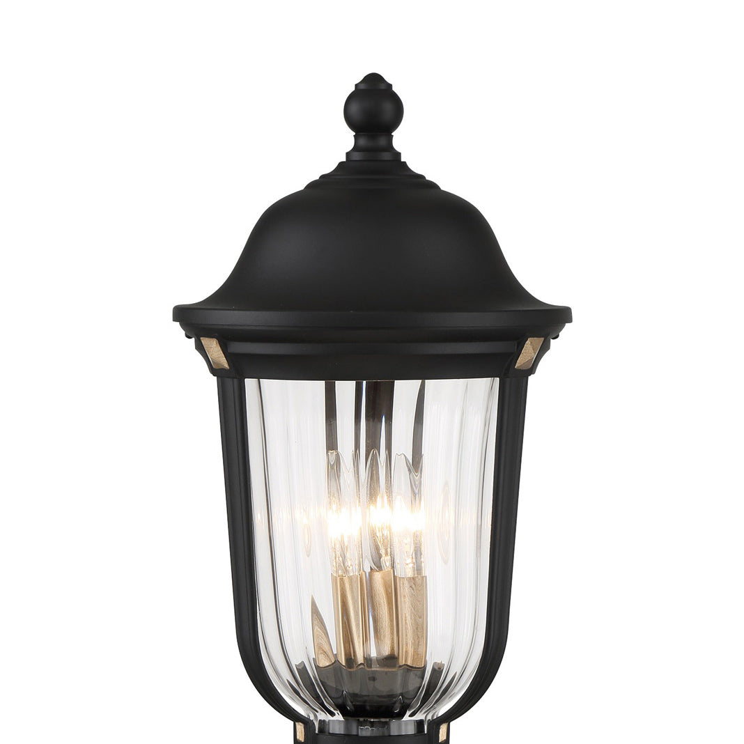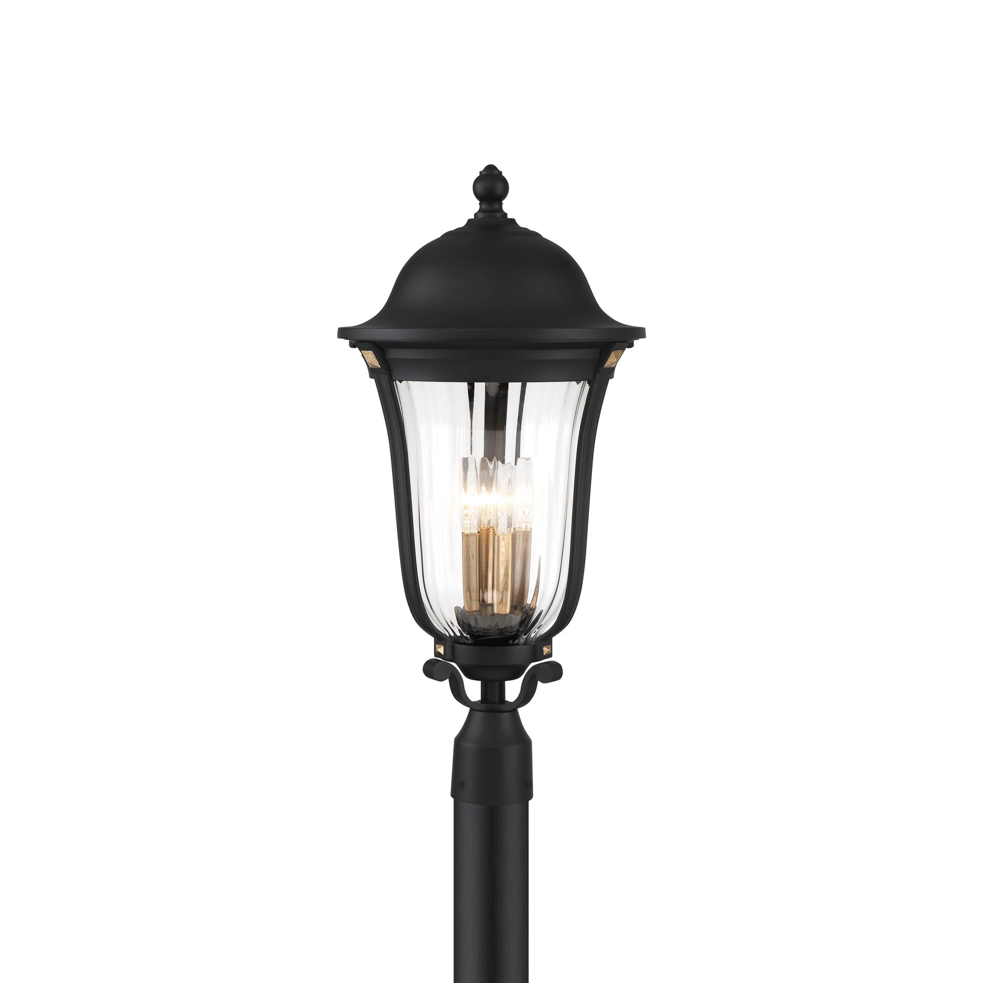 Dominated by a vintage village aesthetic, the Peale Street Outdoor Post Light from The Great Outdoors is a perfect choice for creating soft, romantic style in an exterior space. Graceful curves shape a sand coal finish metal frame with an ornate top and capsule silhouette, complete with the ethereal look of clear ribbed glass panels offering a lushly distorted view of candelabra lights inside.