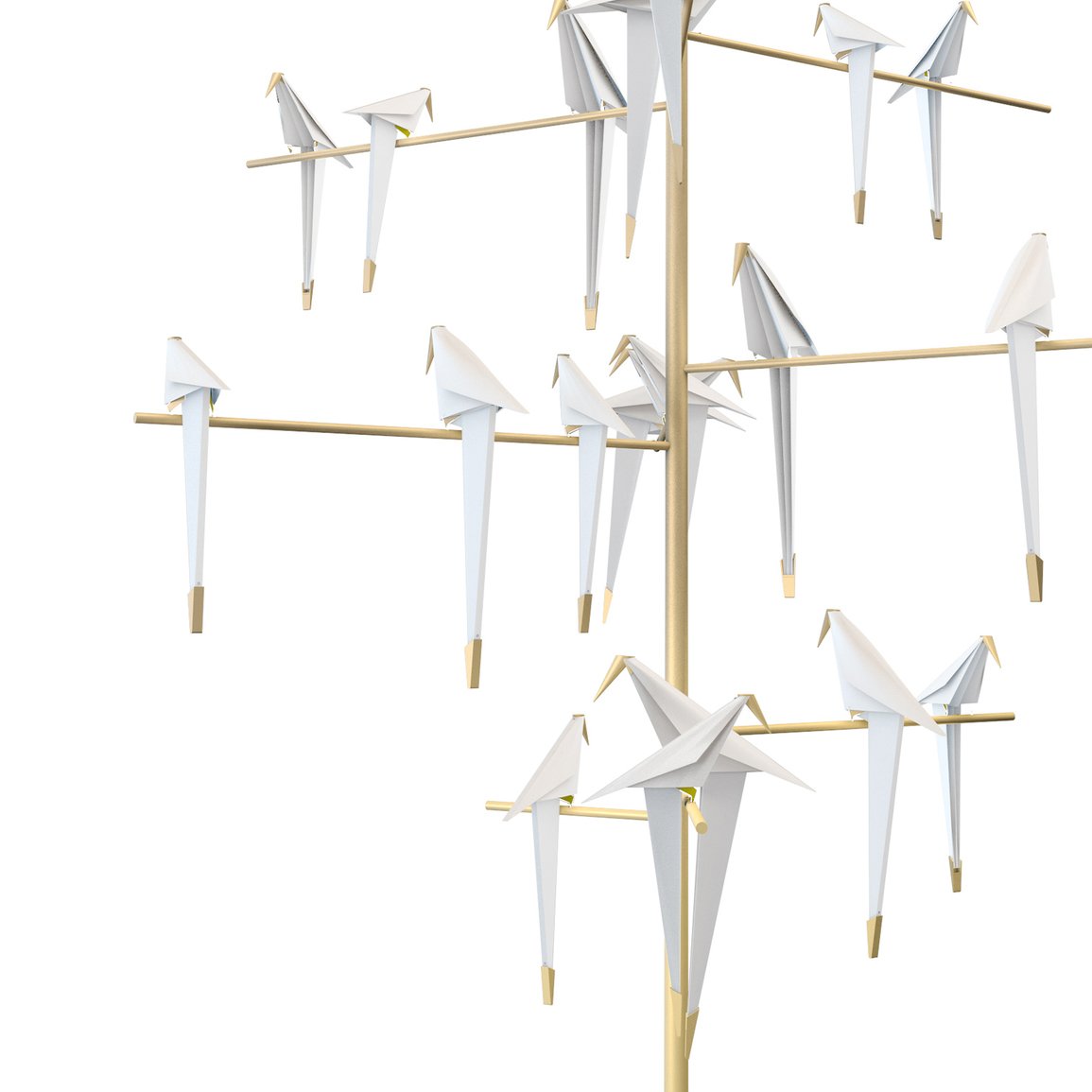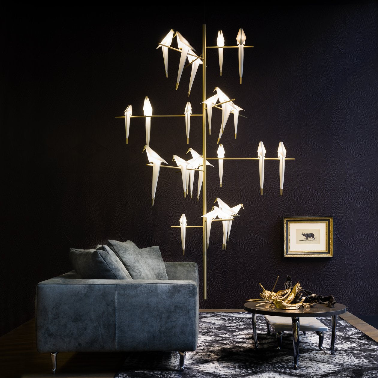Cascading from the ceiling is the Perch Tree LED Chandelier from Moooi. A flock of birds perch on lovely gold branches, exuding plenty of clean lines, geometric shapes, and energy efficient lighting to create the ultimate experience in an entryway or grand dining space.