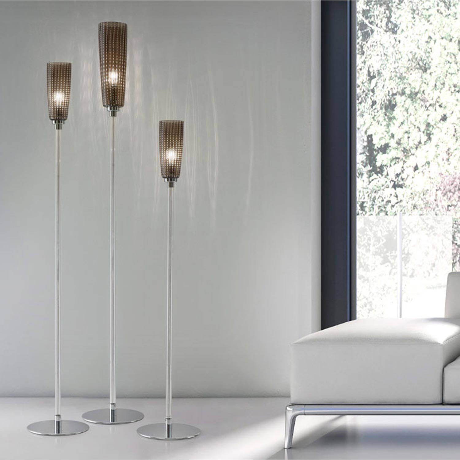 The Perle Floor Lamp from Zafferano America creates a decadent gallery effect with fine art quality and a stunning radiance perfect for a custom space. Indulge in the delicacy of textured transparent mouth-blown glass hand-crafted to put finishing touches on beauty in lighting. Indirect diffused lighting from a clear extruded borosilicate glass stem meets a tasteful chrome base to deliver palette versatility and elegance.