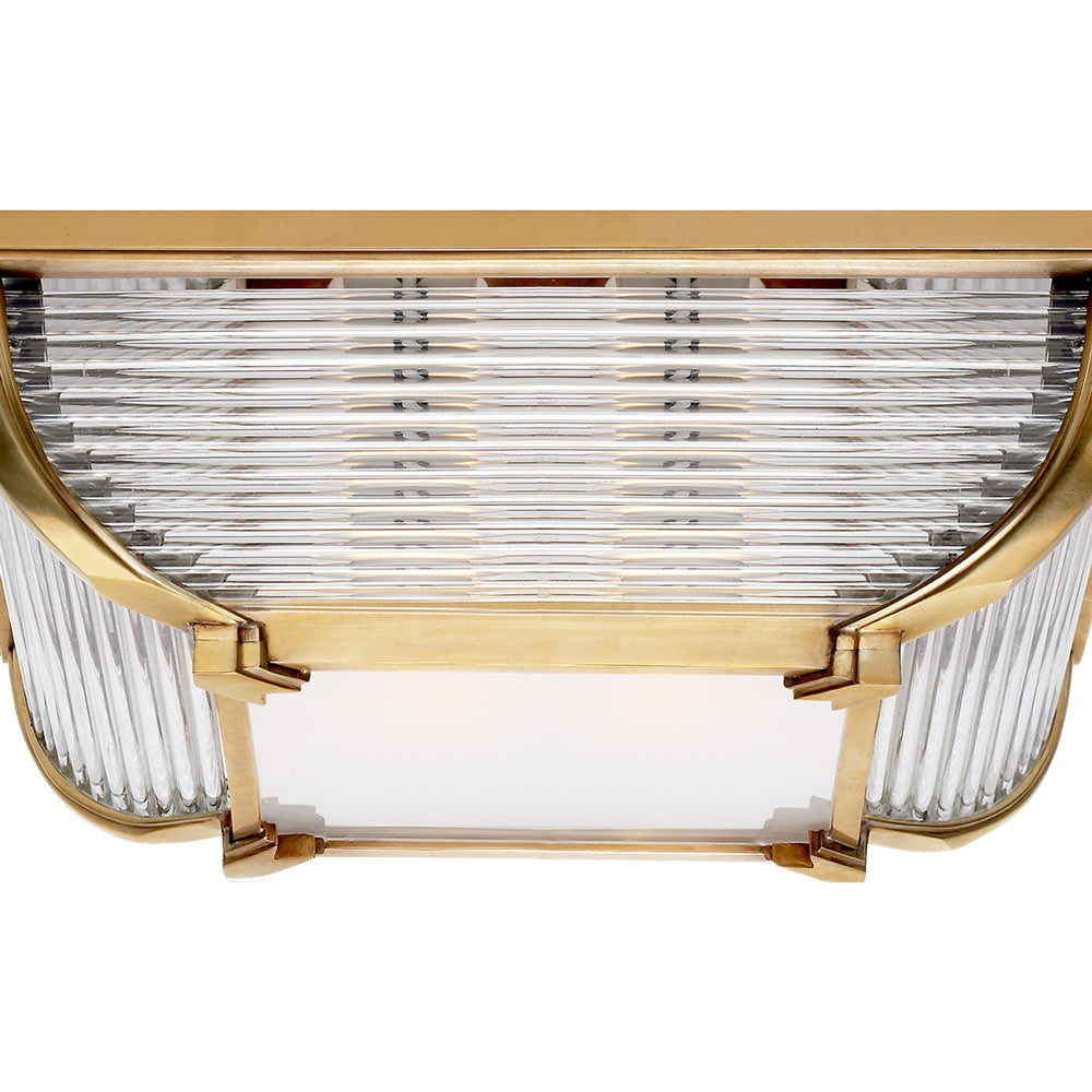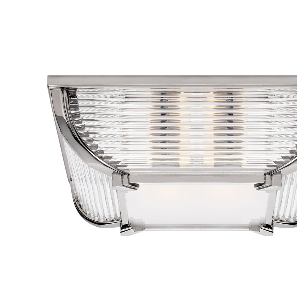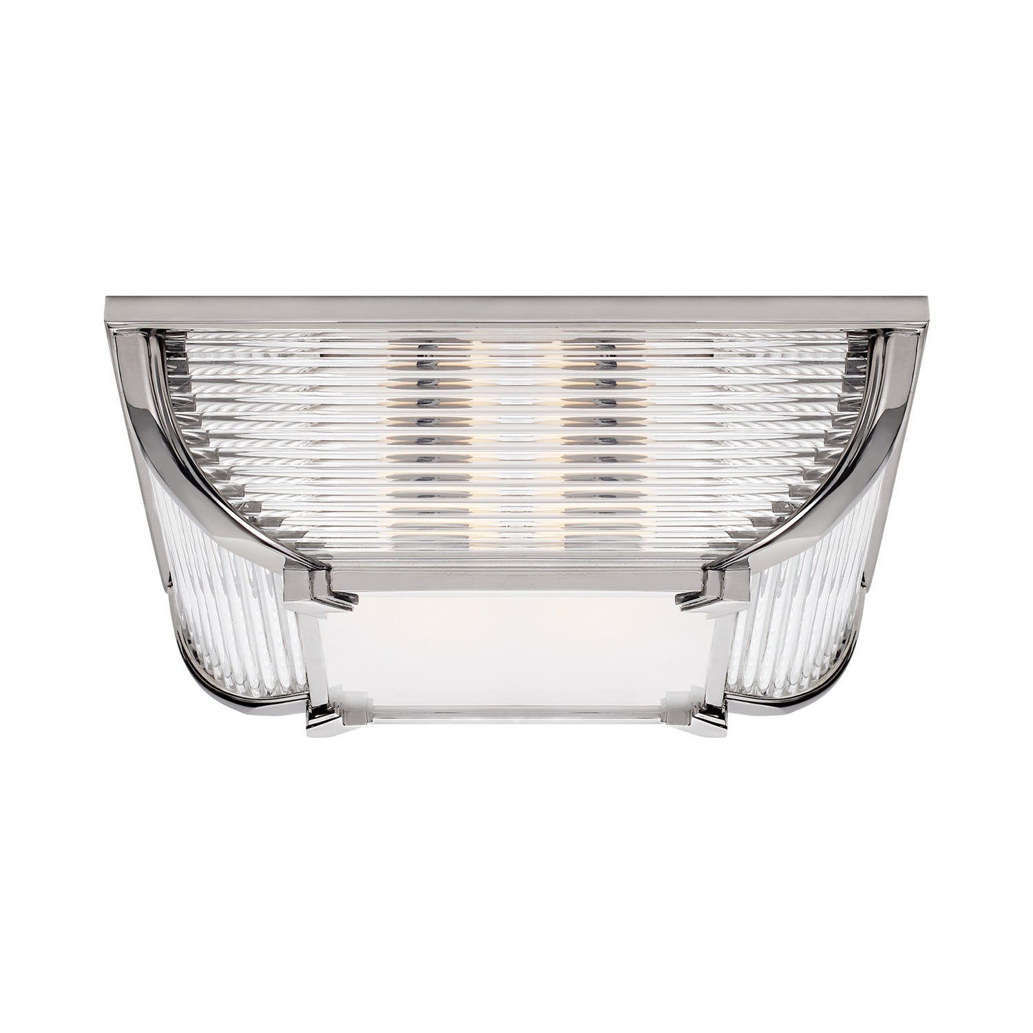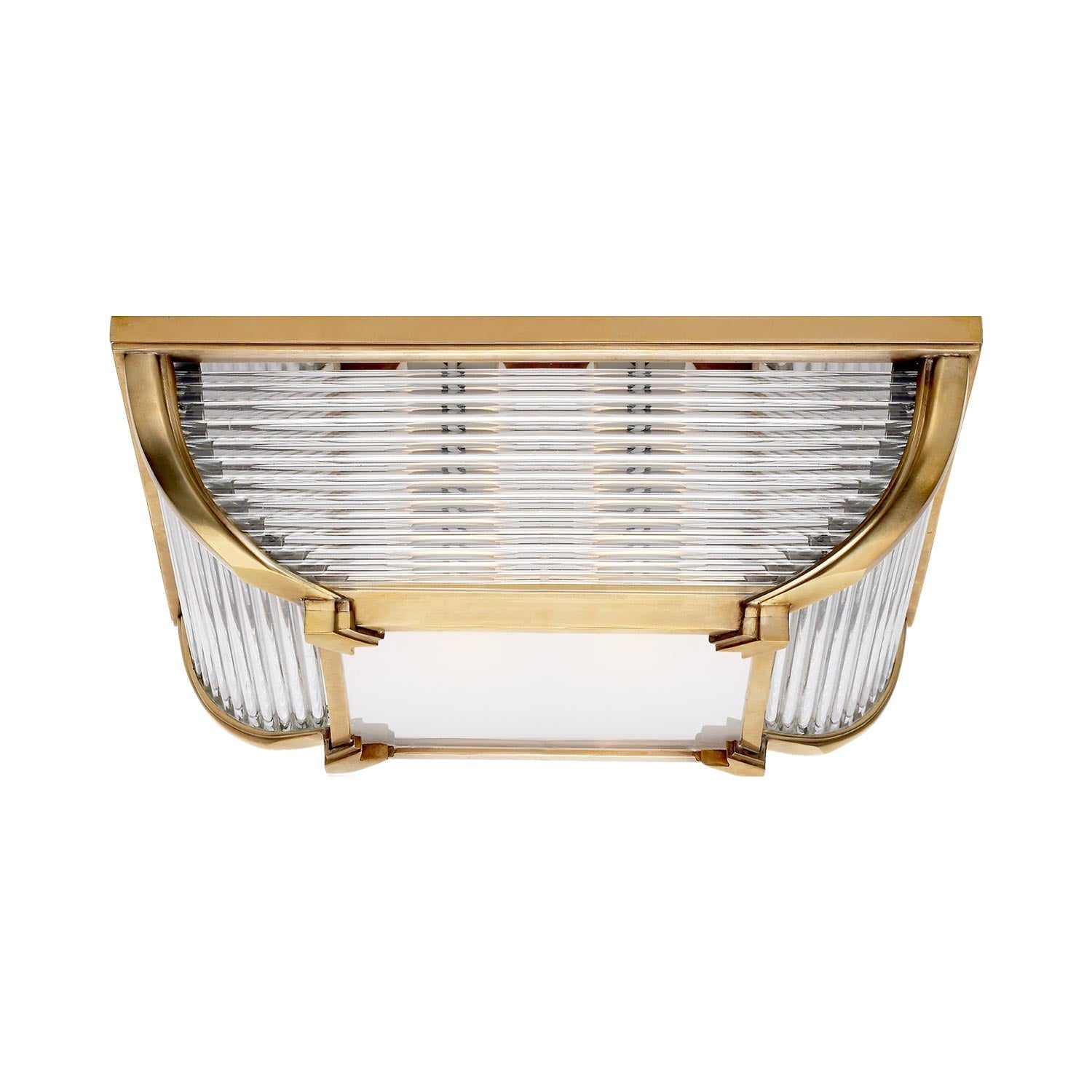 Strategy plays an influential role in turning gritty industrial fare into a veritable art piece, emitting ambient light in a modern venue. The Perry Square Flush Mount Ceiling Light from Visual Comfort Signature capitalizes on texture and architecture, with horizontally placed glass rods reflecting illumination ideal for a living room or kitchen. A bit of retro fare follows gentle curves and straight lines joining in a metal frame with extra detail.