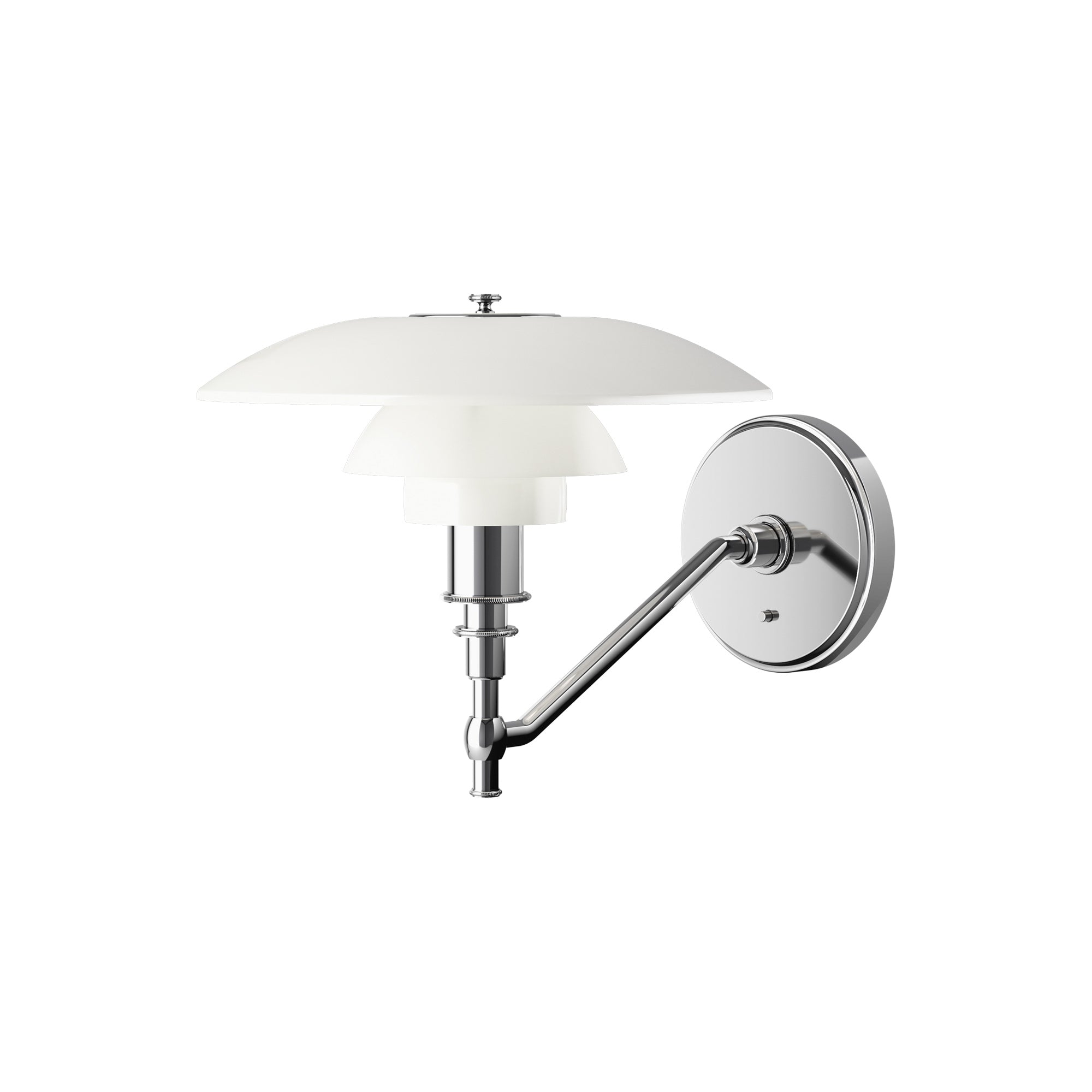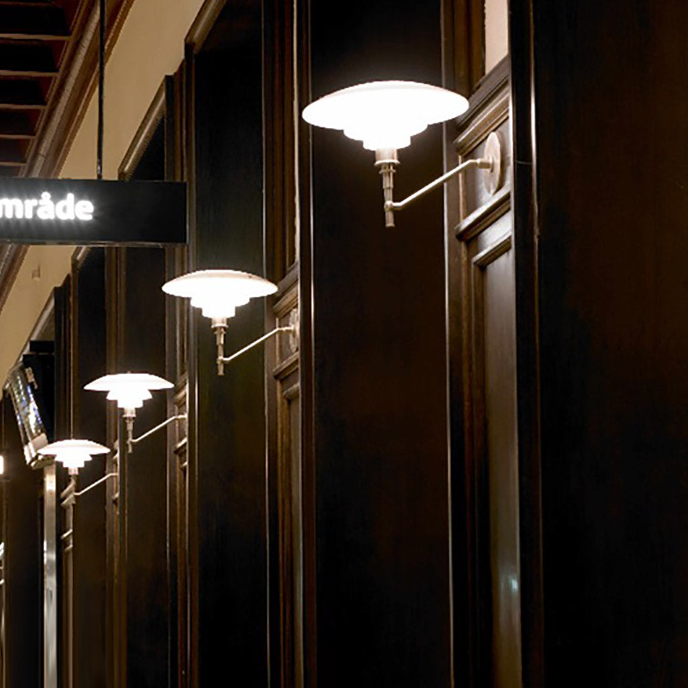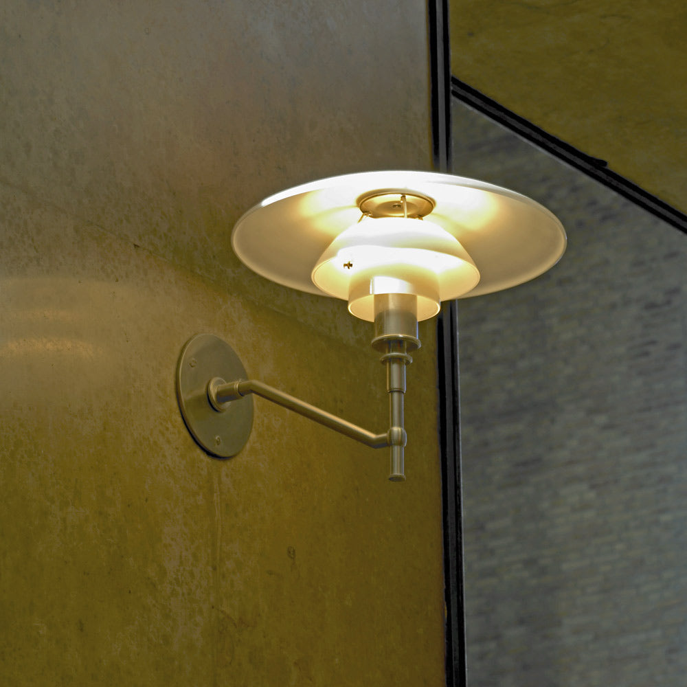 Instill warm and welcoming ambiance with the gorgeous PH 3/2 Wall Light from Louis Poulsen. Three layers of white opal glass are gently domed to cast downward illumination while a metal arm and support echoes the profile to create a serene sense of balance and character.