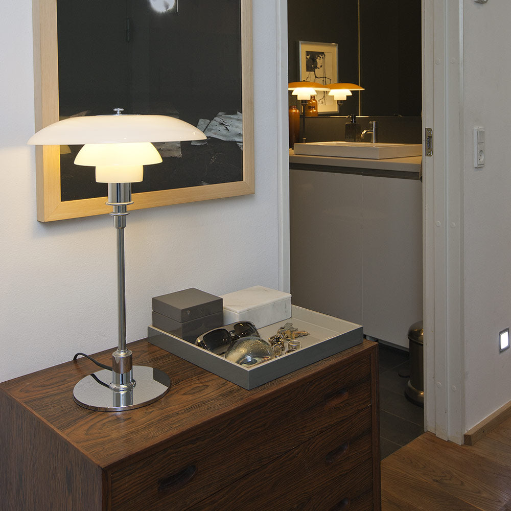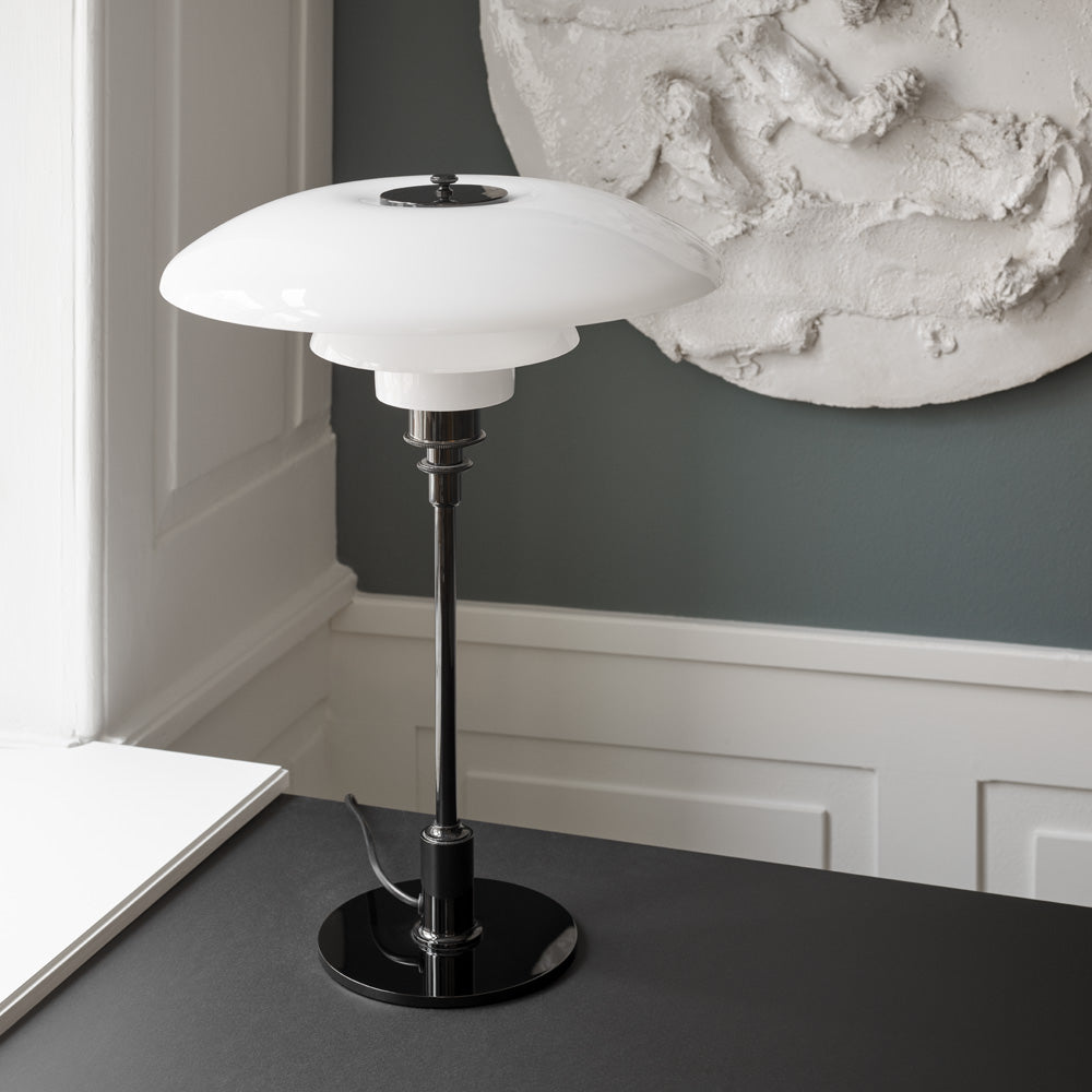 A decorative post and wide base perfectly balance the tapering layered shades of the PH 3½-2½ Glass Table Lamp from Louis Poulsen. Radiating with a sense of symmetry, the lamp pairs mouthblown white opal glass with graceful curves to create beautiful downlighting in any setting. A versatile design that works everywhere from the entry to the bedroom.