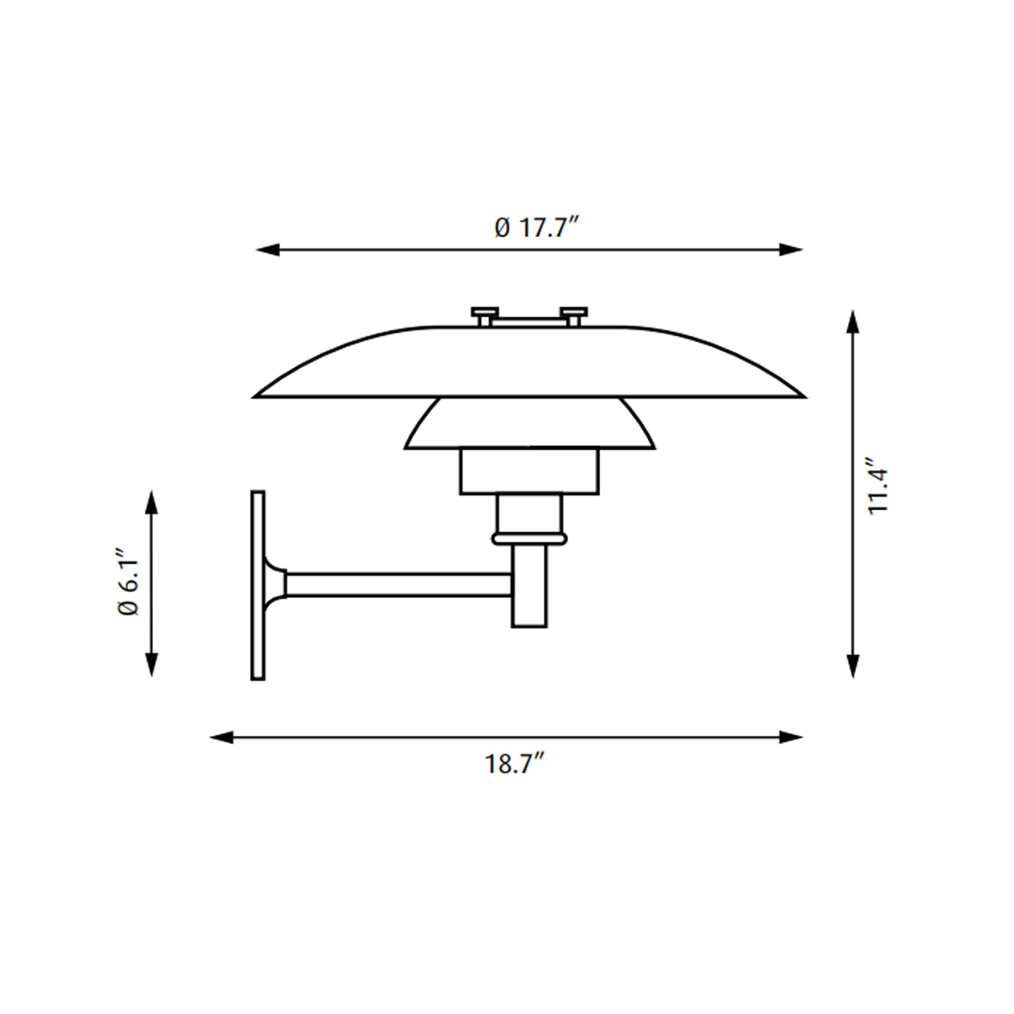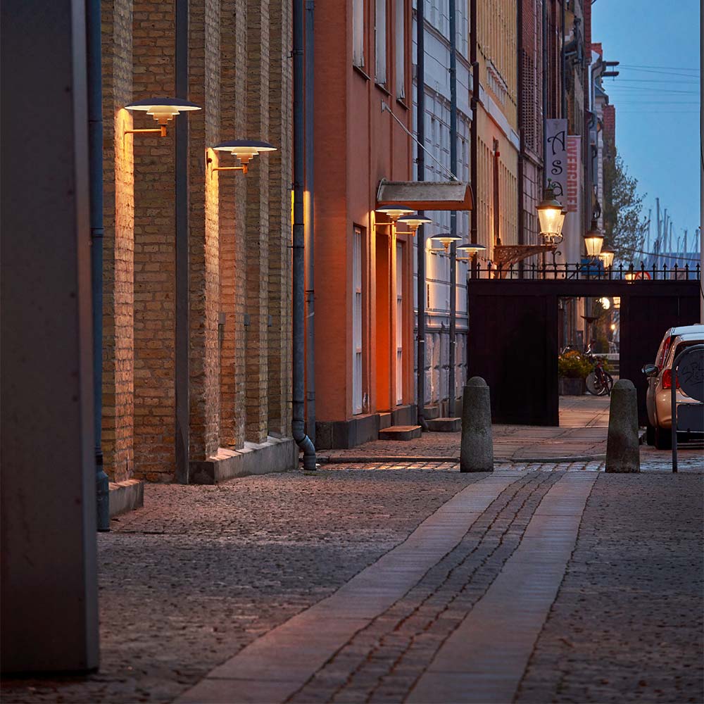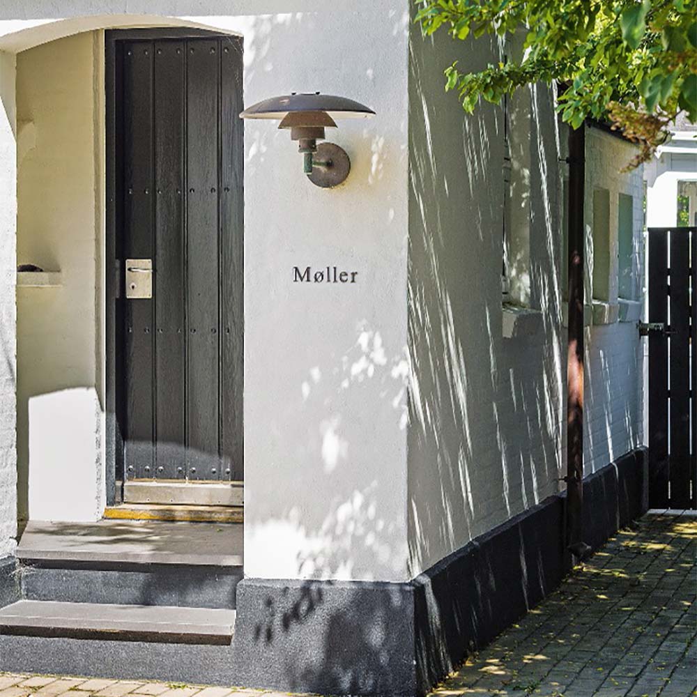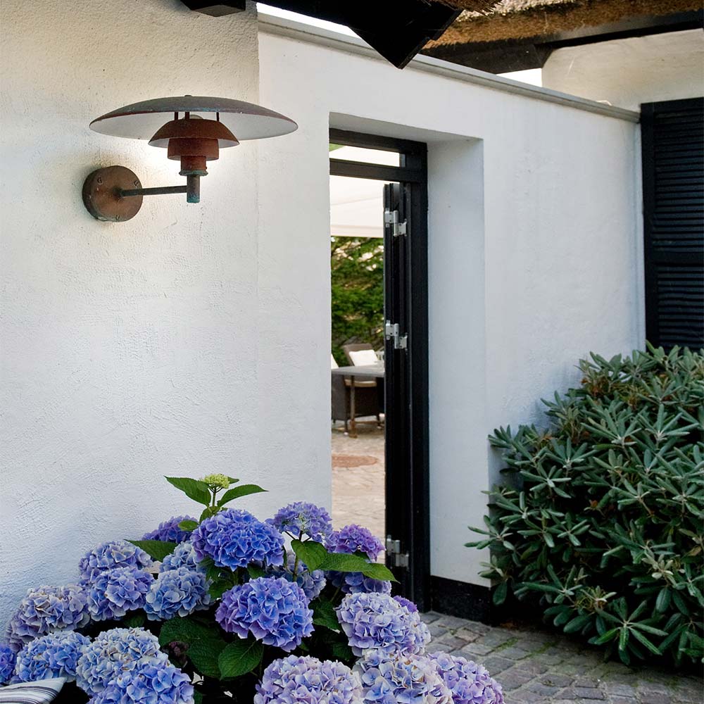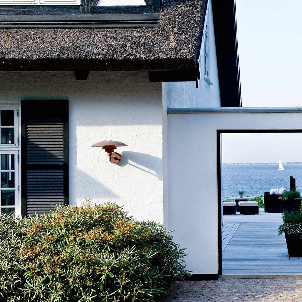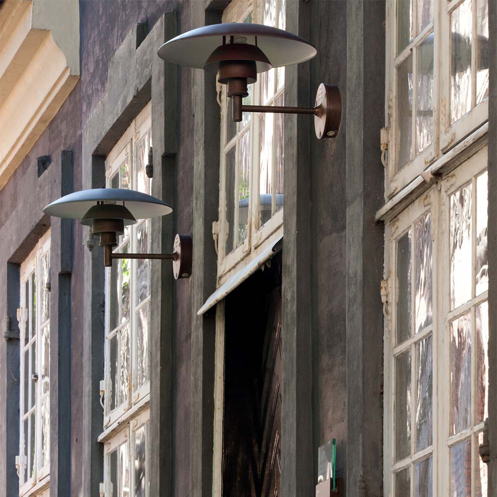 Brushed copper creates a vintage ambiance that radiates warmth for the PH Outdoor Wall Light from Louis Poulsen. A trio of domed layers diffuse illumination and cast a downward glow, ideal for setting the tone in your elegant home or workspace. Undersides are painted in matte white to create beautiful illumination.