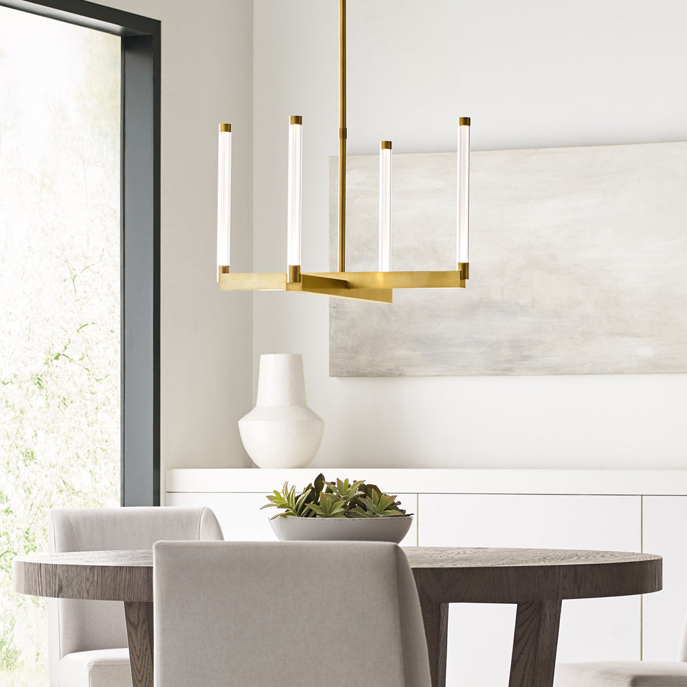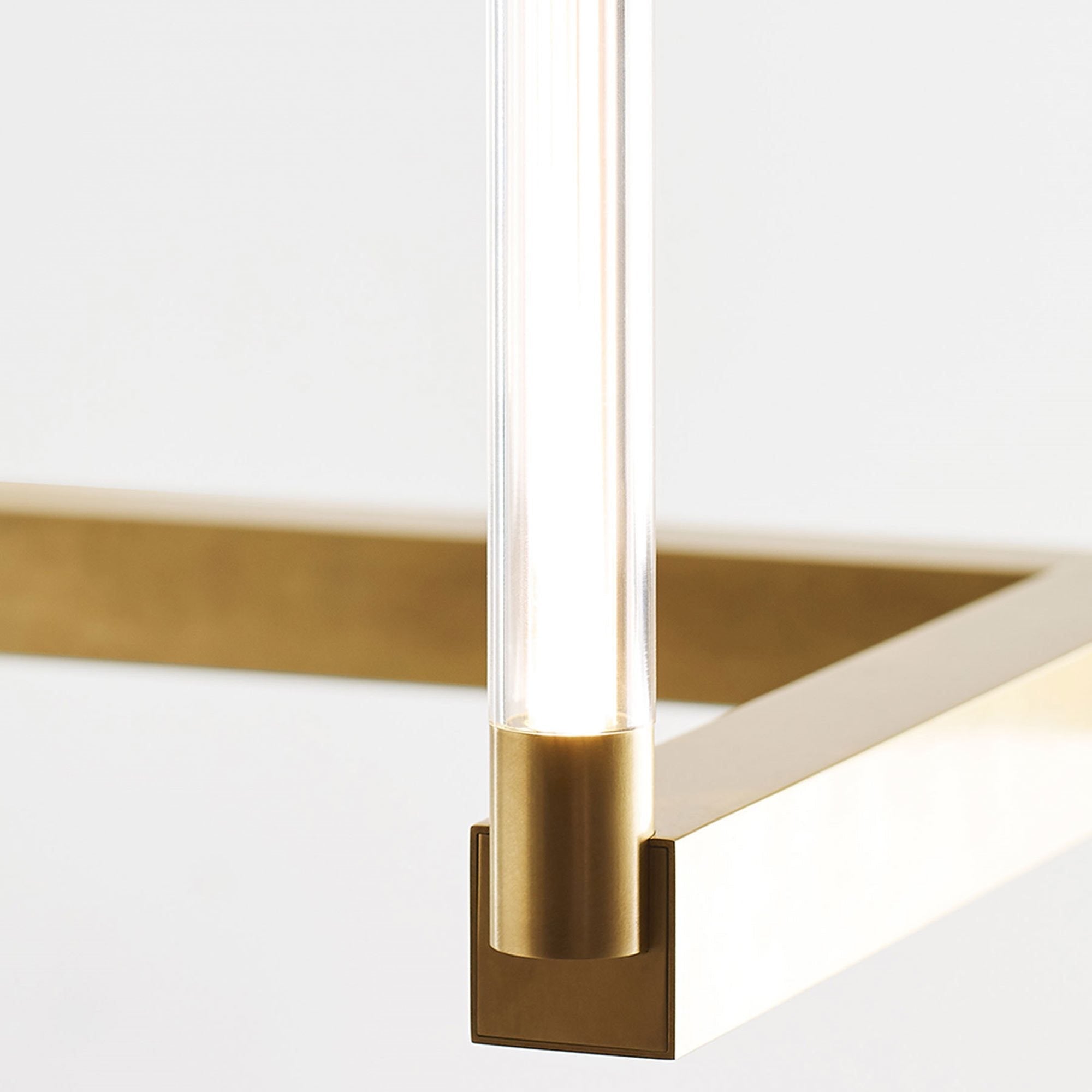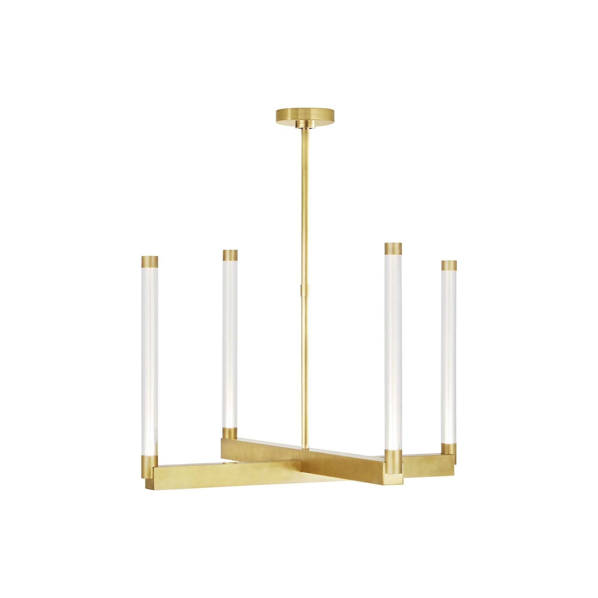 The Phobos LED Chandelier by Kelly Wearstler for Visual Comfort Modern exceptionally contemplates clean intersecting forms and the purity of tubular light in a modern dialogue of geometries. Radial and rectilinear landscapes create a sculptural world for customized LED lamping that features a a central light-guide for a fully diffused glow.