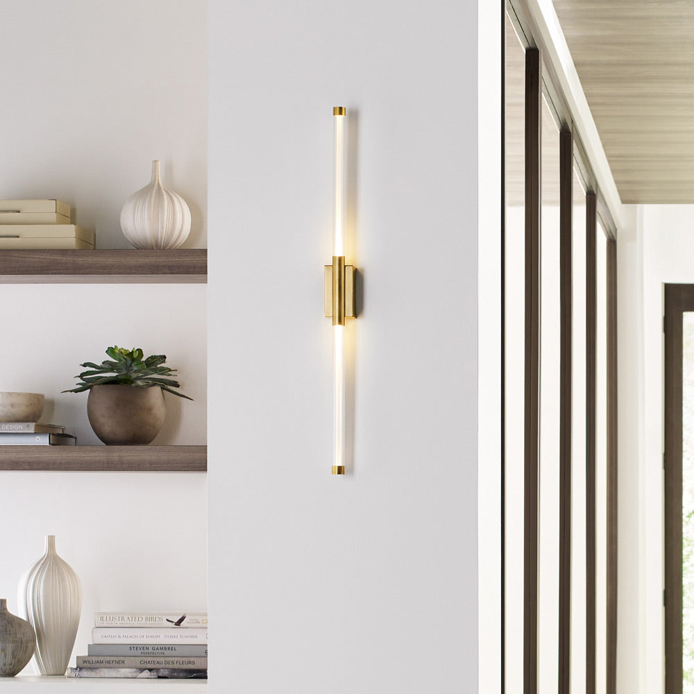 The Phobos LED Vanity Wall Light from Visual Comfort Modern exceptionally contemplates clean intersecting forms and the purity of tubular light in a modern dialogue of geometries. Radial and rectilinear landscapes create a sculptural world for customized LED lamping that features a central light-guide channeling for a fully diffused glow.