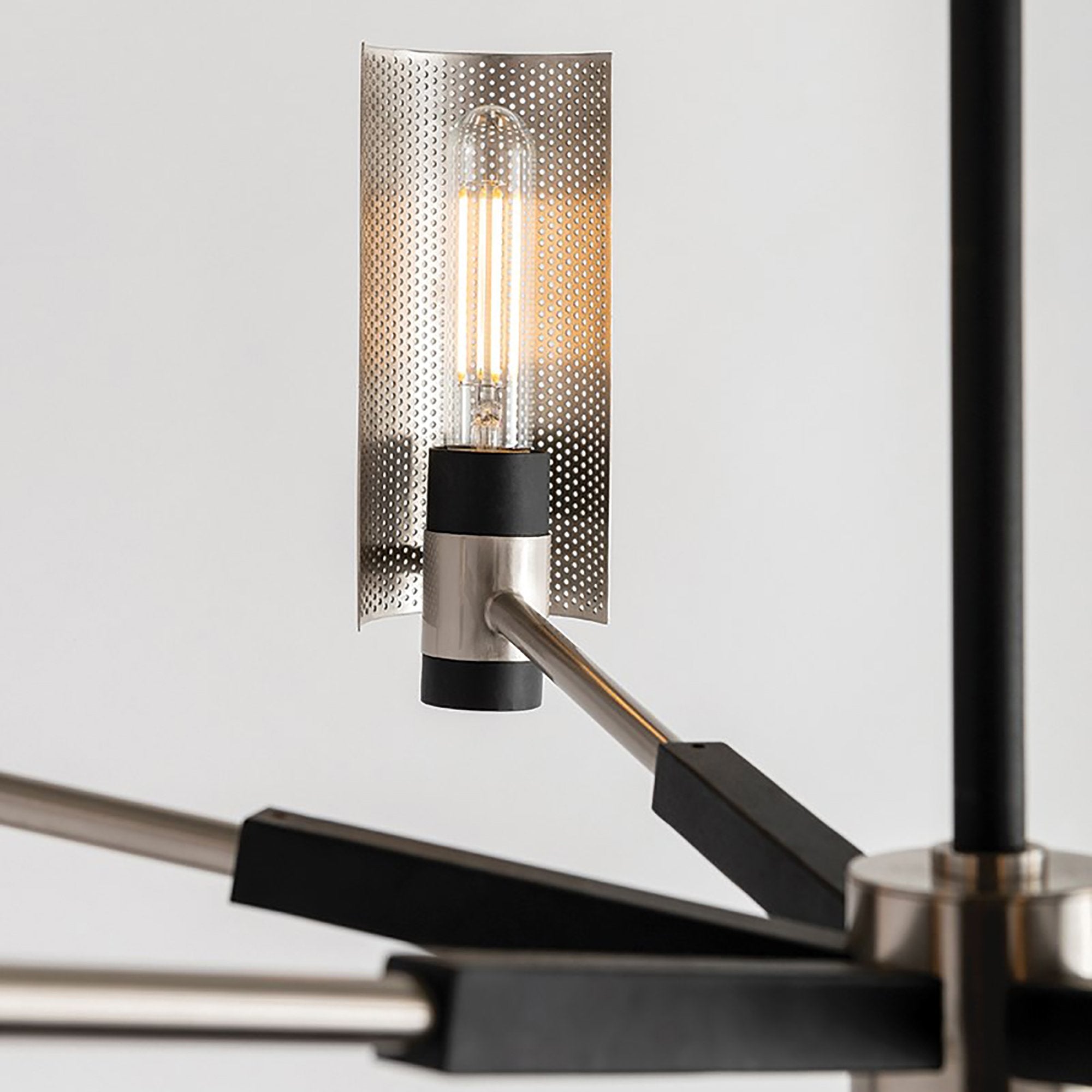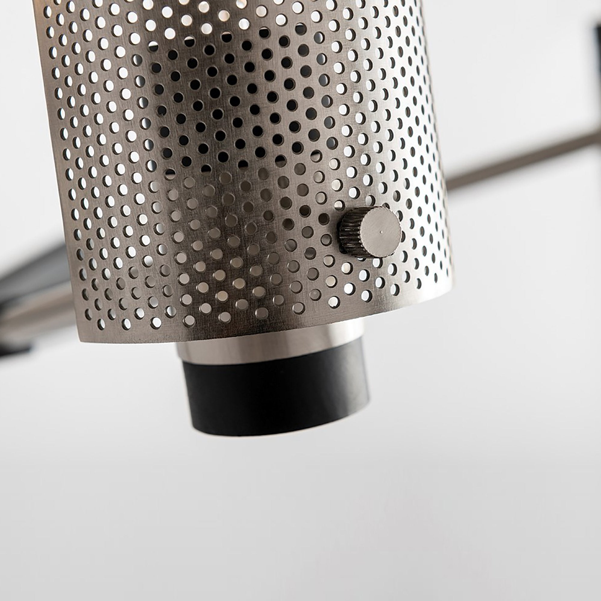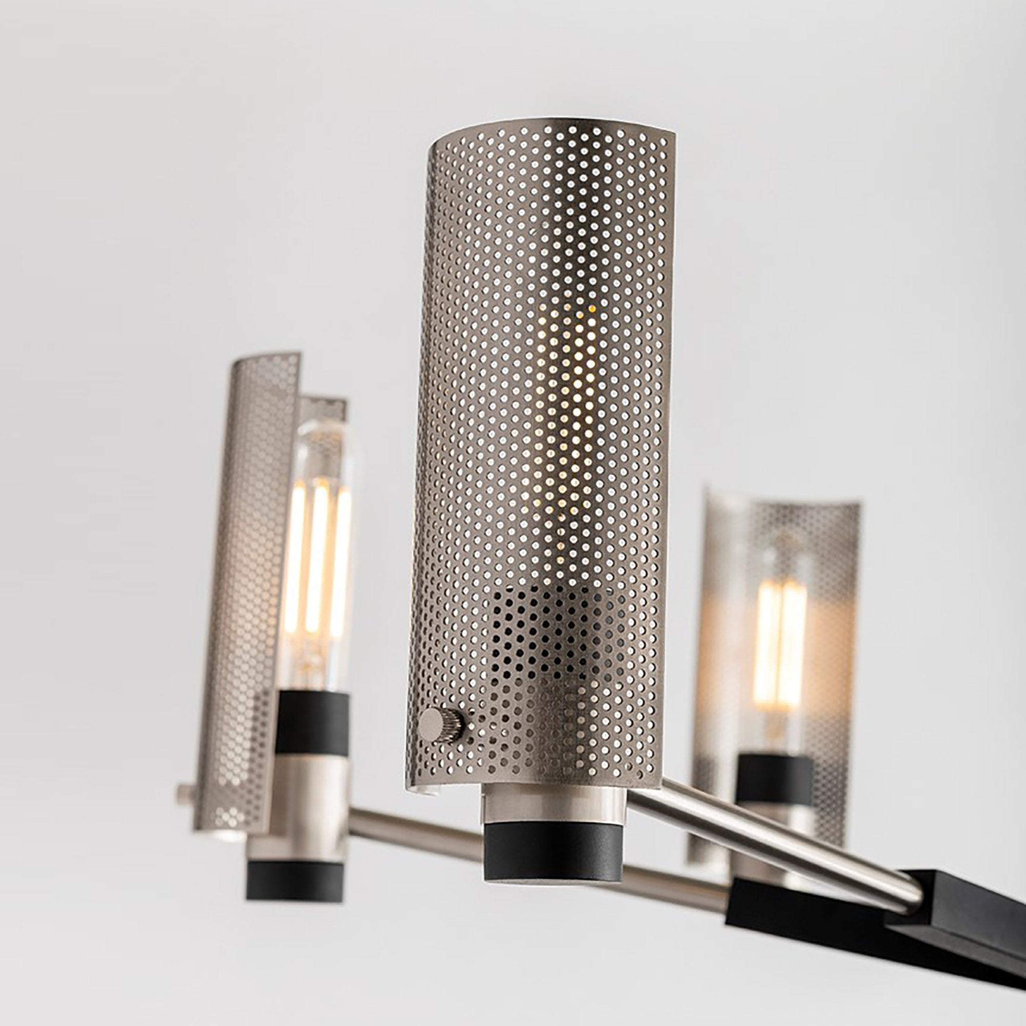 Cylinder shades crafted of mesh metal cling to angled metal rods, as medium bulb mounts shed illumination fitting of a transitional custom space in the Pilsen Chandelier from Troy Lighting.