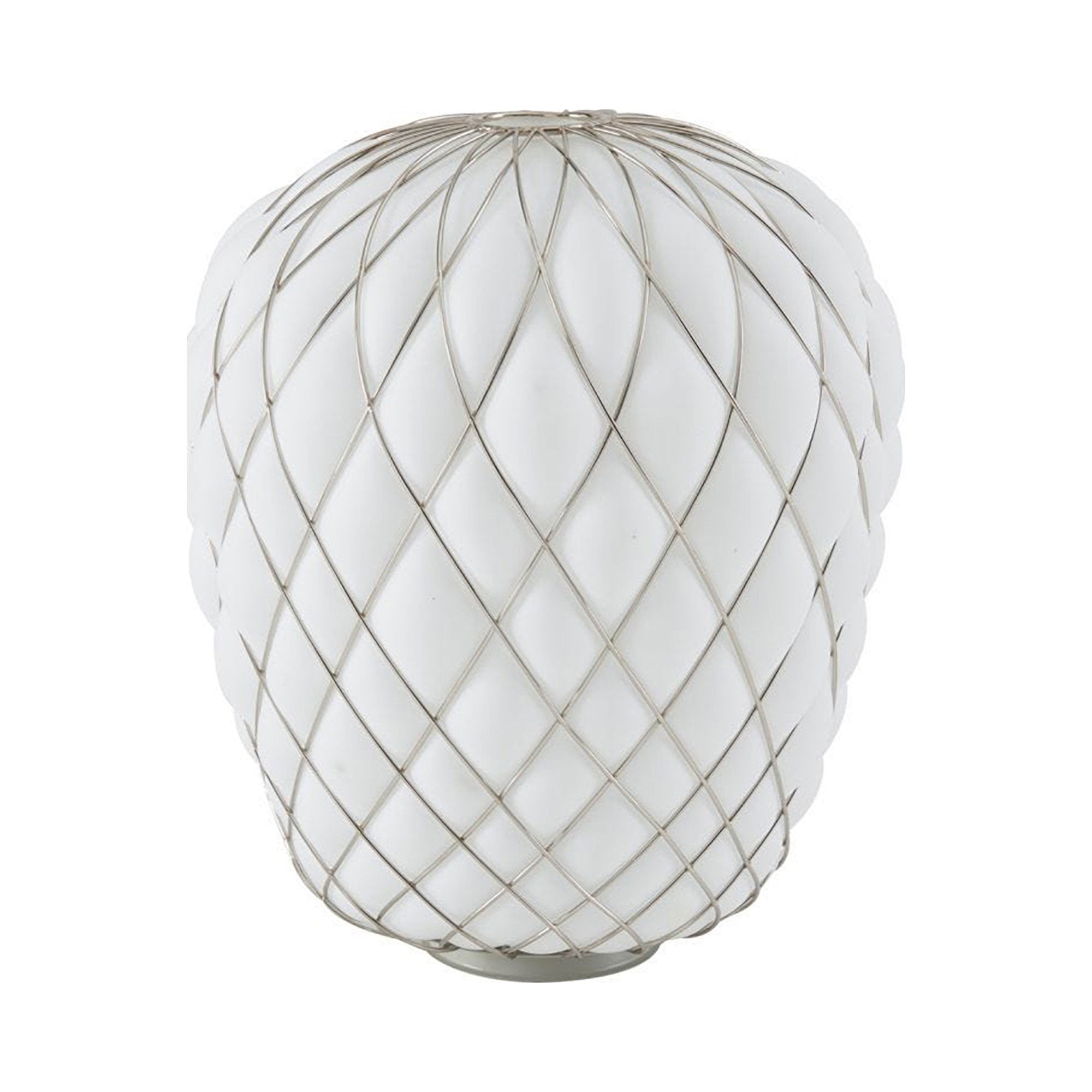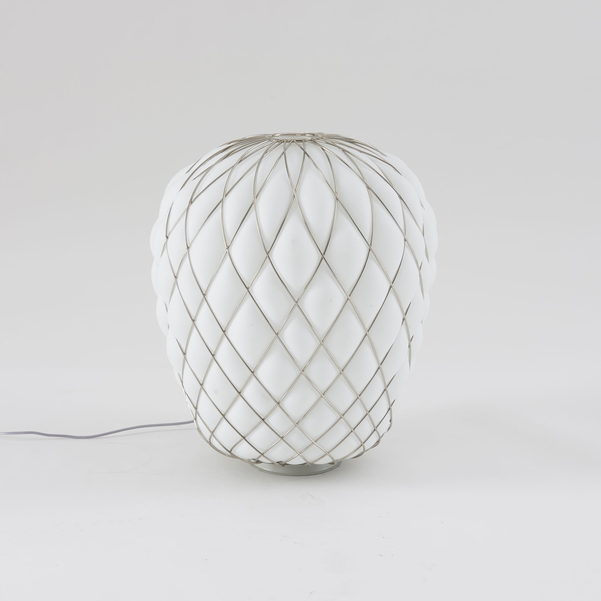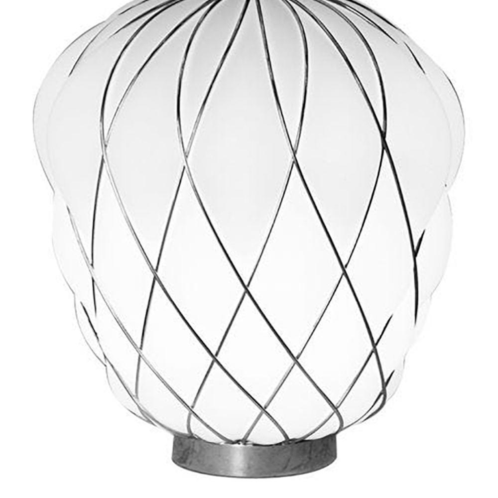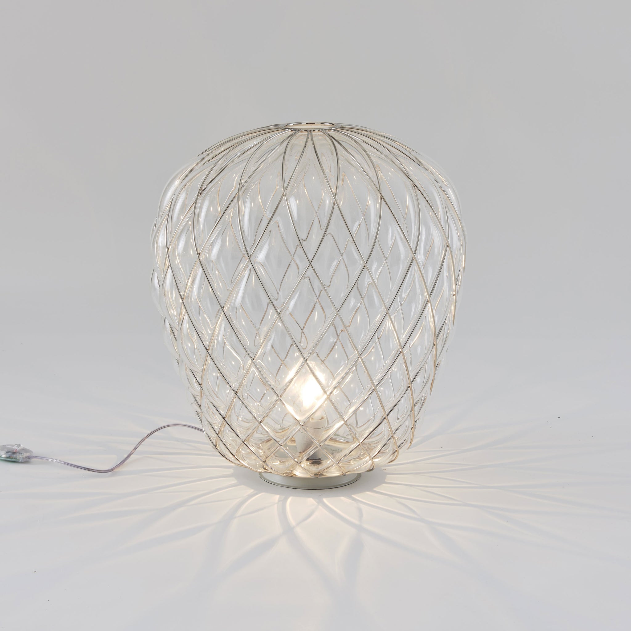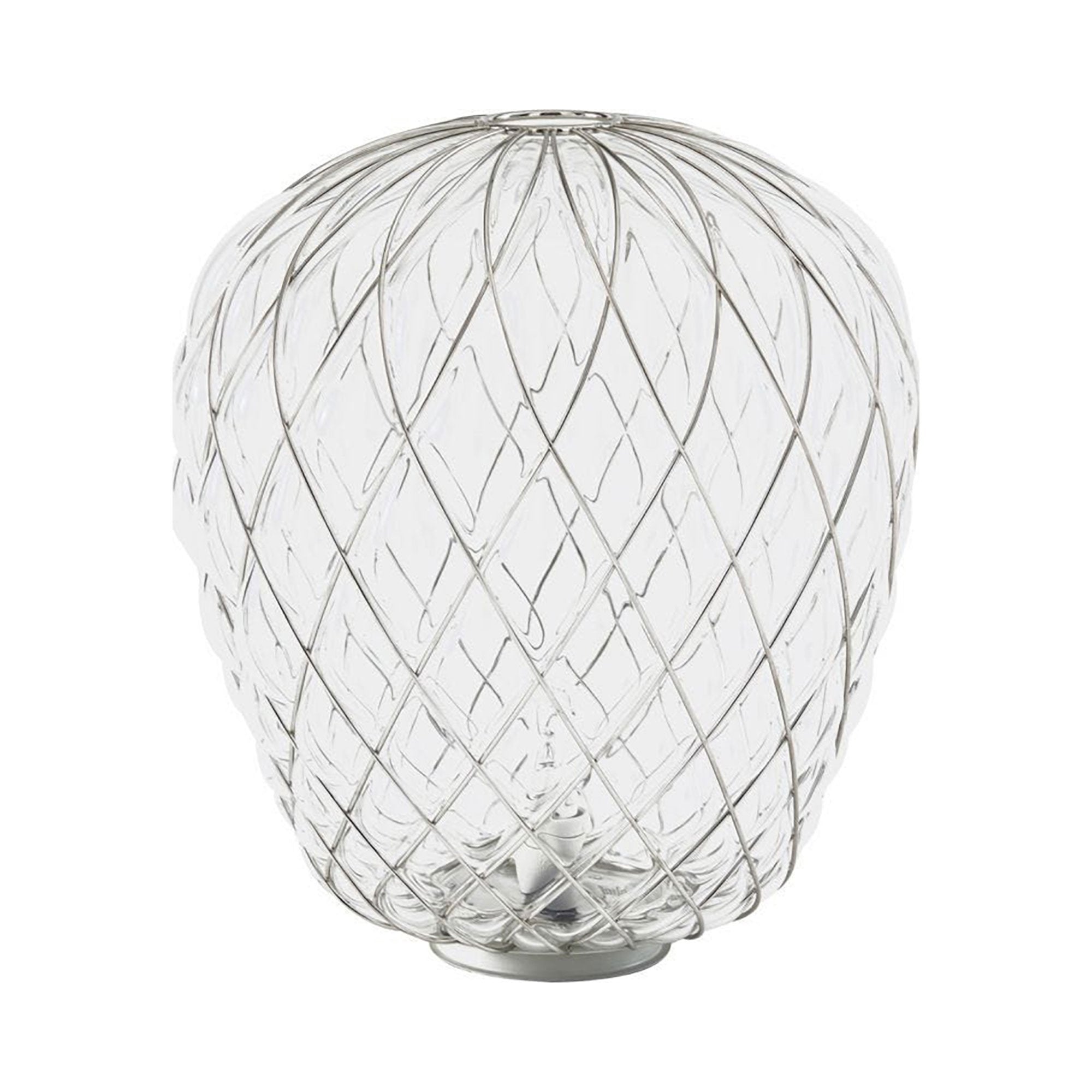Pinecone is a suspension and table lamp. The diffuser is manufactured using the ancient caged blown glass technique: the glass maker blows the molten glass blob into a metal cage, which only partly contains the blob's natural expansion. In this way, the glass surface is partly trapped by and partly escapes the cage, generating an impression of tension as the object struggles to free itself from its harness; the cage is further enriched by the galvanic treatment that makes it look glossy and brilliant. The transparent version, in particular, reveals a two-fold structure that multiplies the scenic effect, while the metal cage pattern projects kaleidoscopic shade effects on the surrounding surfaces. On the contrary, in the white version the glass delicately envelops the cage surface and enhances its geometric pattern, generating an elegant and visually pleasing diffused light. The lighting fixture makes a highly appealing and striking impact either switched on or off.