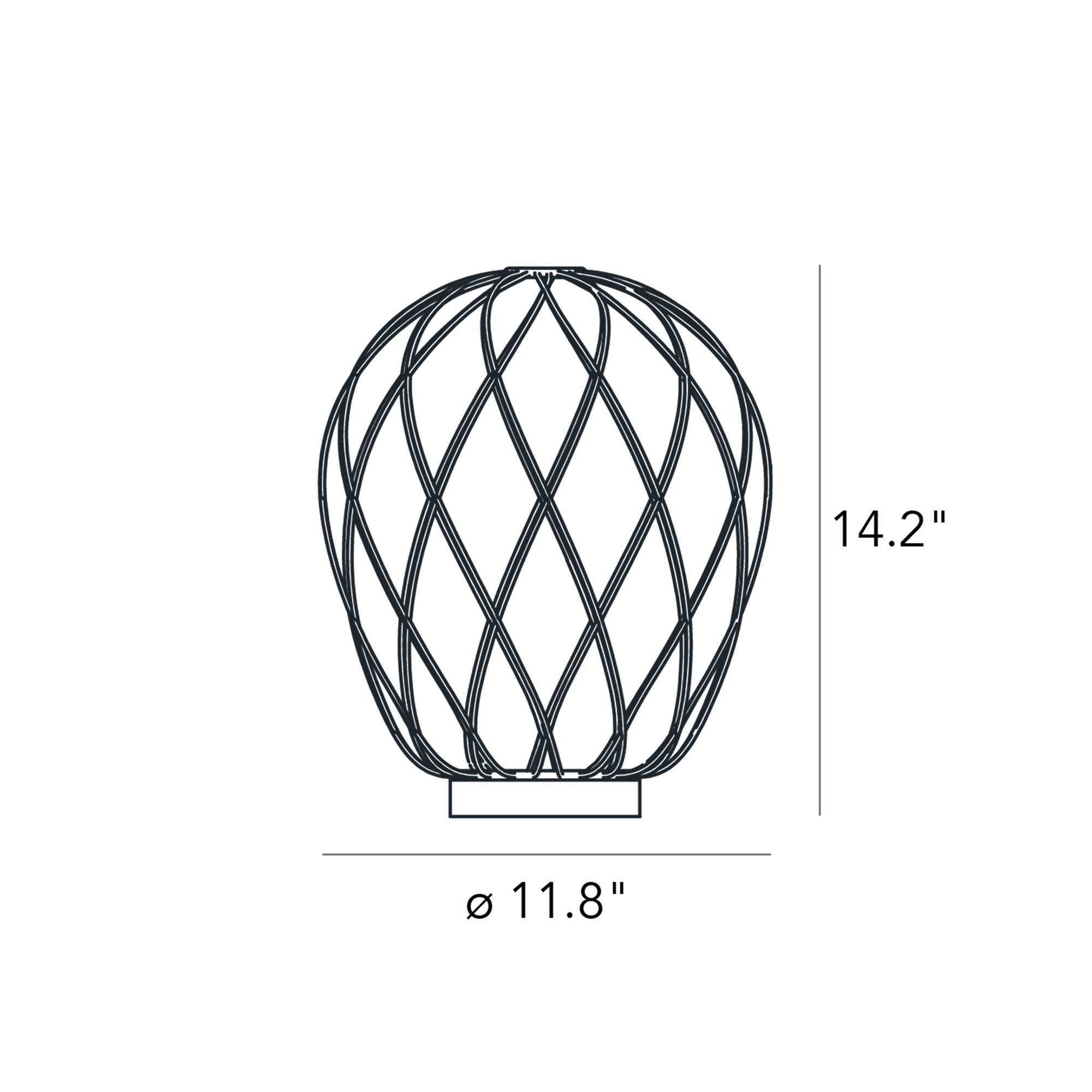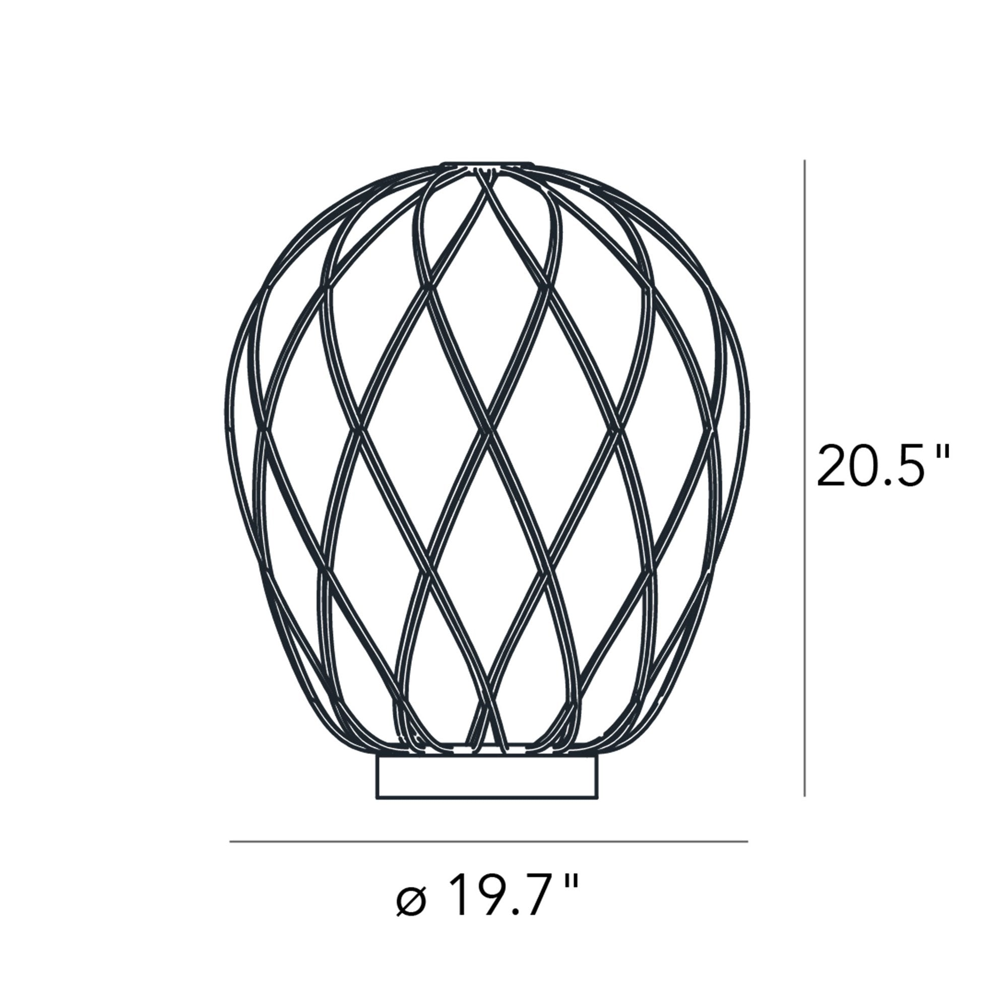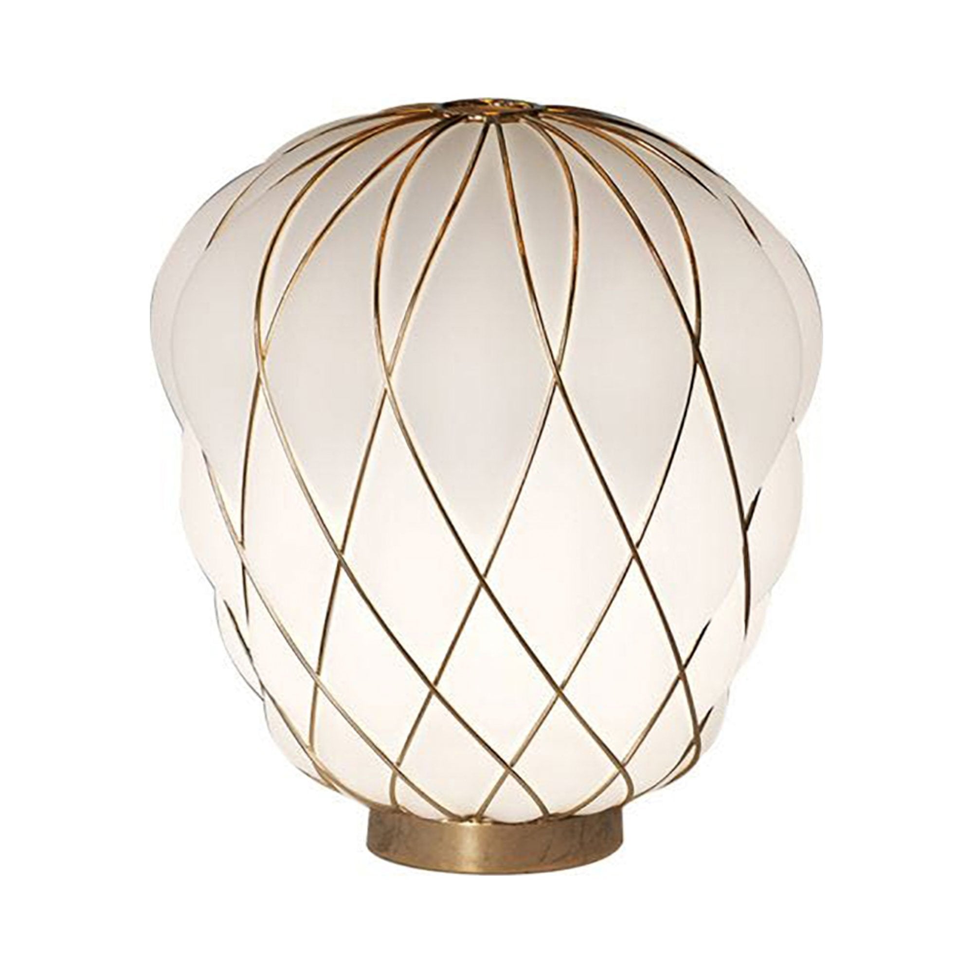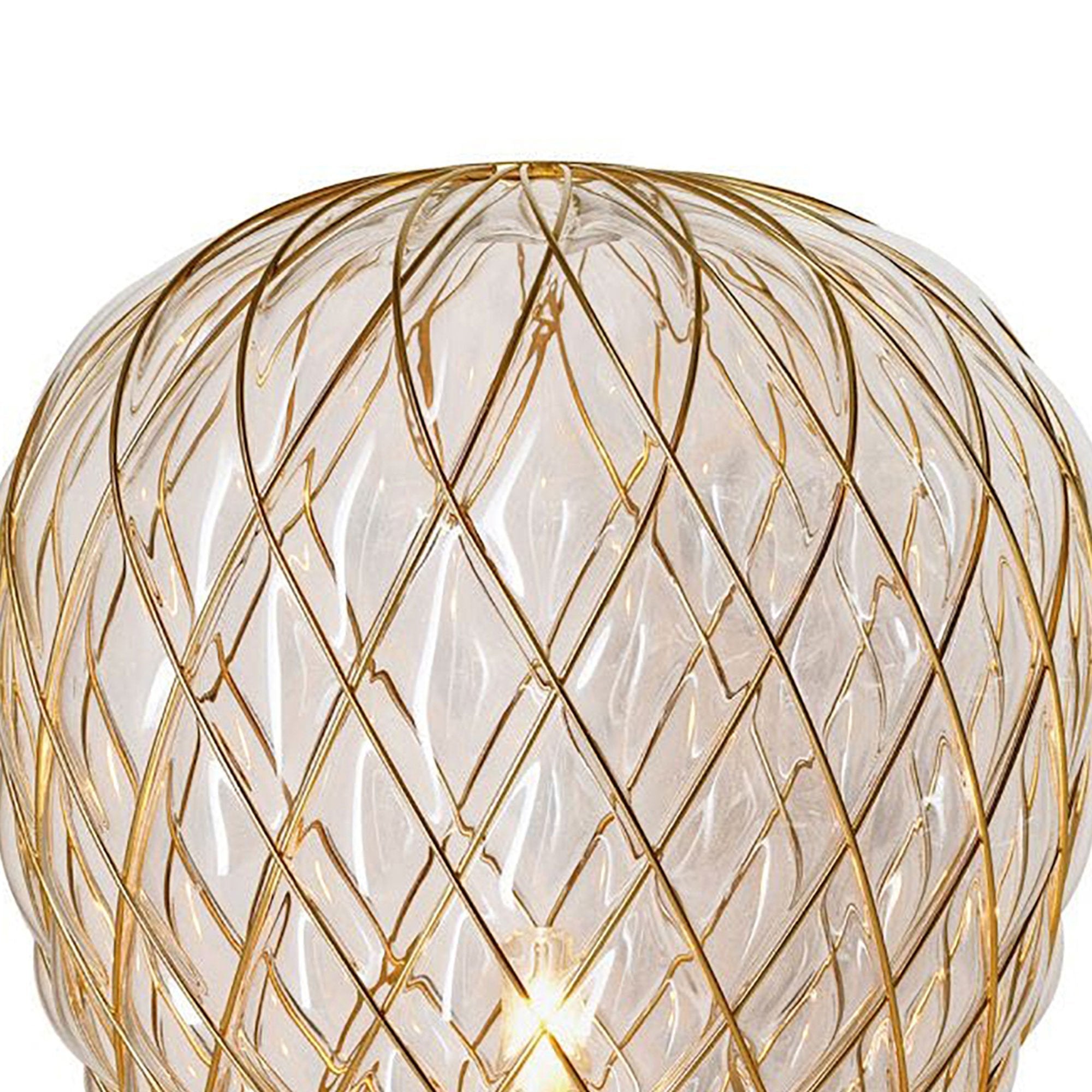 Pinecone is a suspension and table lamp. The diffuser is manufactured using the ancient caged blown glass technique: the glass maker blows the molten glass blob into a metal cage, which only partly contains the blob's natural expansion. In this way, the glass surface is partly trapped by and partly escapes the cage, generating an impression of tension as the object struggles to free itself from its harness; the cage is further enriched by the galvanic treatment that makes it look glossy and brilliant. The transparent version, in particular, reveals a two-fold structure that multiplies the scenic effect, while the metal cage pattern projects kaleidoscopic shade effects on the surrounding surfaces. On the contrary, in the white version the glass delicately envelops the cage surface and enhances its geometric pattern, generating an elegant and visually pleasing diffused light. The lighting fixture makes a highly appealing and striking impact either switched on or off.