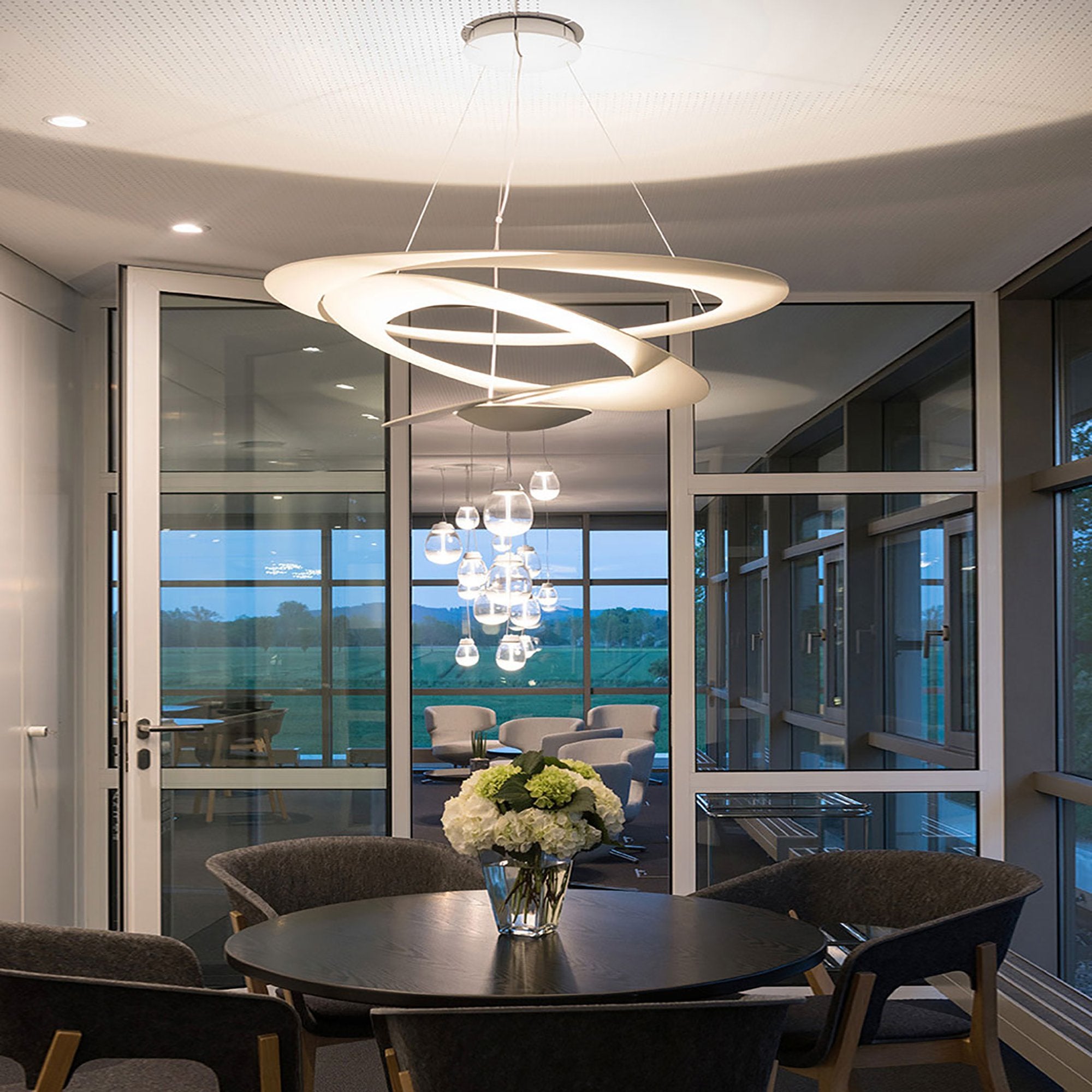 An ultra-modern, spiraling ribbon of light, the Pirce LED Suspension Light from Artemide is a dynamic addition in an entry, dining room or living area.