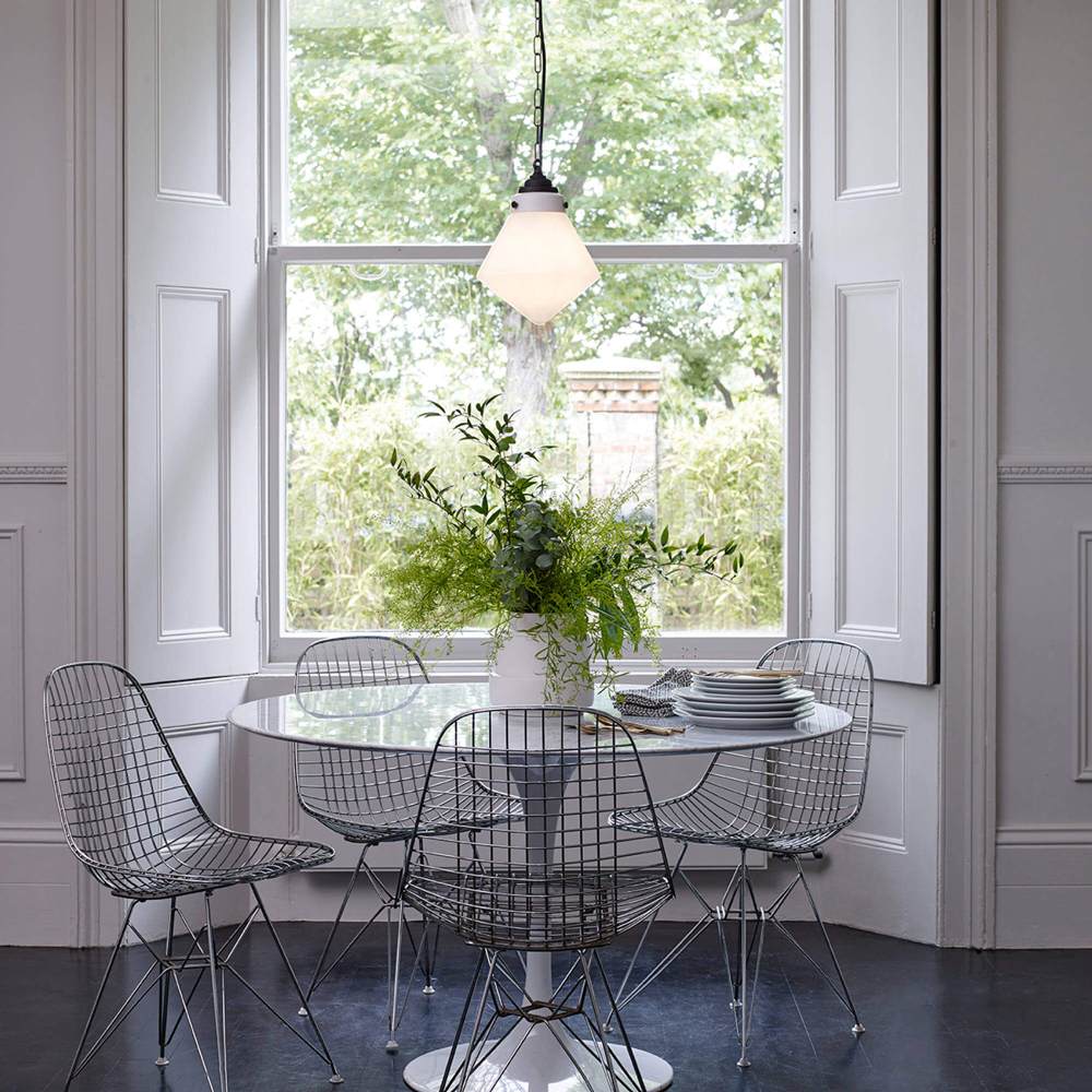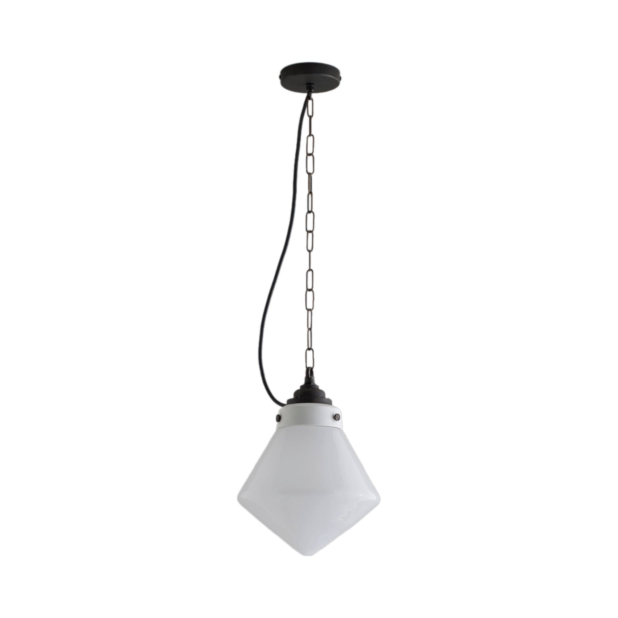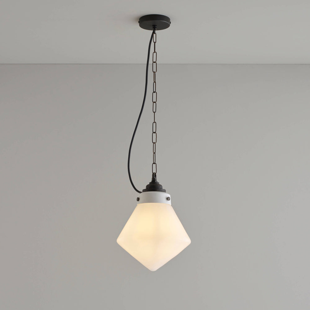 Shaping takes priority with a light fixture offering a timeless look ideal for casual spaces. Point Pendant Light from Original BTC headlines with a catchy hand-blown opal glass shade adopting geometric angles, compelling and energetic. Weathered bronze metal and chain link suspension elevates its level of iconic design standards.