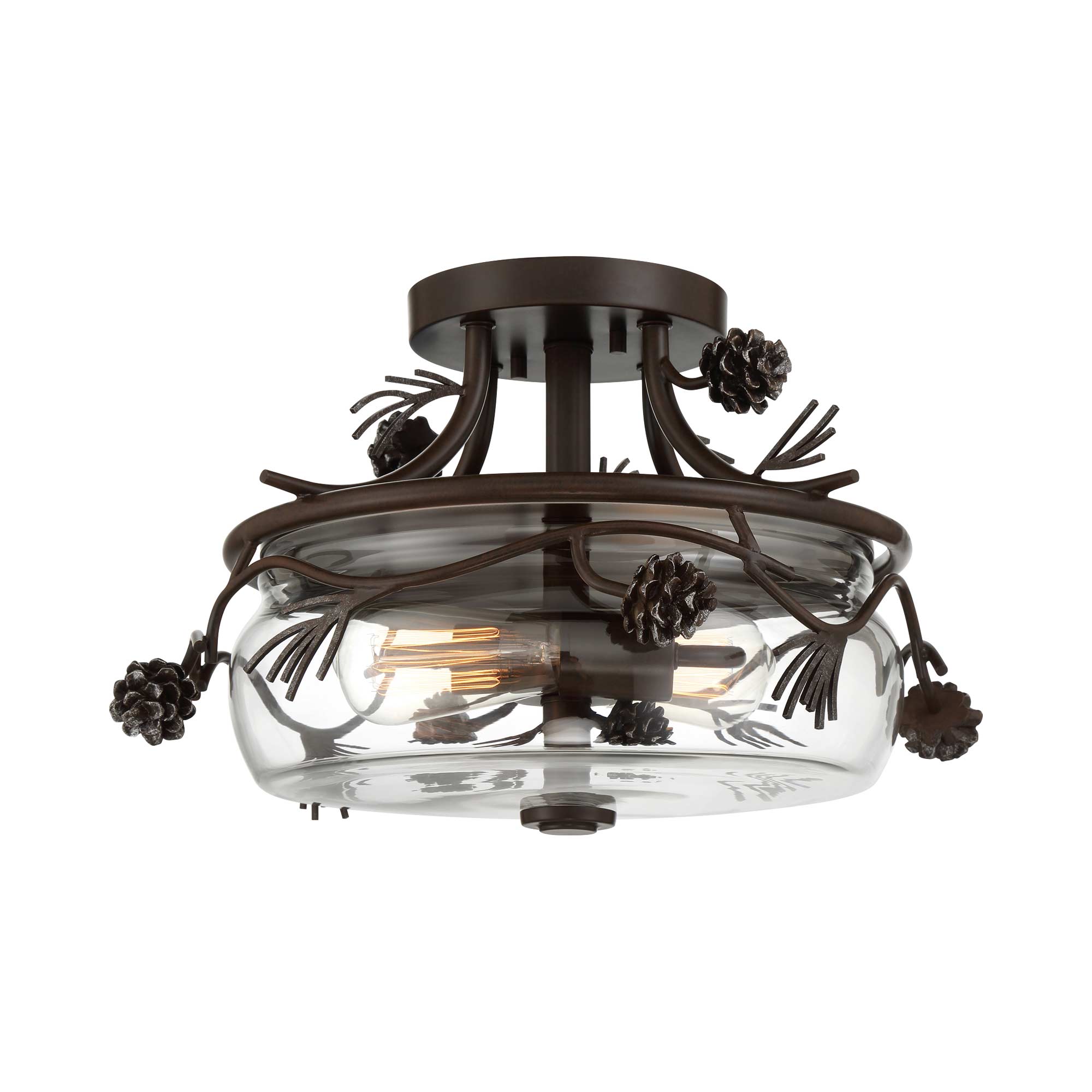 Rustic weathered spruce finish metal receives chic silver highlights as the Ponderosa Ridge Outdoor Semi Flush Mount Ceiling Light from Minka Lavery presents an eye-catching look in fixture framing. Embellished with ornate pine tree elements, its botanical feel is notable and stylish, bringing a suitable forested look to a patio, gazebo, or screened in porch. Clear glass creates a decadent shade sending ambient lighting in several directions.