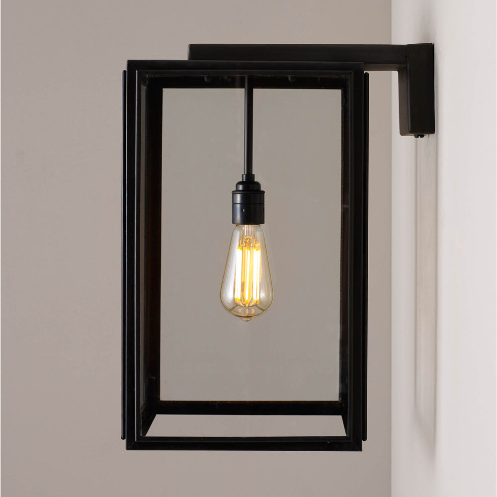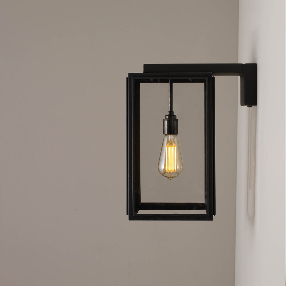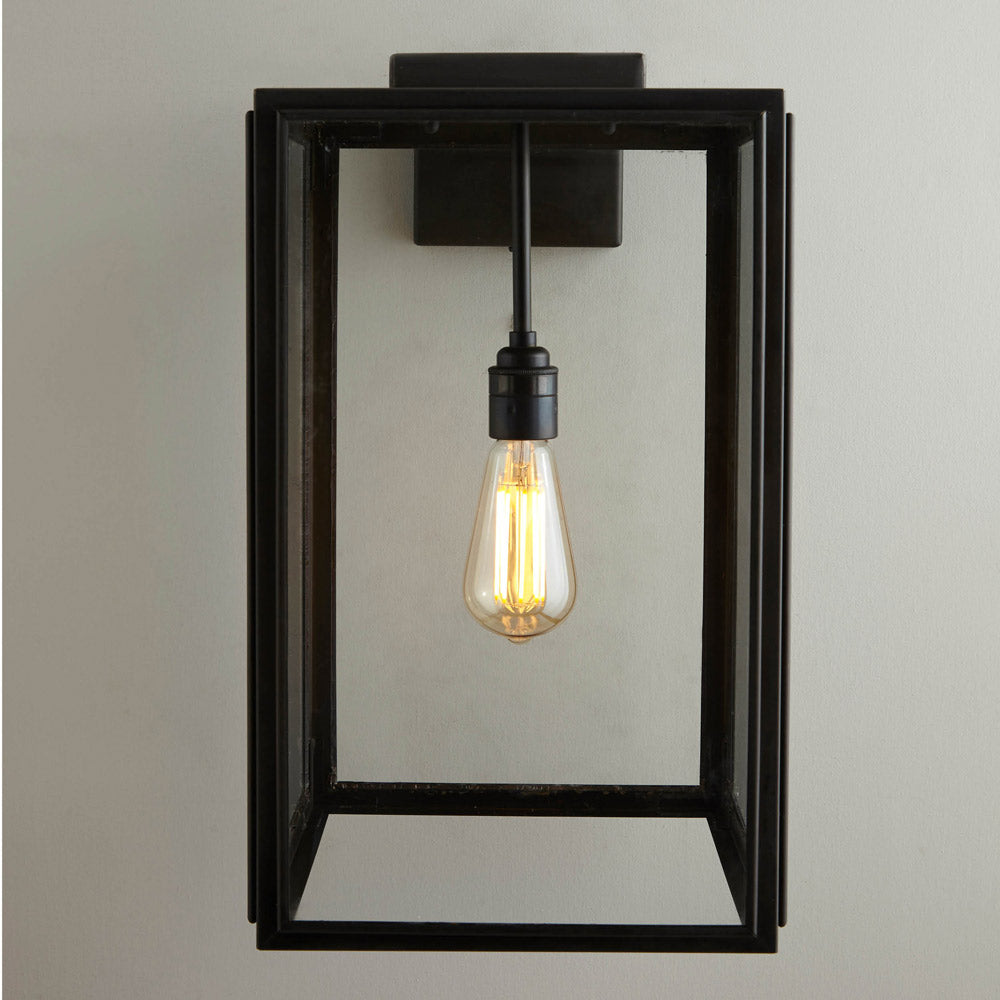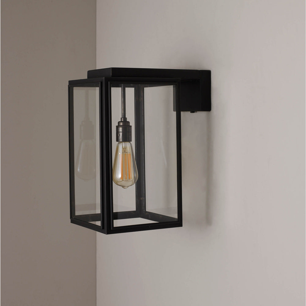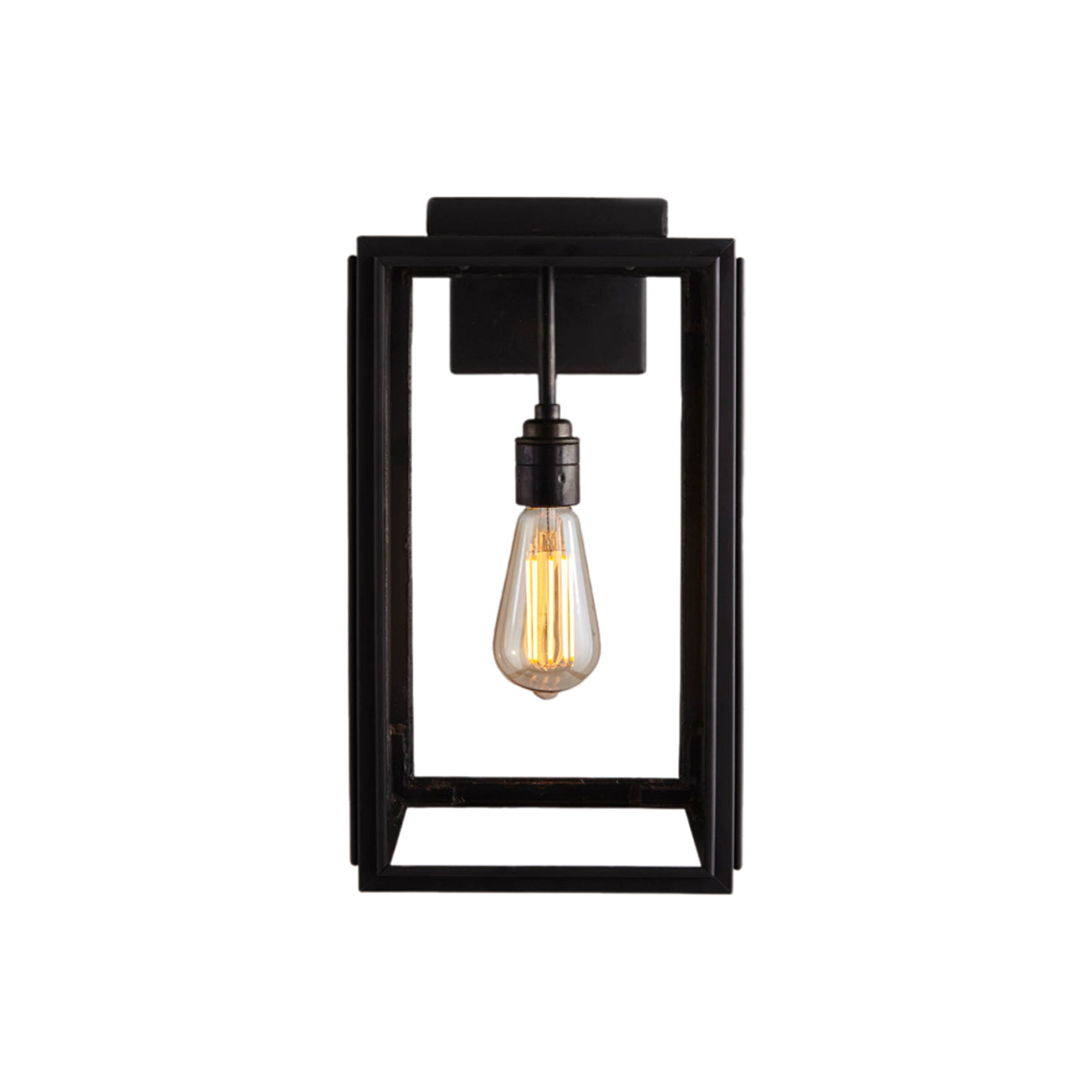 A beautifully boxy silhouette taps into lantern personality, updated with a crisp look and decadent palette. Weathered bronze metal forms a clean look to the Portico Outdoor Wall Light from Original BTC, welcoming guests to an exterior front or back structure. This light is compact enough to squeeze into tight spaces, with clear glass panels offering a full view of its exposed interior light.