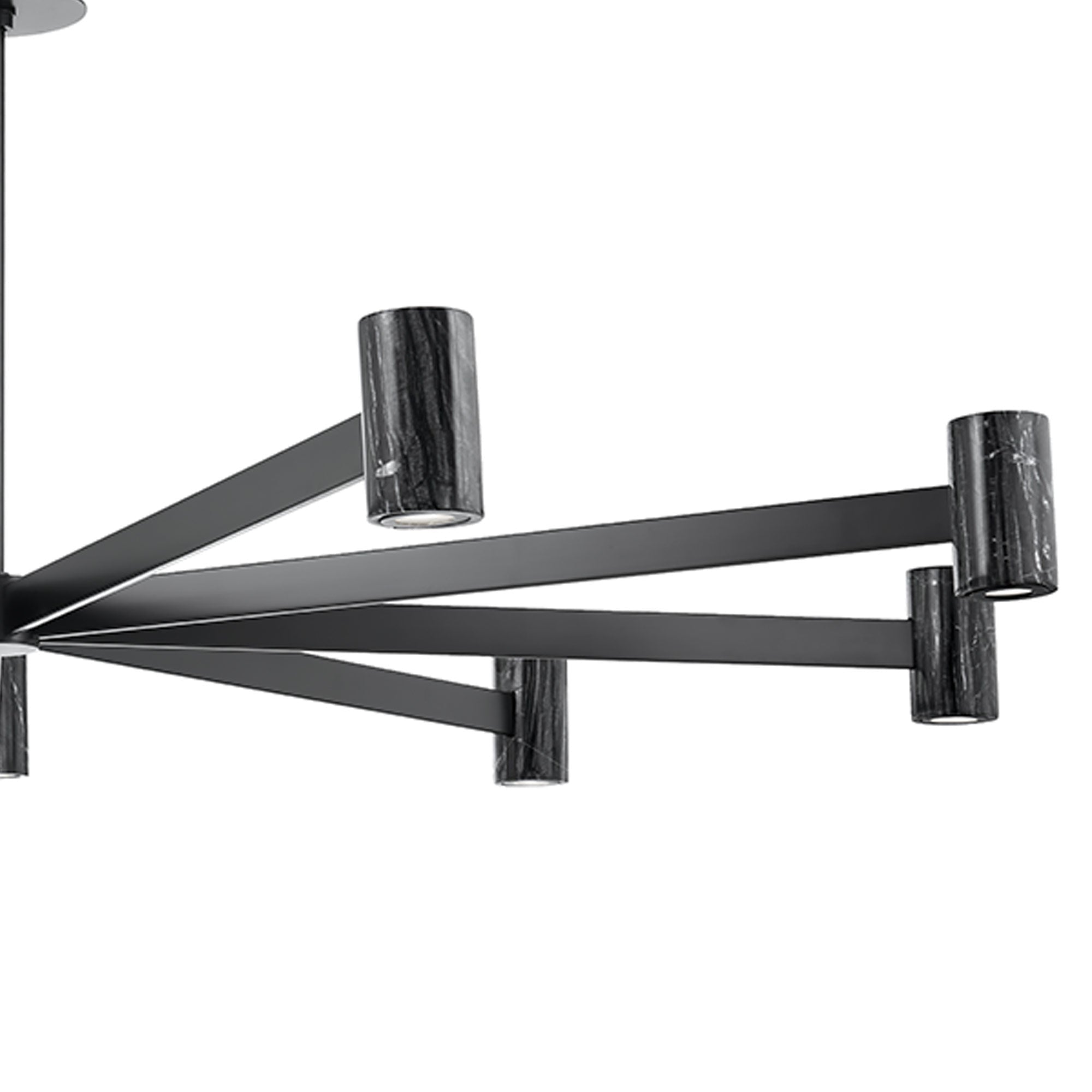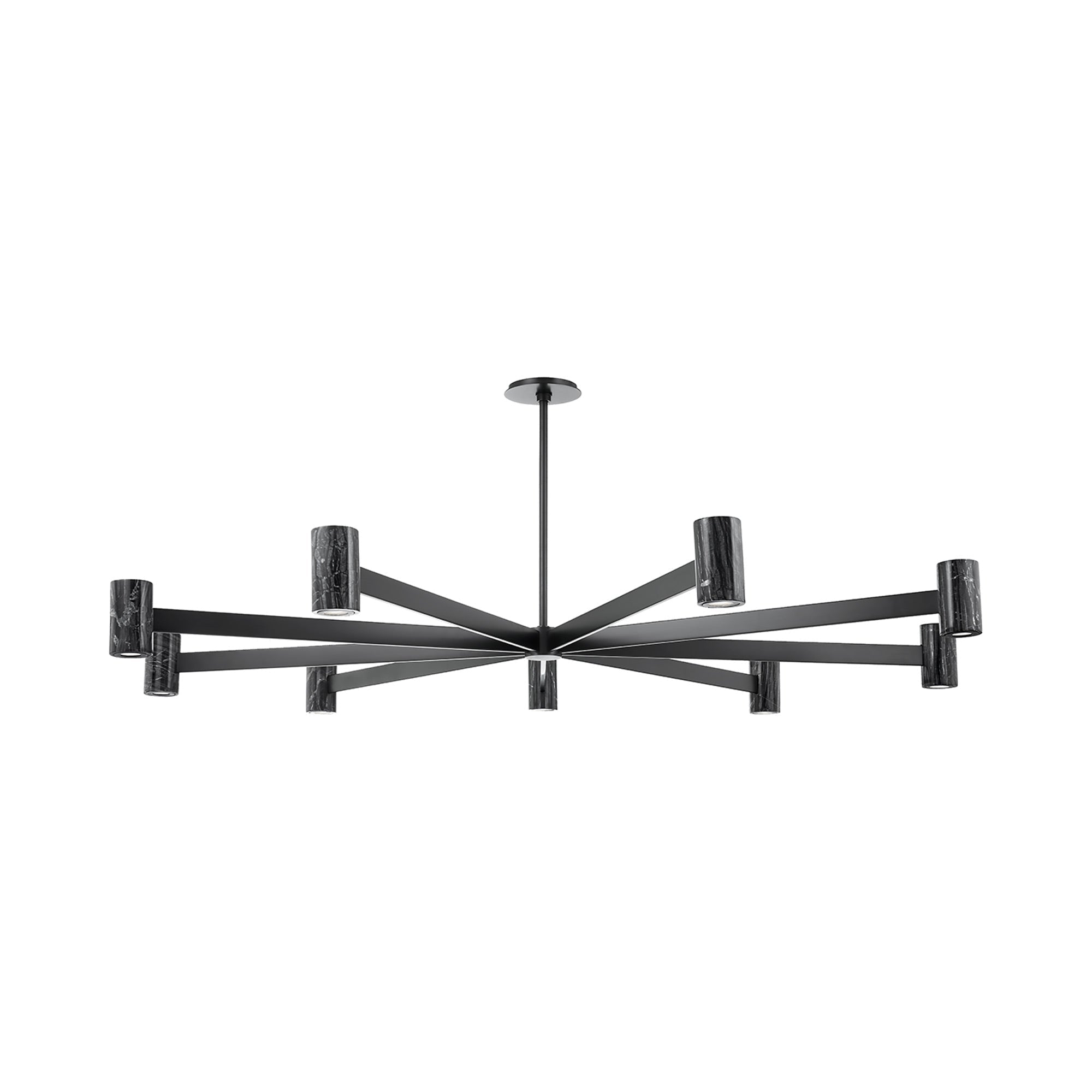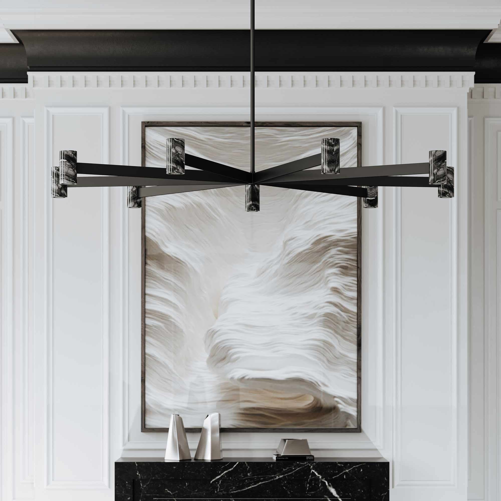 Stark linear styling offers industrial-inspired simplicity to a contemporary space, infusing energy-saving illumination from marble shades that stand out in the Predock LED Chandelier from Hudson Valley Lighting.