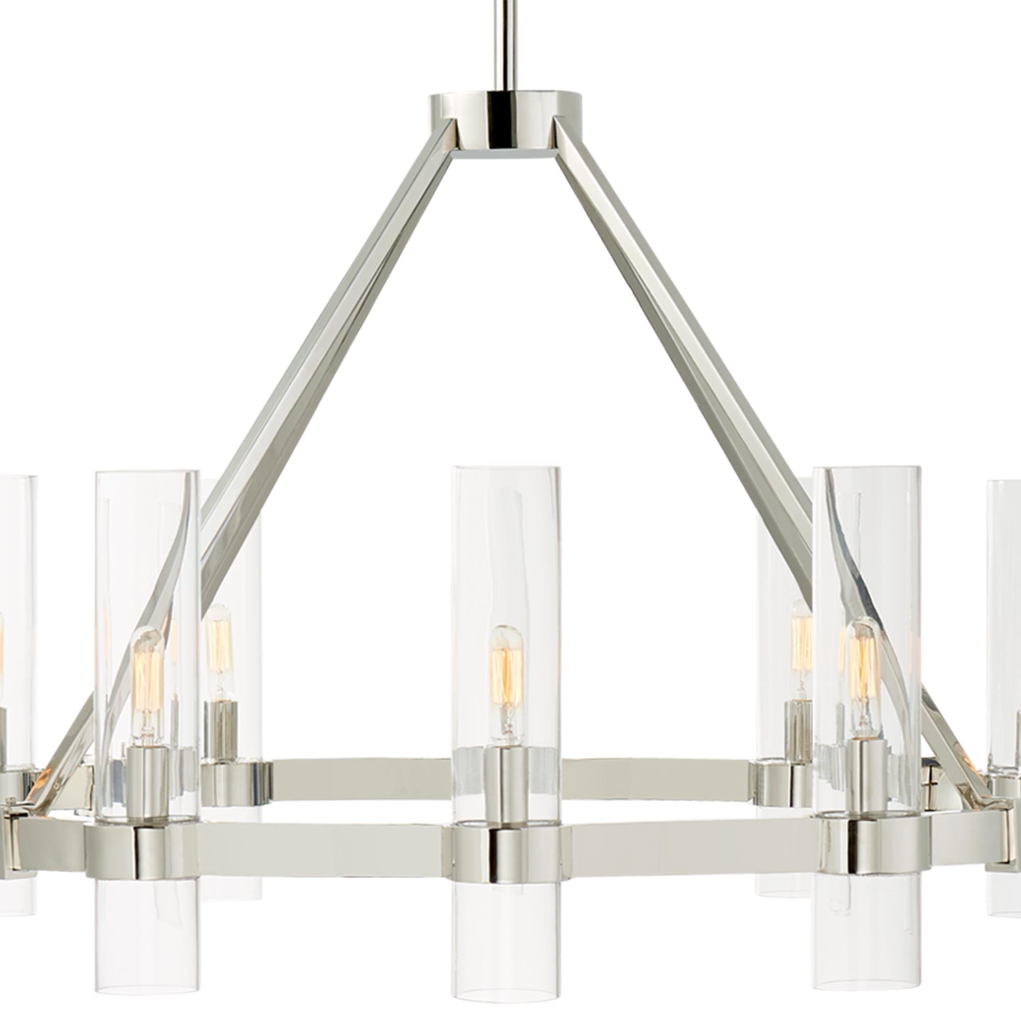 Towering cylinders of glass bring a sophisticated aura to the modern Presidio Chandelier from Visual Comfort Signature. A clean, simple ring frame and angular supports define the silhouette, which looks gorgeous over an entry or dining table.
