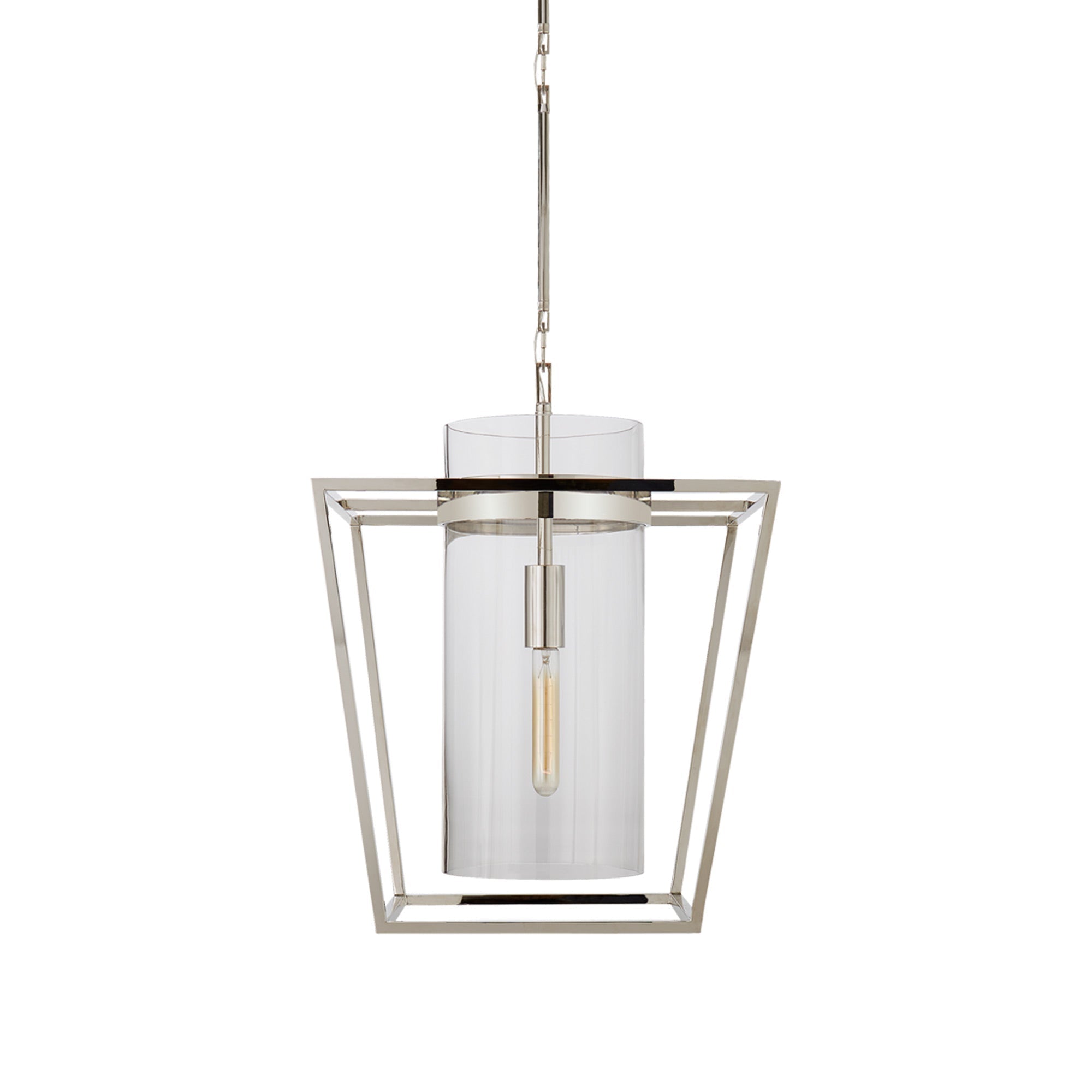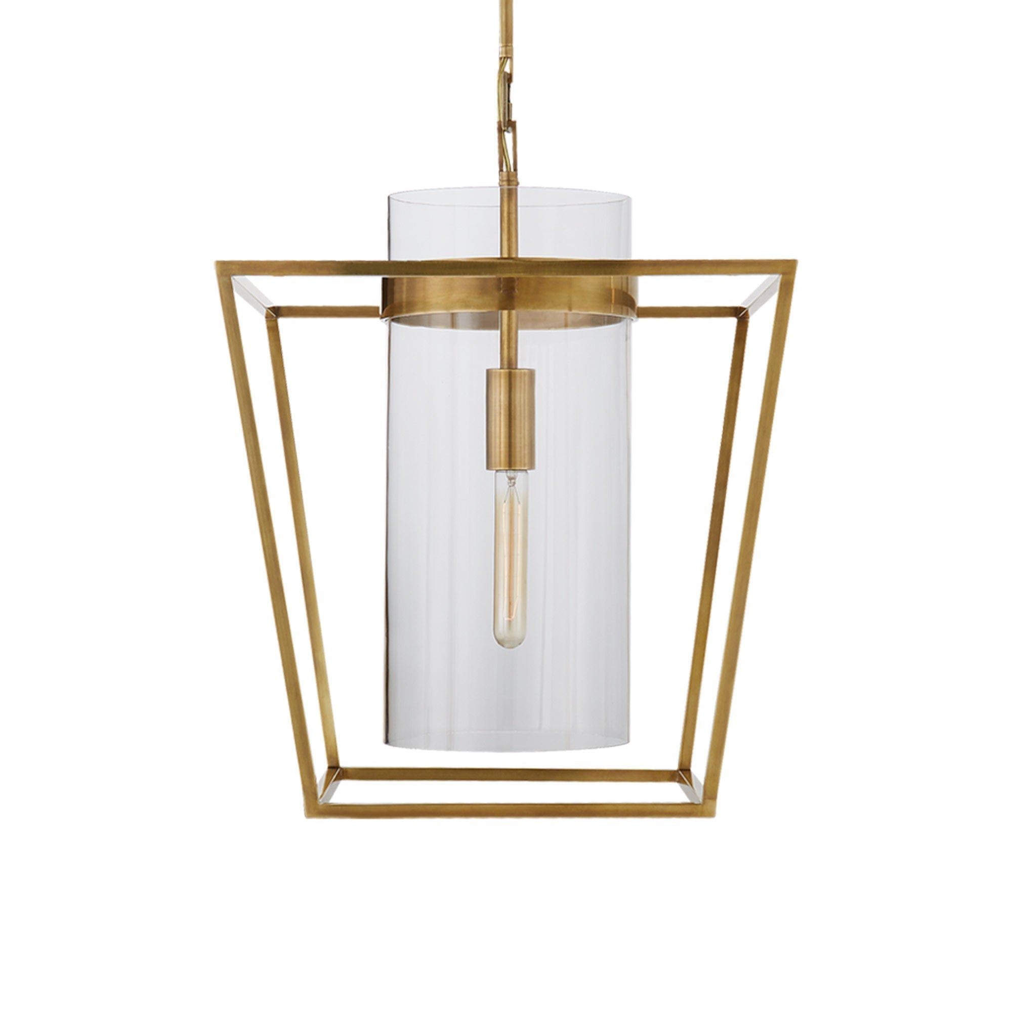 Curves and angles combine to sophisticated, earthy effect in the Presidio Small Lantern from Visual Comfort Signature. Dramatic in a kitchen, entry, or home office, this stellar pendant pairs an open trapezoidal frame with a cylindrical shade to create a lovely, layered effect.