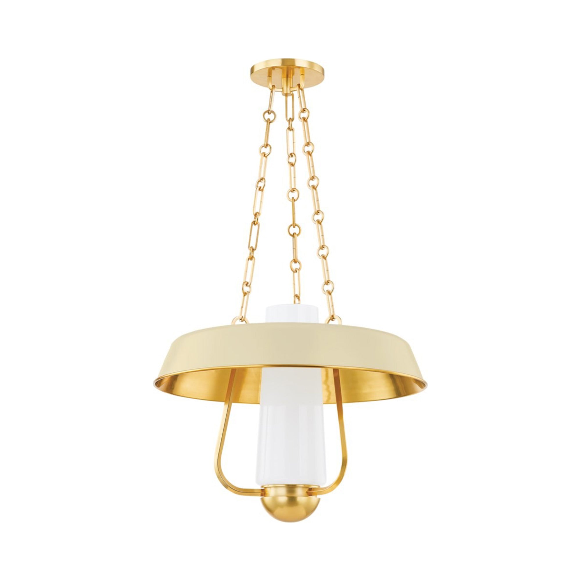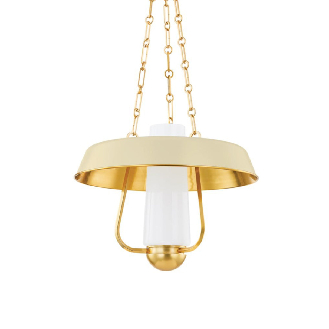 Indulgent deco vibes mesh with a light industrial motif to fashion a light fixture with limitless options for adding bold style. The Provincetown Pendant Light from Hudson Valley Lighting delivers an openwork hurricane silhouette, sleek and sophisticated, and fashioned of angular metal framing, as a slender inverted shade and large opal glossy glass tube mix up materials and aesthetics. A decorative metal cap and classic chain link suspension rounds out a host of copacetic elements.