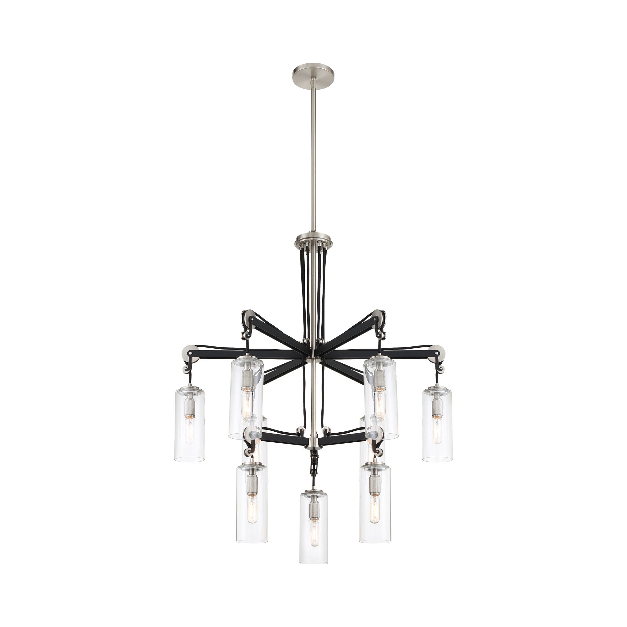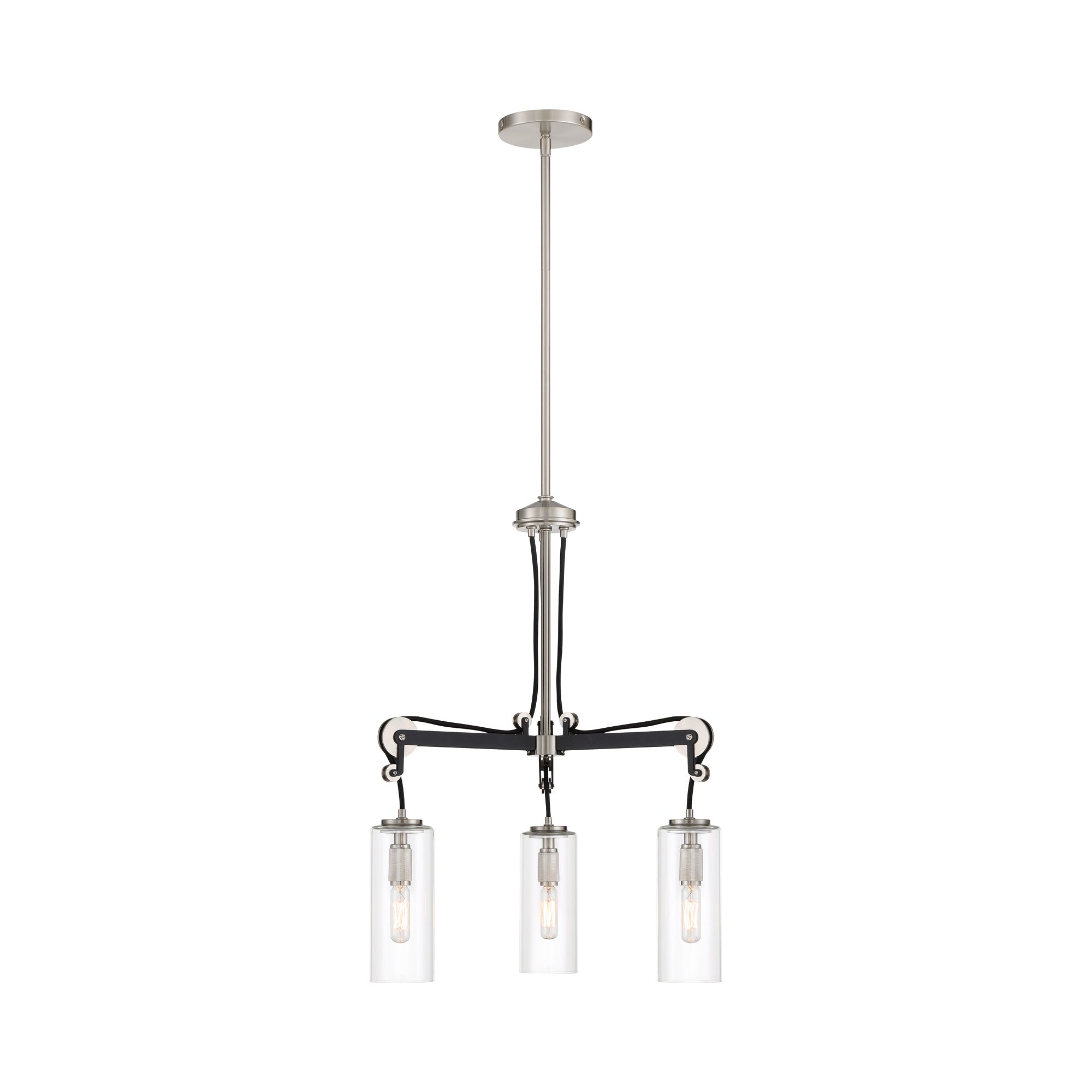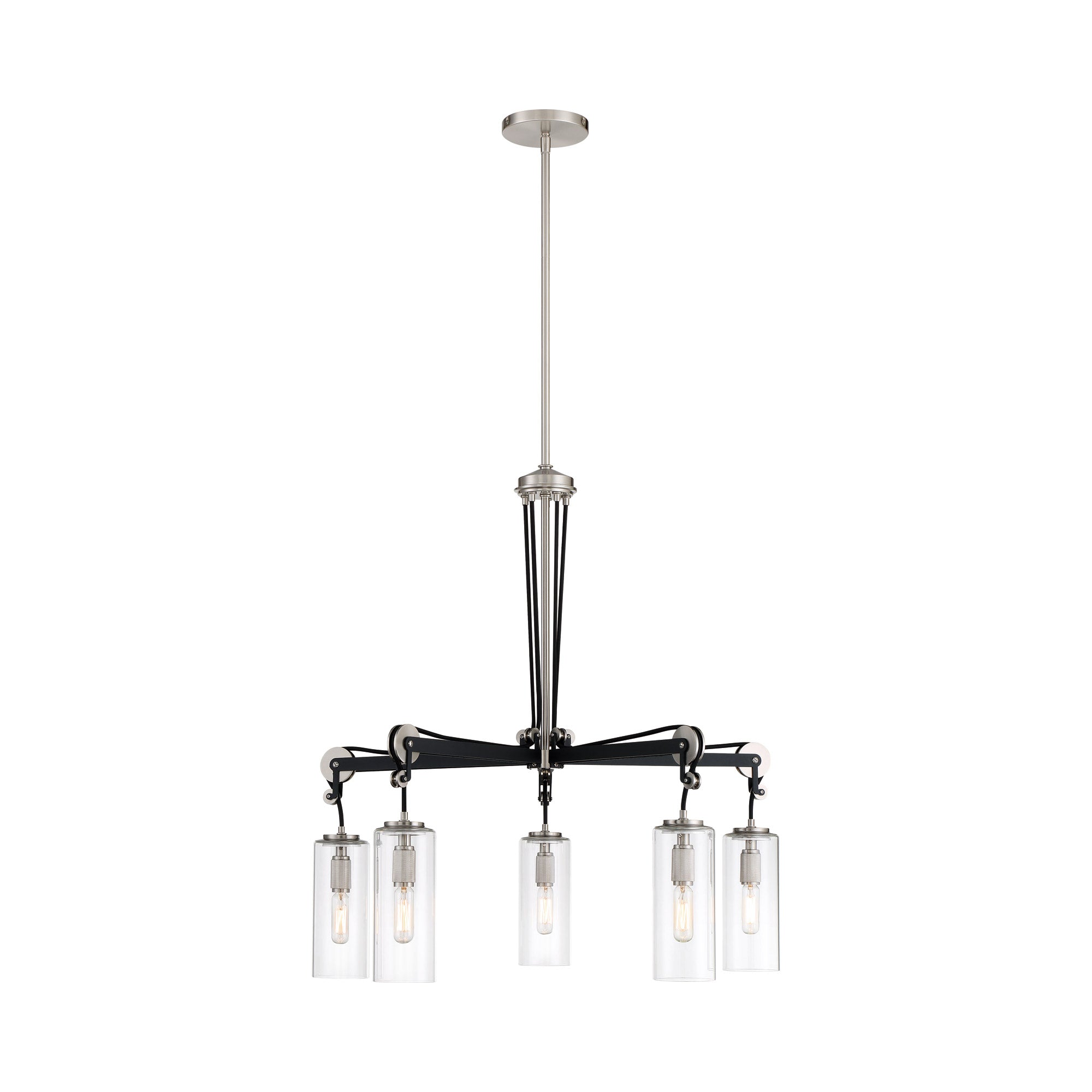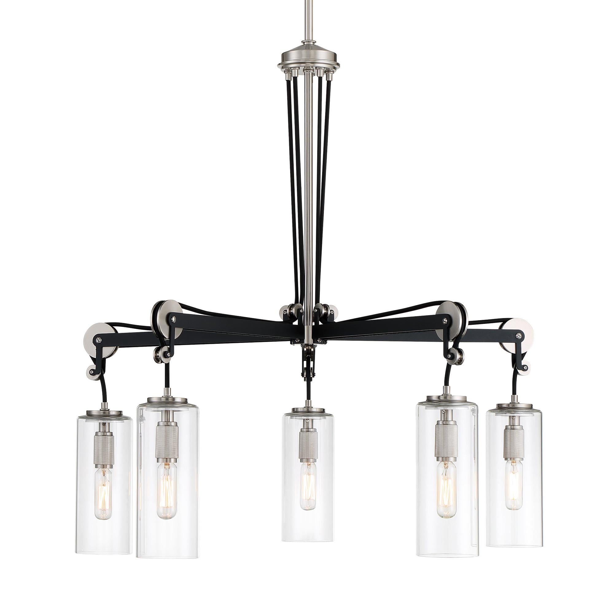 Transform a space into an ultra-modern interior with the Pullman Junction Chandelier from Minka Lavery, featuring a pulley-inspired mechanical system that presents a chic industrial vibe. Metallic elements, like brushed nickel pulley wheels and sockets, create a glam touch to a space. Each clear glass shade dangles from a long dark coal finish arm and cord, dropping in over countertops and interiors.