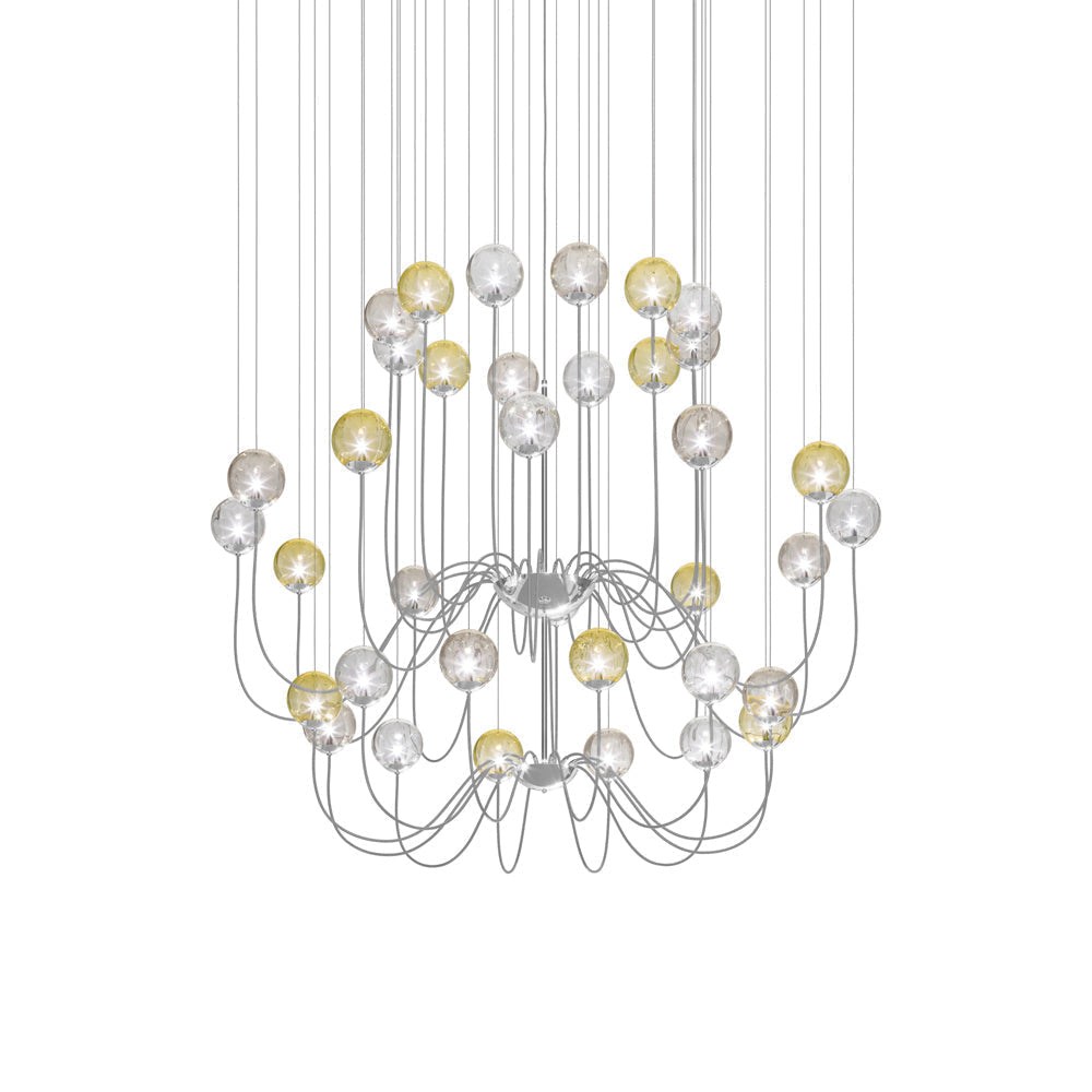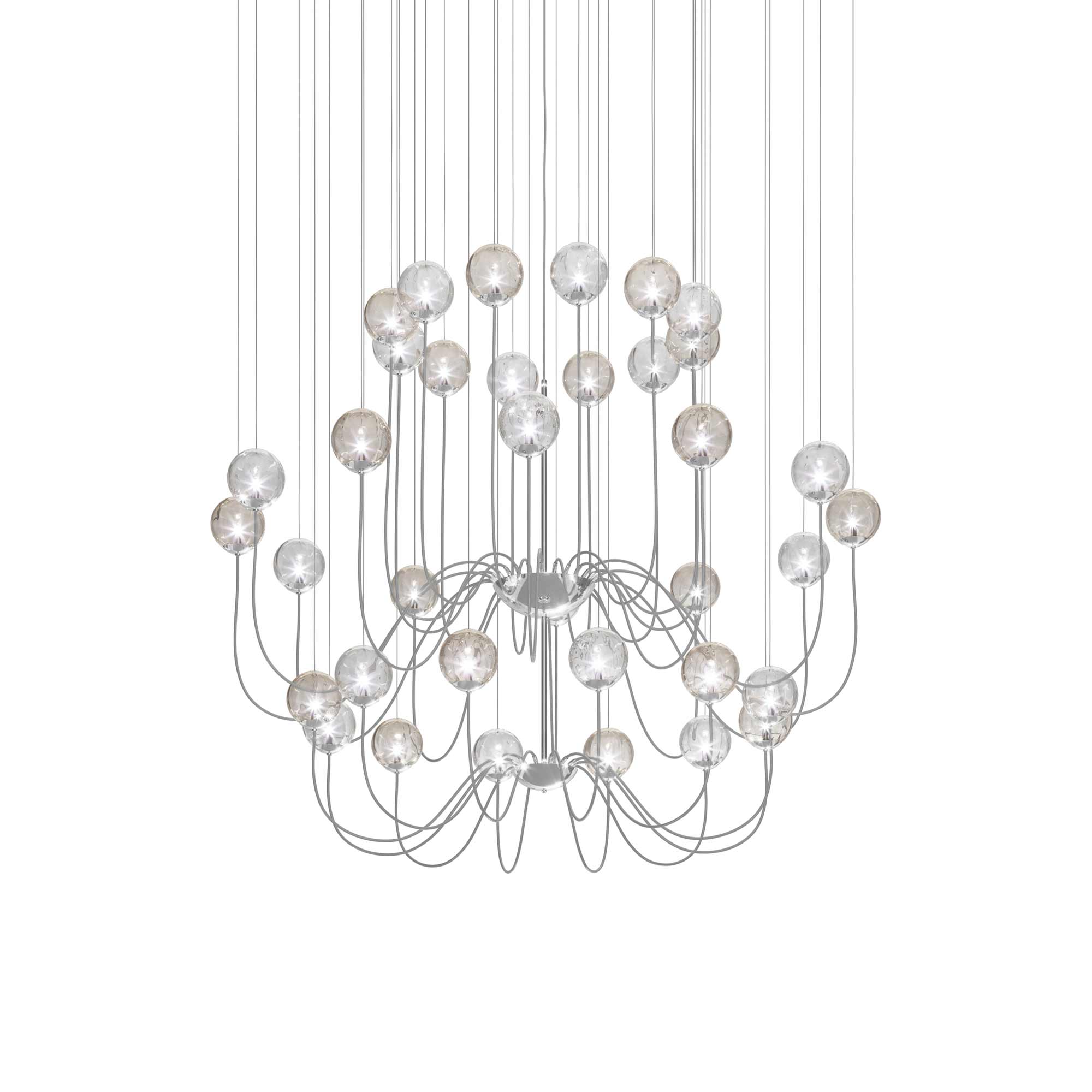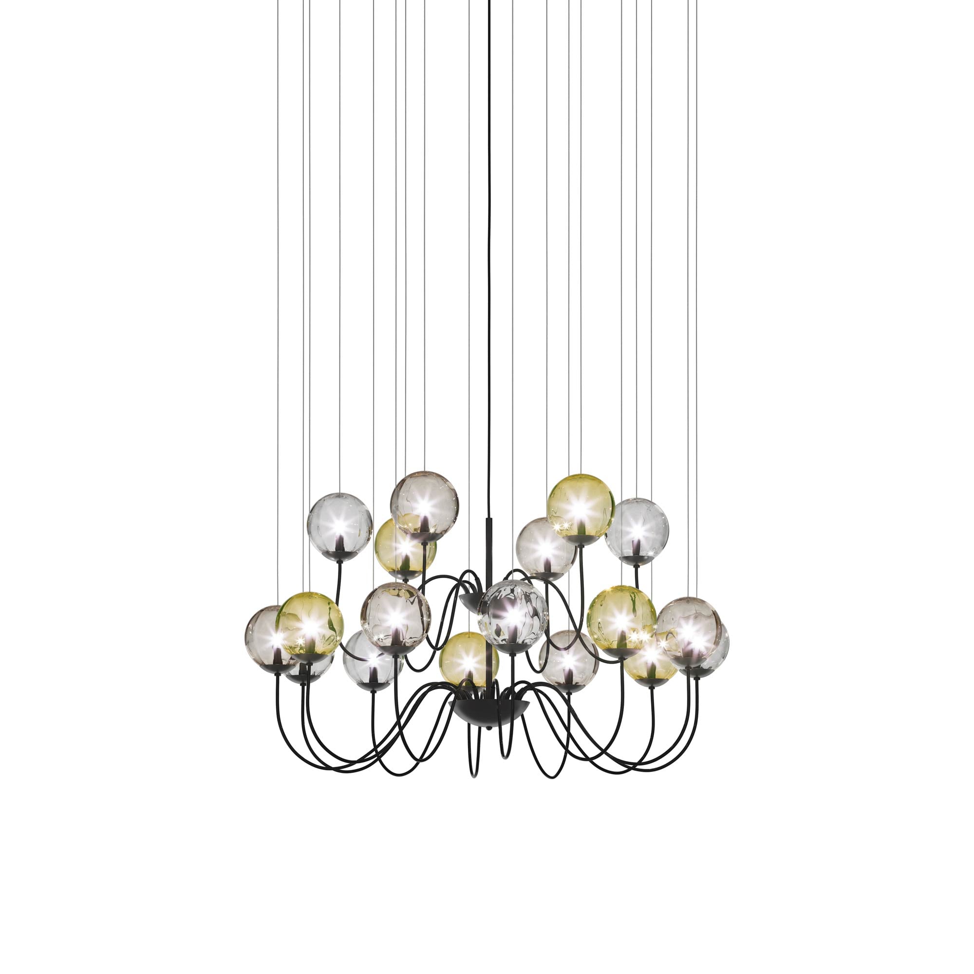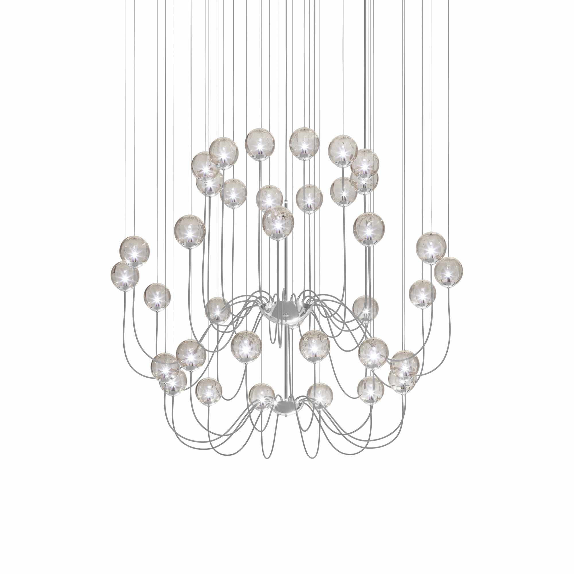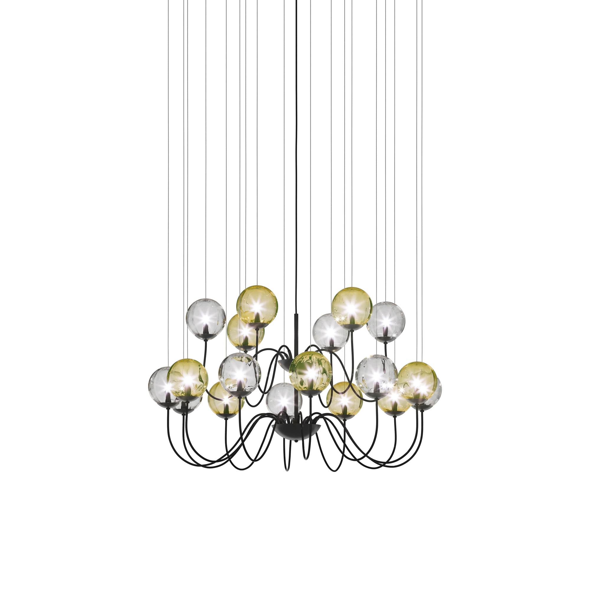 Find the balance between decadence and simplicity with the Puppet Chandelier from Vistosi, perfecting the art of transforming lighting into gallery-style artistry. The sheer delicacy of glass spheres become instrumental in radiating soft light and delivering a captivating aesthetic. Subtle metal holders and suspension cords embellish the contemporary feel of this stylish fixture.