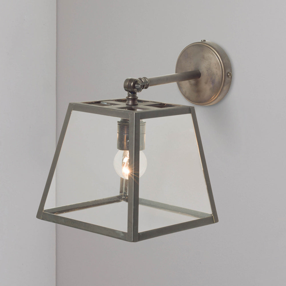 Intriguing detail embellishes a timeless design in lighting, adding a bit of sophistication to a casual space. The Quad Wall Light from Original BTC borrows from the iconic lantern motif with tapered silhouetting beginning with weathered brass constructing a geometric frame. Clear glass panels show exposed bulb lighting that emanates downward and through a grid metal top.