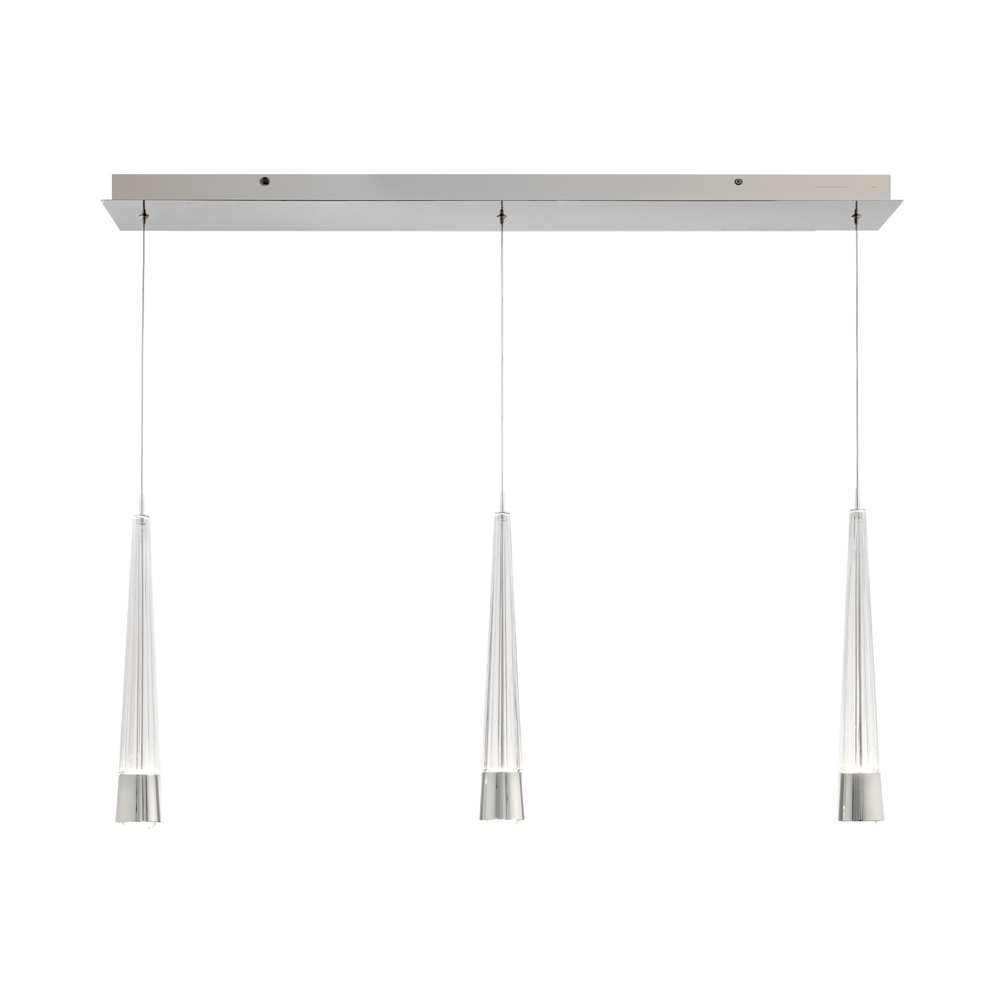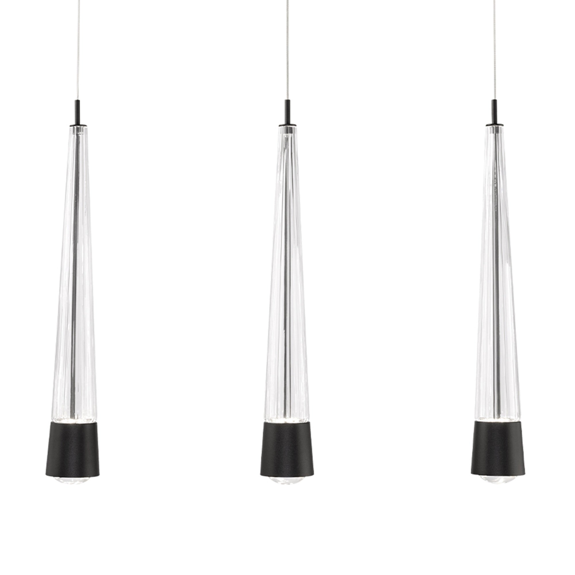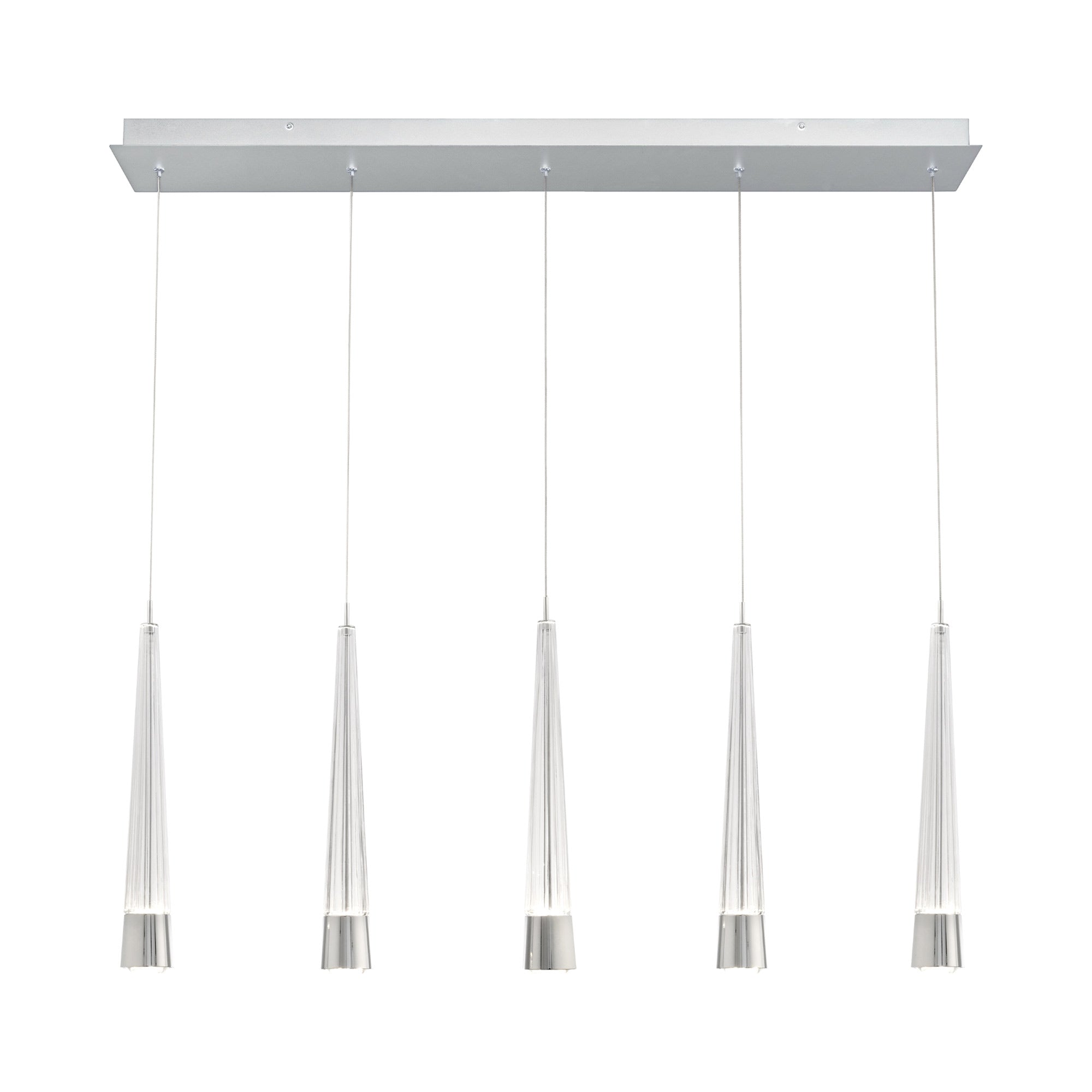 Introduce a mix of geometry and decadence with the Quill LED Linear Multi Pendant Light from dweLED. Aluminum hardware and glass bodies with a V-cut diffuser offers a minimalist approach to elegant style. This multi-light pendant features adjustable powered aircraft cables, creating a minimalist look.