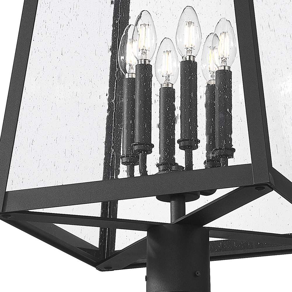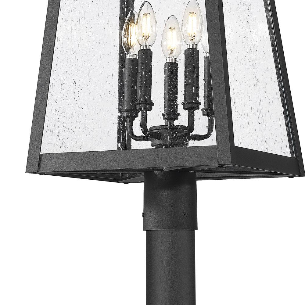 Pairing and angular lantern and round post, the Rainer Outdoor Round Post Light from Z-Lite sets the tone for a refined, inviting ambiance in your garden or landscaping. Its flared lantern boasts clear seedy glass for a hint of vintage dimensionality, while a black finish ensures versatility to suit a variety of exterior settings, delivering welcome ambiance.