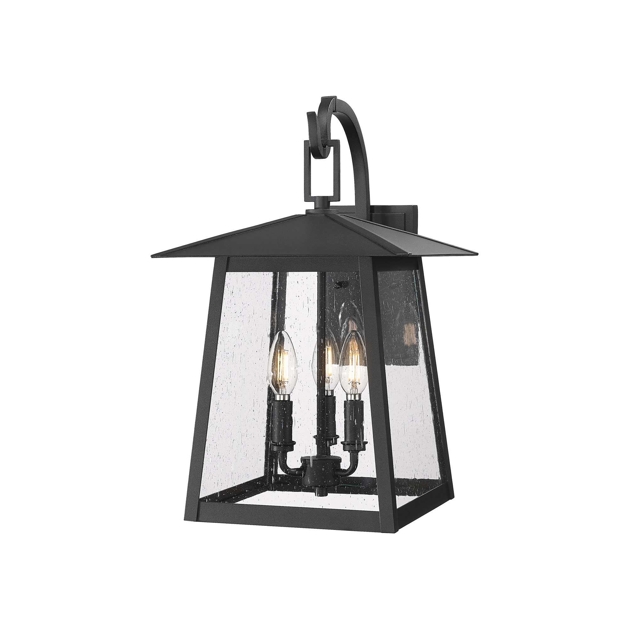 Well-suited to coastal environs, the Rainer Outdoor Wall Light from Z-Lite is a familiar lantern silhouette with an eye-catching flared design. Clear seedy glass panes deliver direct, bright illumination, perfect for front porches, back patios and everywhere in between. Its durable black finish complements no matter your home's color or style.