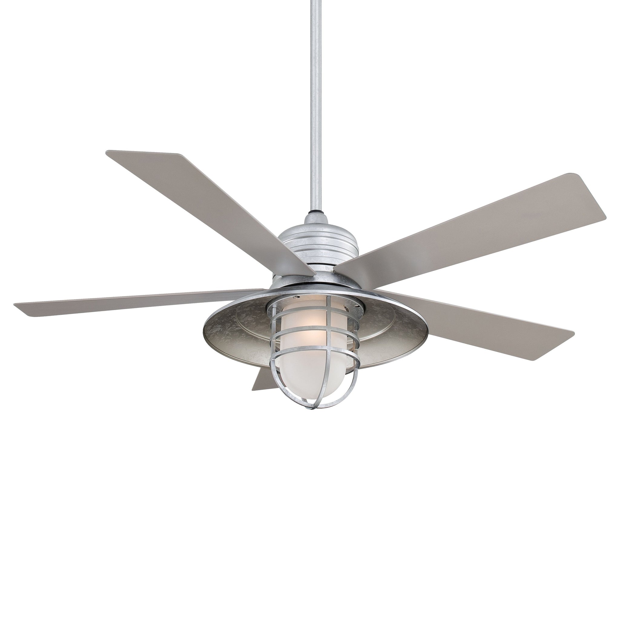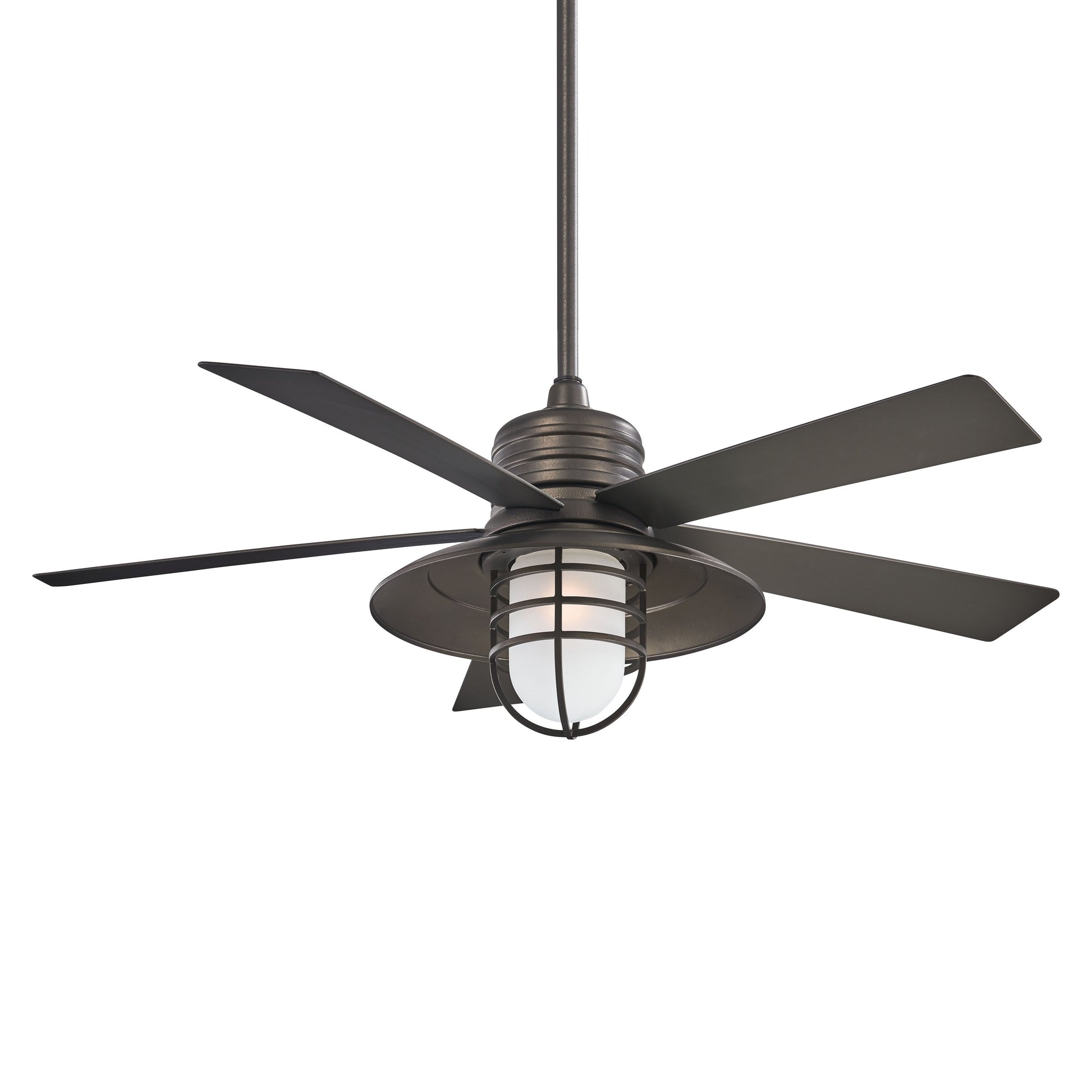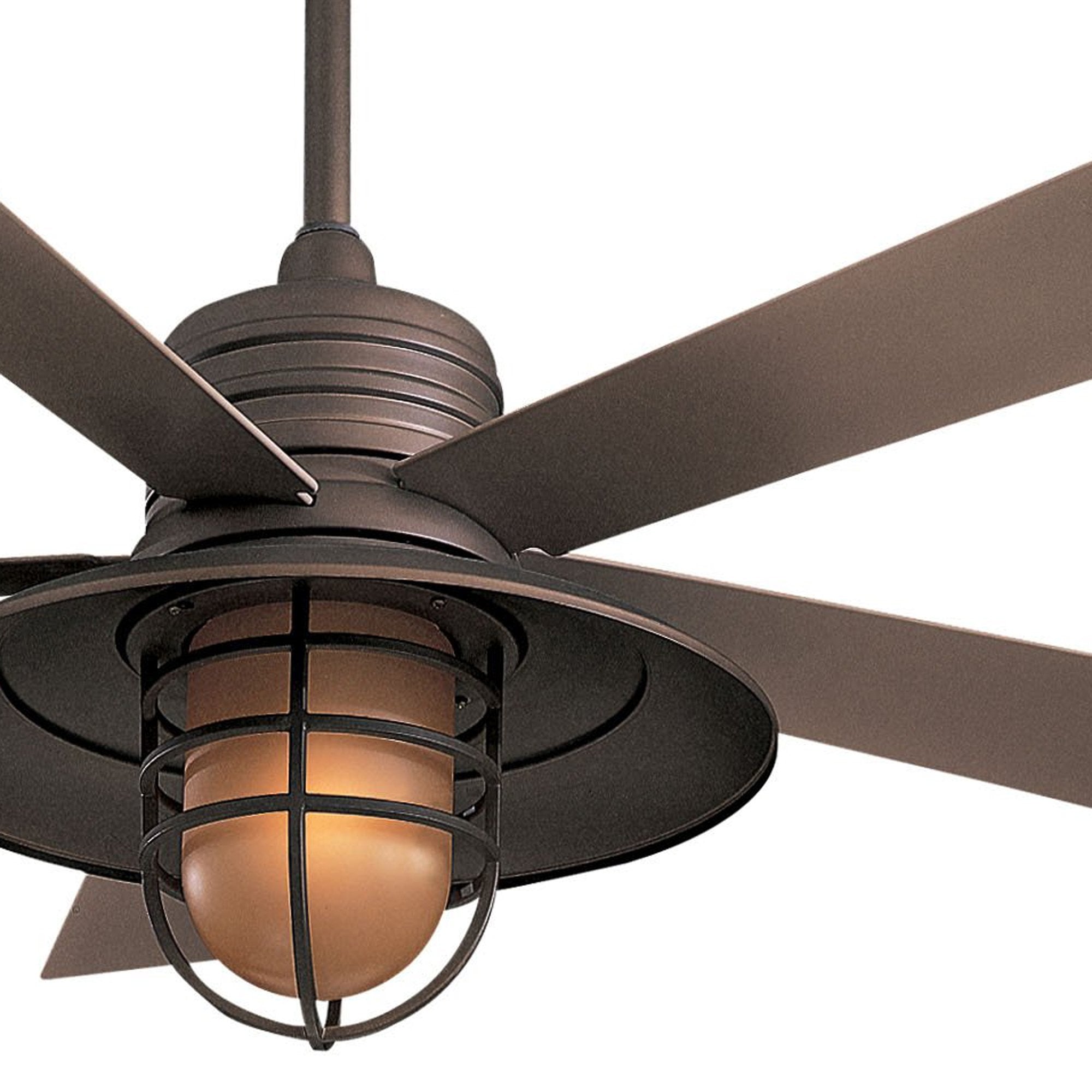 Industrial chic highlights the design motif of the Rainman Outdoor Ceiling Fan from Minka Aire, an excellent option for introducing themed character to a casual custom patio, gazebo, or porch. This five-blade fan is energy-efficient and captivating in style, reflected in metal construction available in a variety of finishes and a gritty industrial cage design covering an elongated etched glass shade.