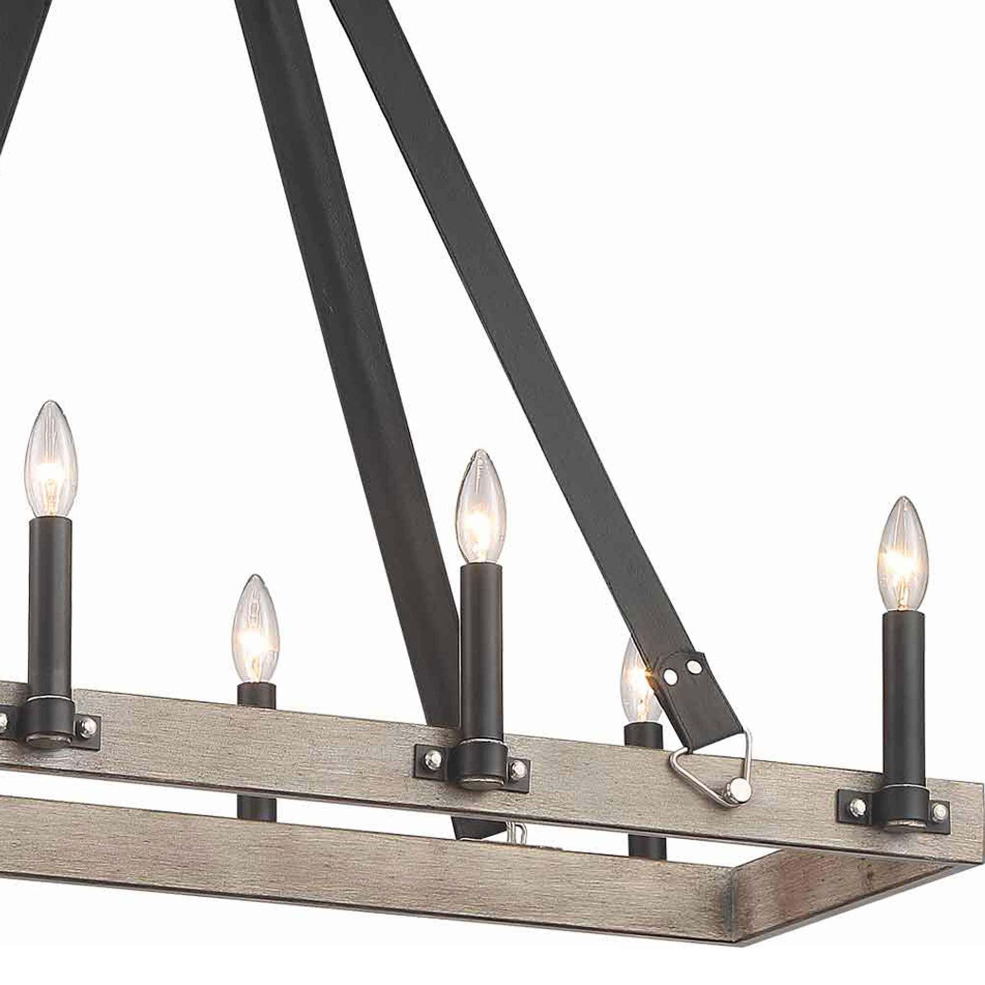 Create an understated rustic flair with the Rawson Ridge Linear Pendant Light from Minka Lavery, featuring a slim rectangular silhouette frame in an aged silverwood finish. Surrounding the narrow linear chandelier is a series of coal finish candles held in place by clasps with rivet details that offer an industrial vibe to spacious dining tables and kitchen island countertops.