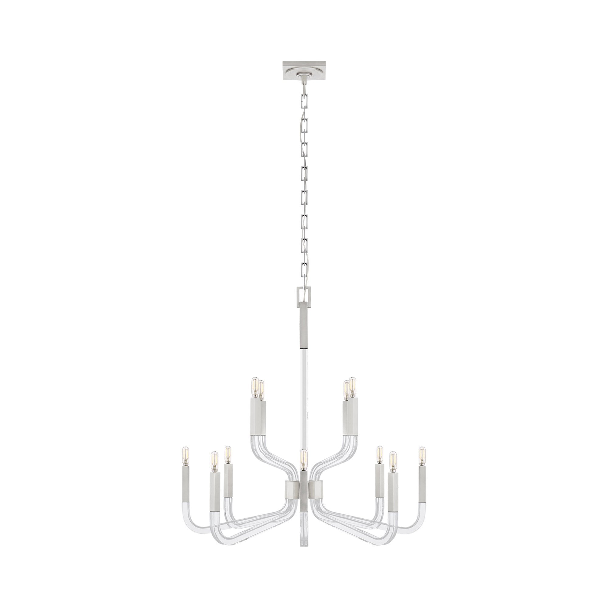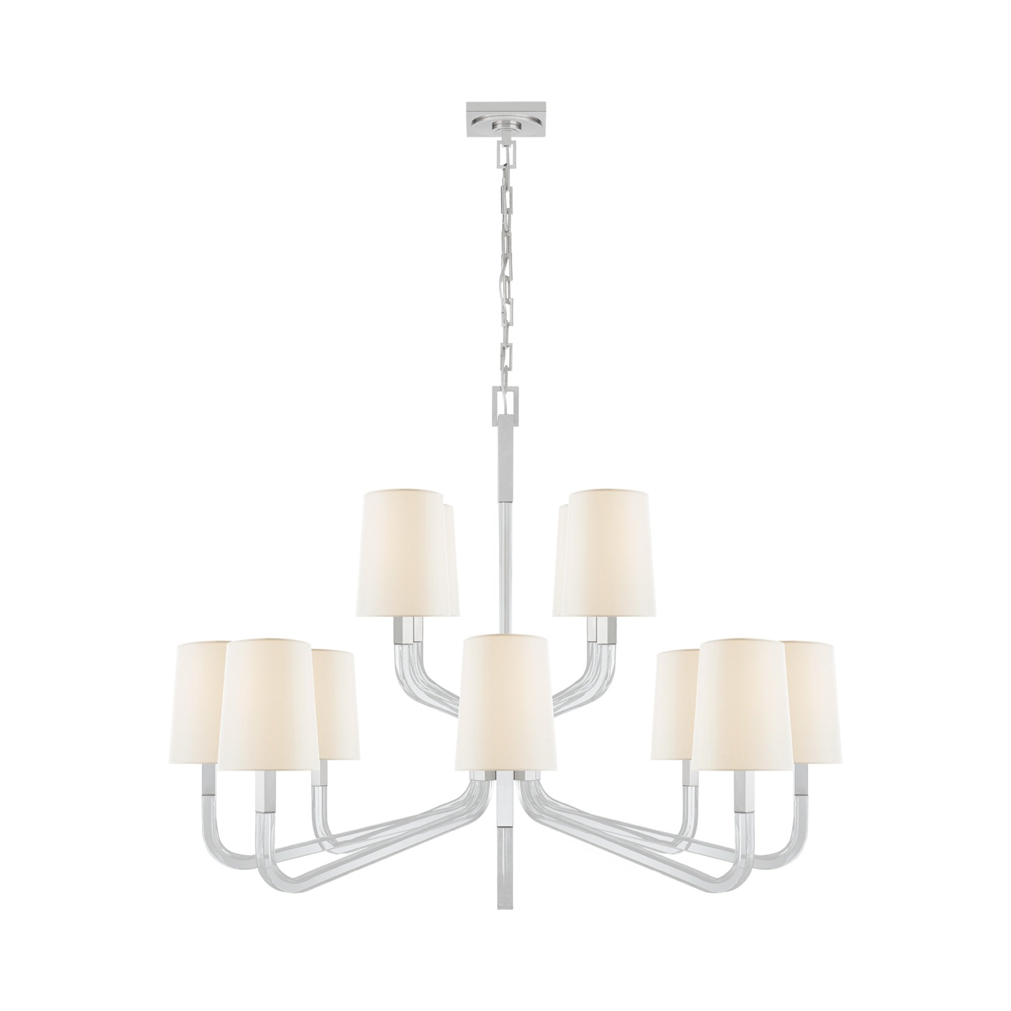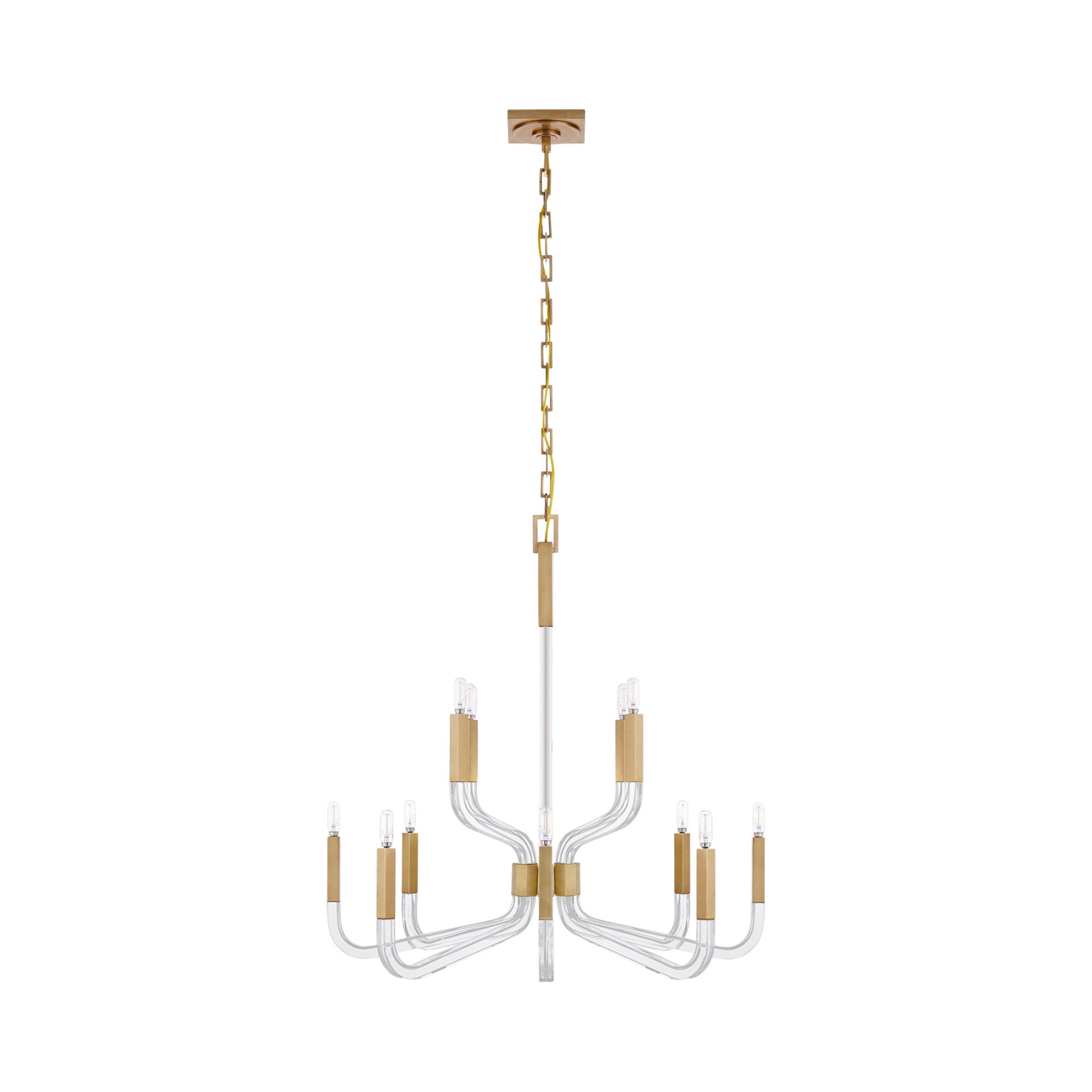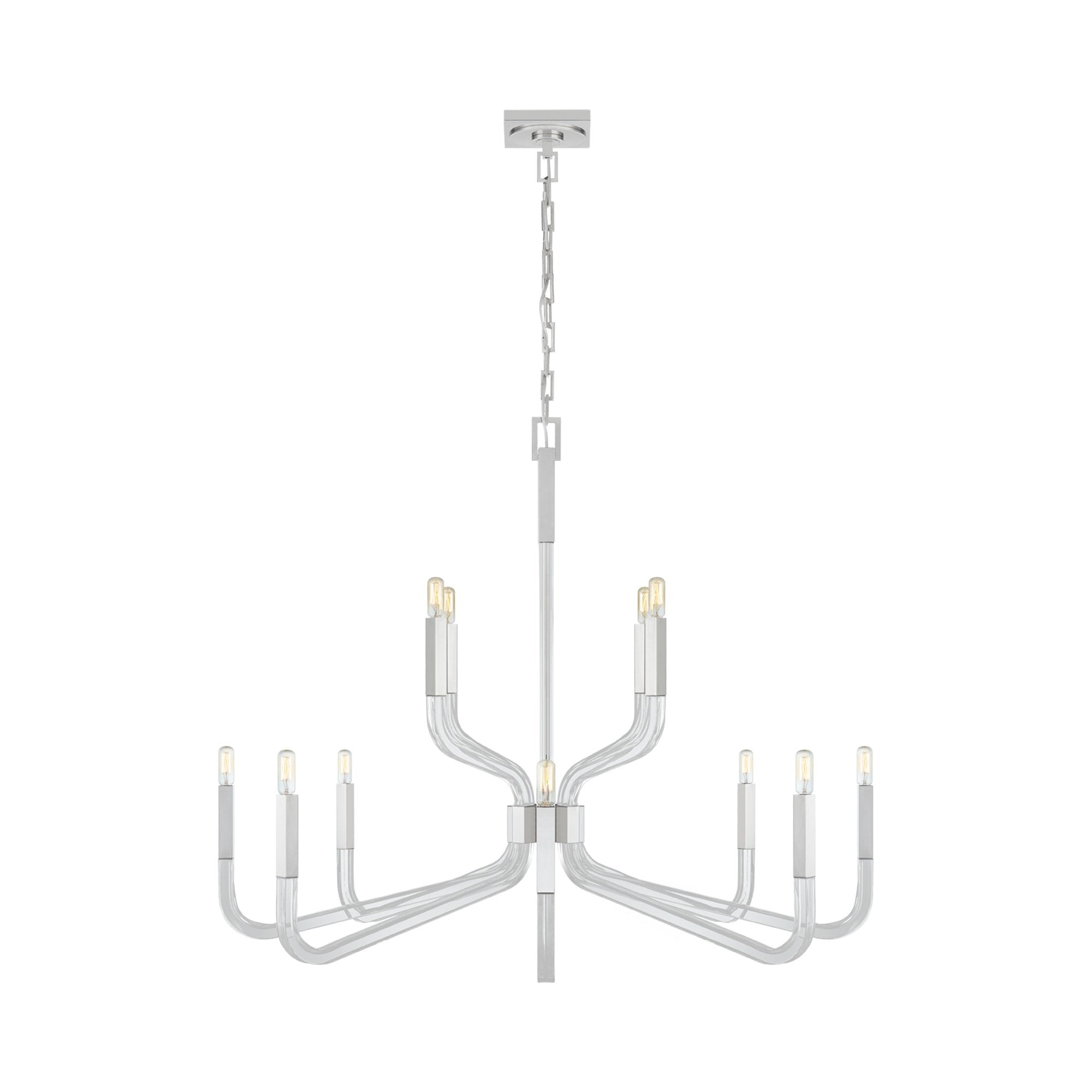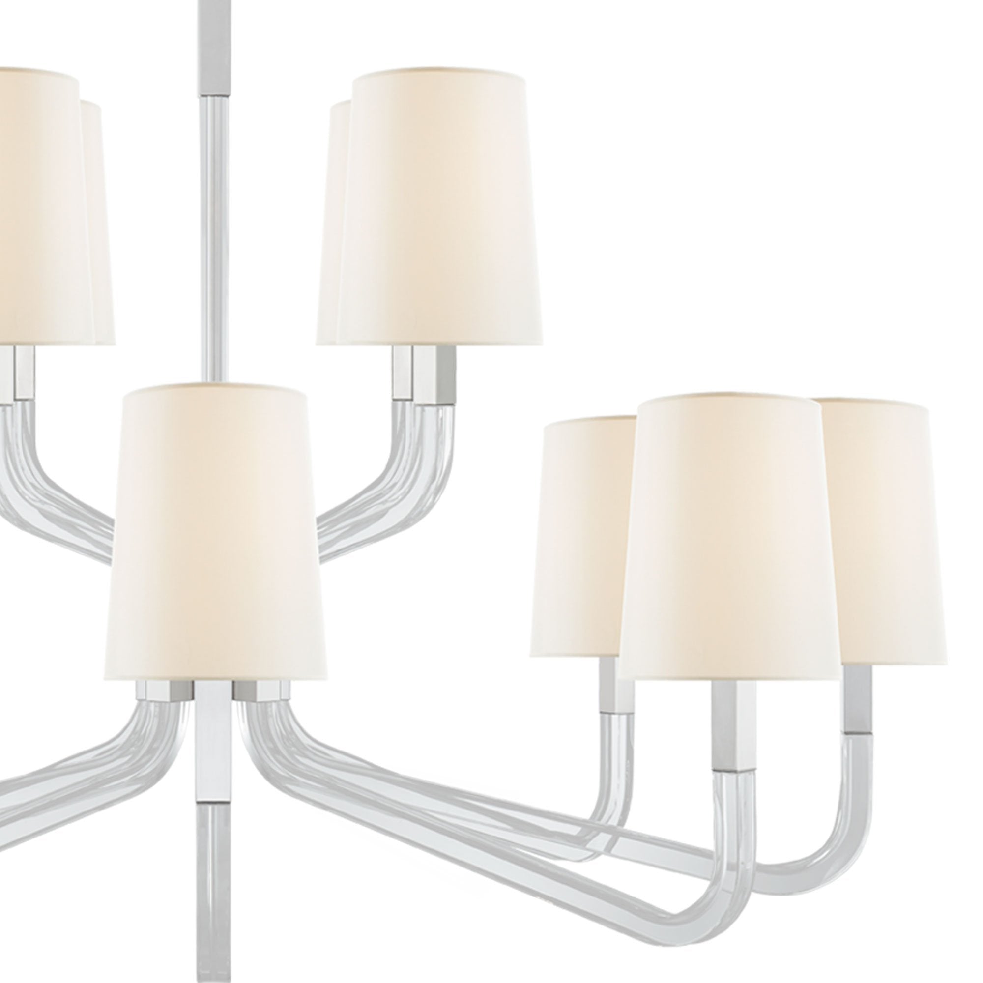 An eye-pleasing silhouette features symmetry and shaping that transforms the Reagan Chandelier from Visual Comfort Signature into a chic piece of functional artistry. Building on a pipe motif, this contemporary chandelier offers glass-like acrylic shapes bound to metal, with metal shades adding visual impact.