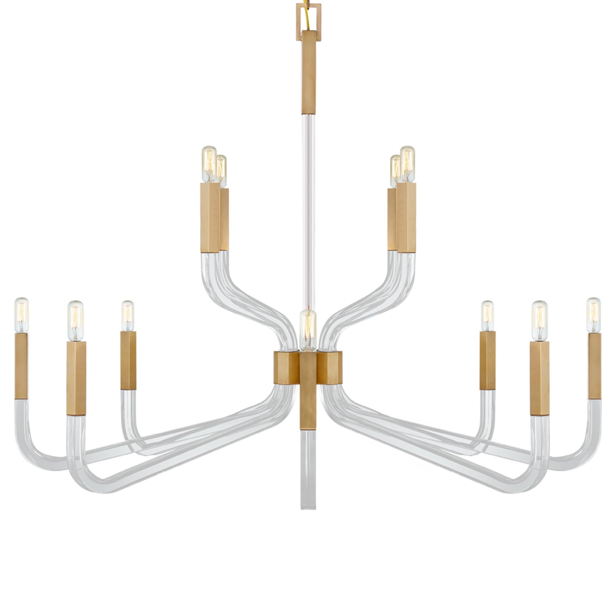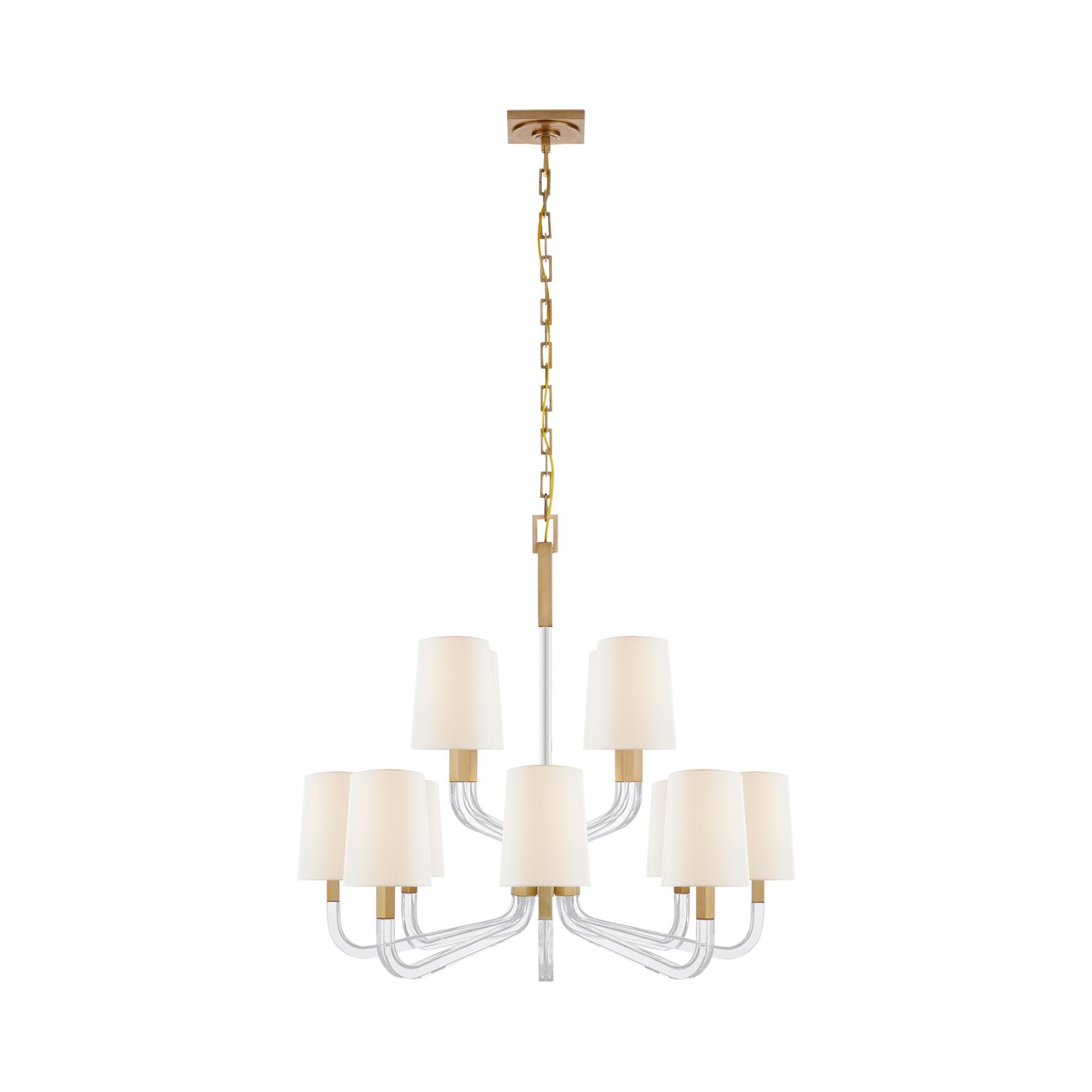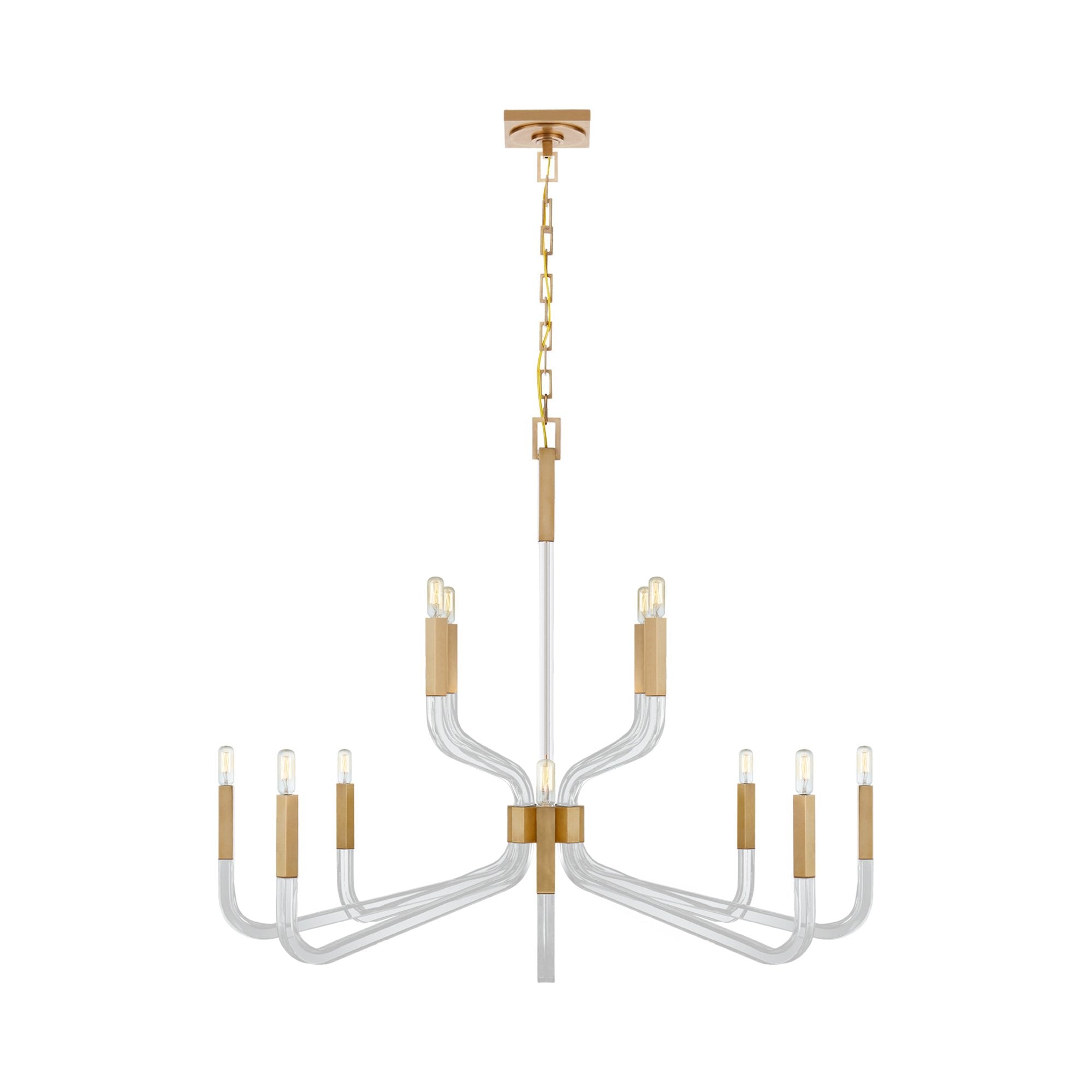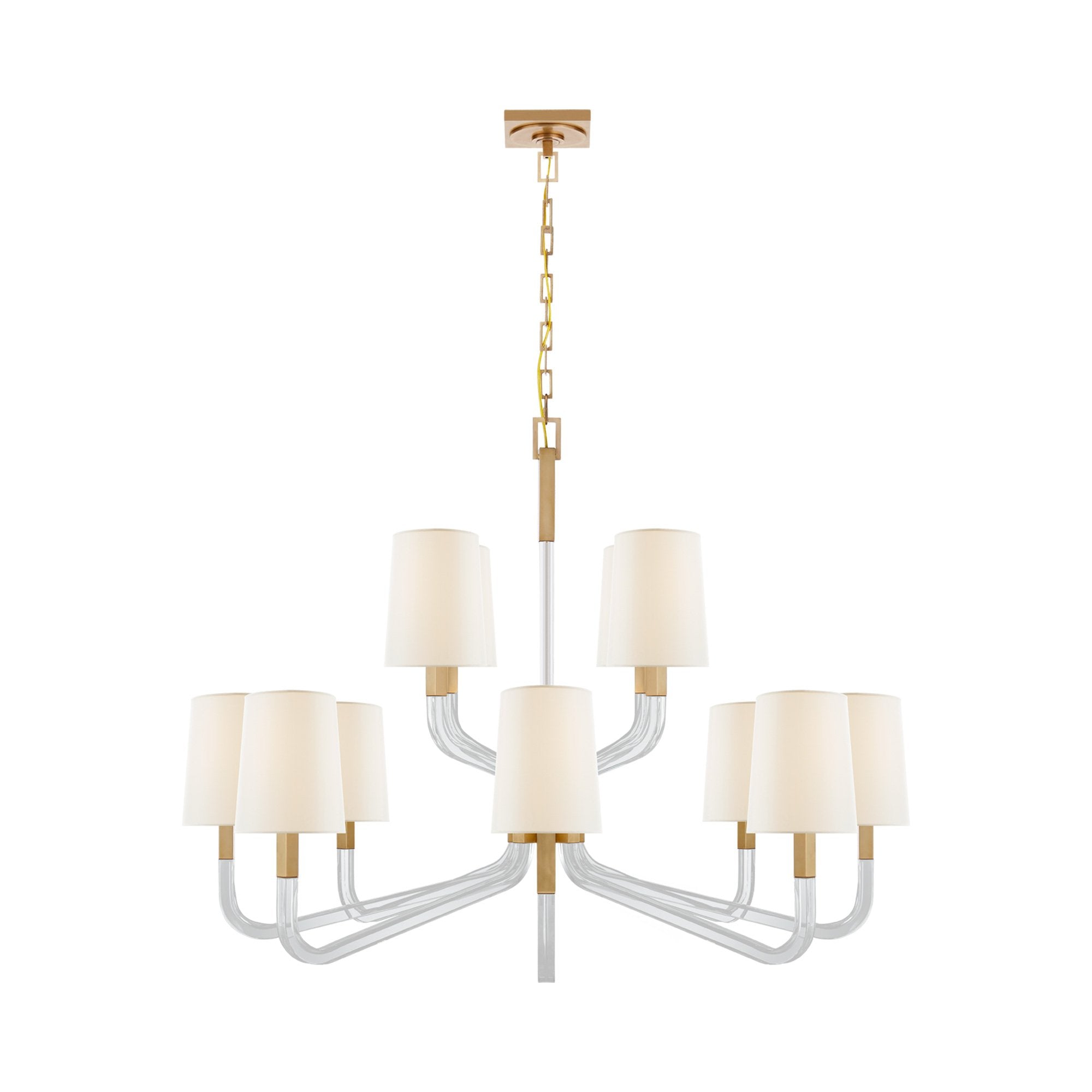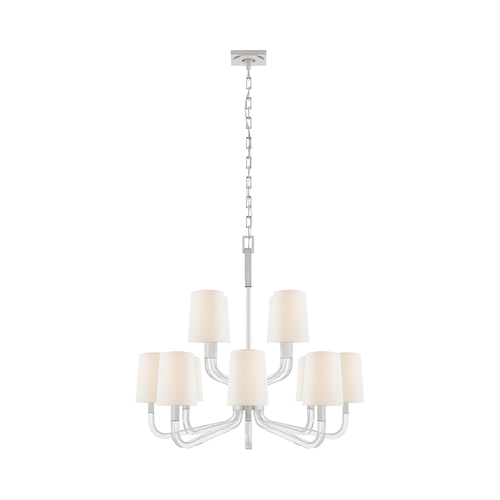 An eye-pleasing silhouette features symmetry and shaping that transforms the Reagan Chandelier from Visual Comfort Signature into a chic piece of functional artistry. Building on a pipe motif, this contemporary chandelier offers glass-like acrylic shapes bound to metal, with metal shades adding visual impact.