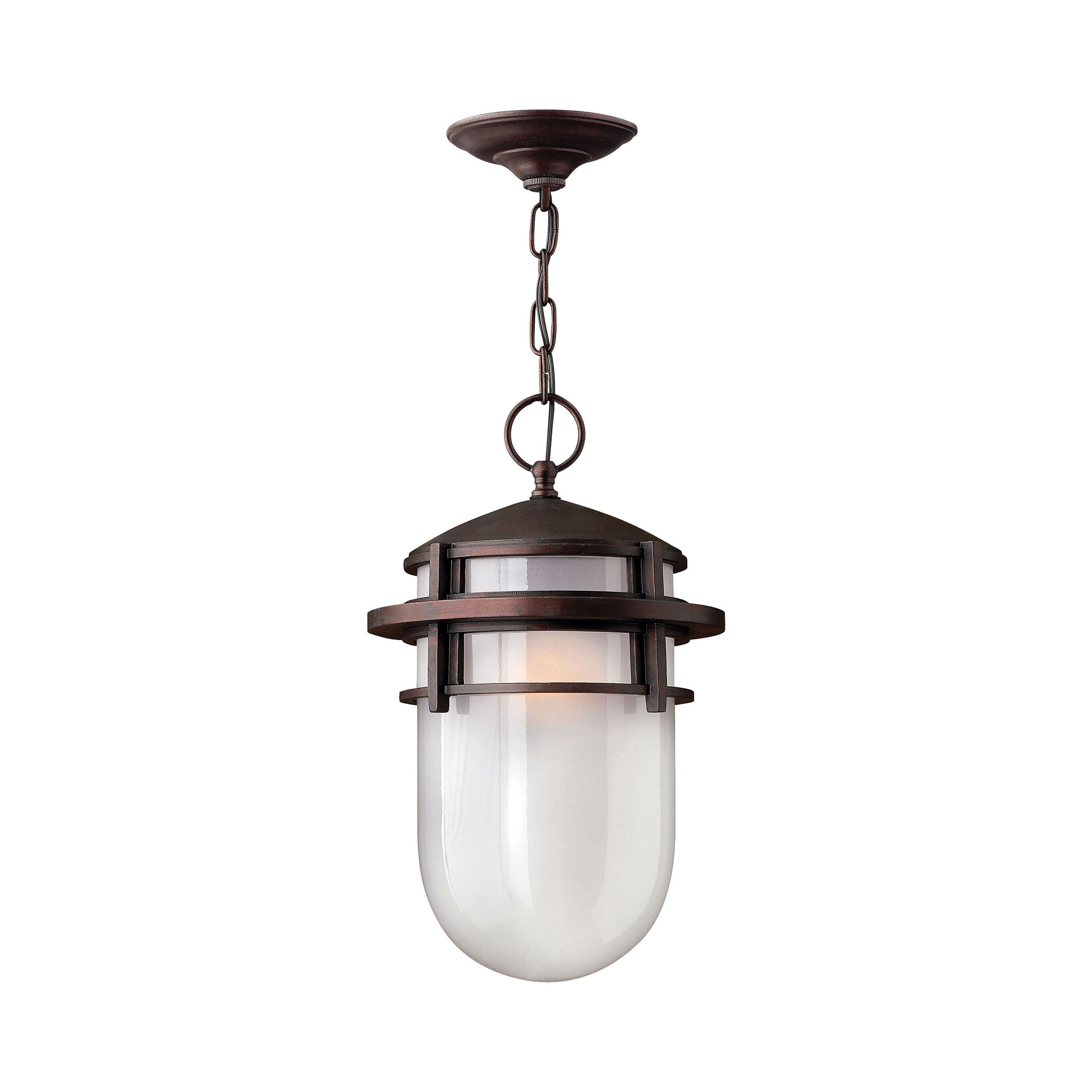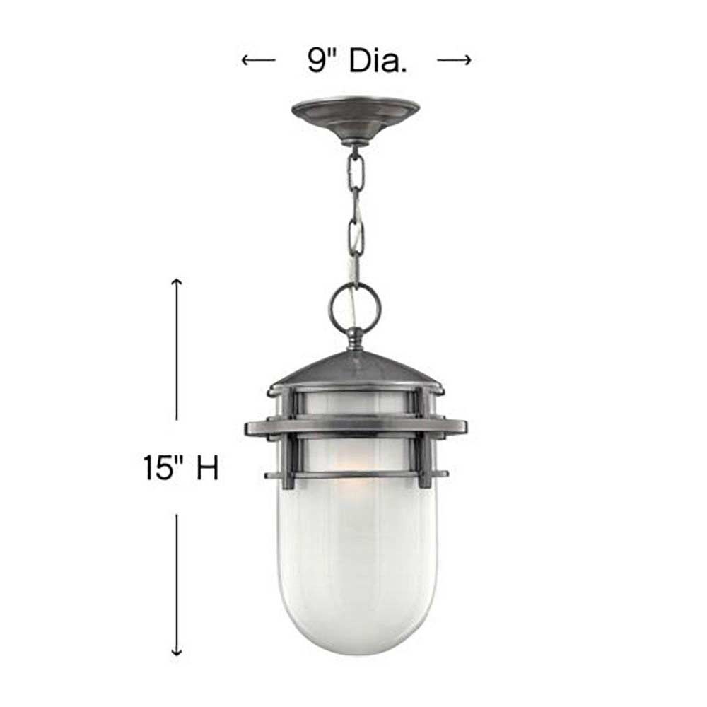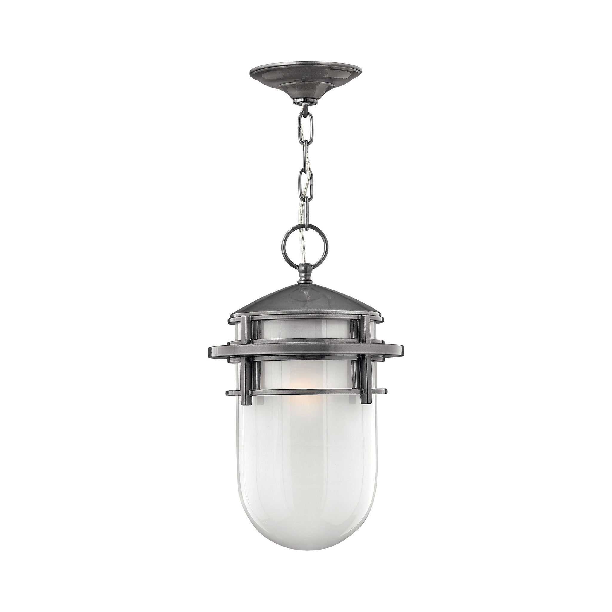 Reef Outdoor Pendant Light’s contemporary nautical shape features a sleek capsule of inside etched glass captured by bold rings of cast aluminum.
