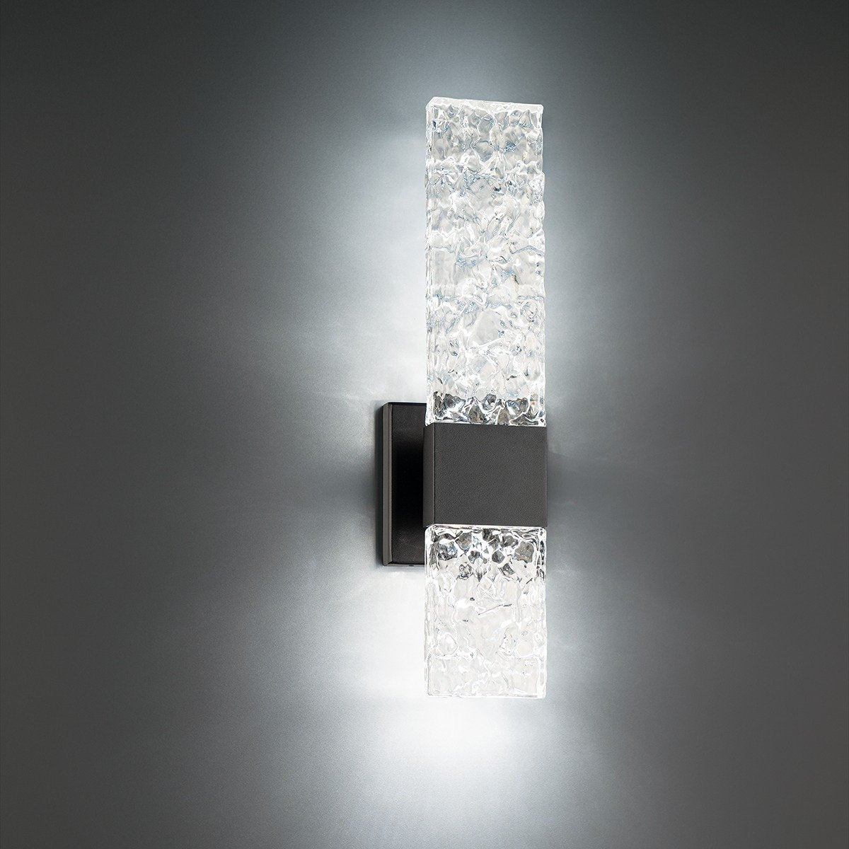 Organically yours. Free formed artisan glass comes to light in this shimmering design to evoke a mesmerizing effect as though viewing a reflecting pool. Ideal for a variety of indoor or outdoor upscale applications. A dramatic approach to luxurious residential, commercial or hospitality settings. May be mounted vertically in either direction.