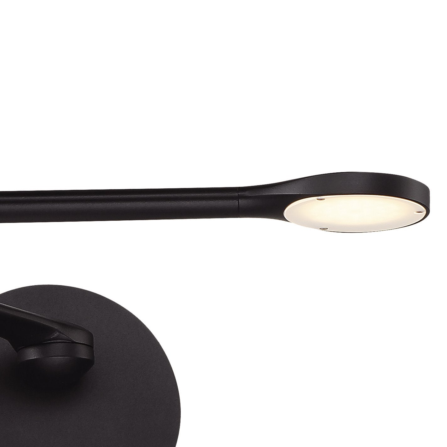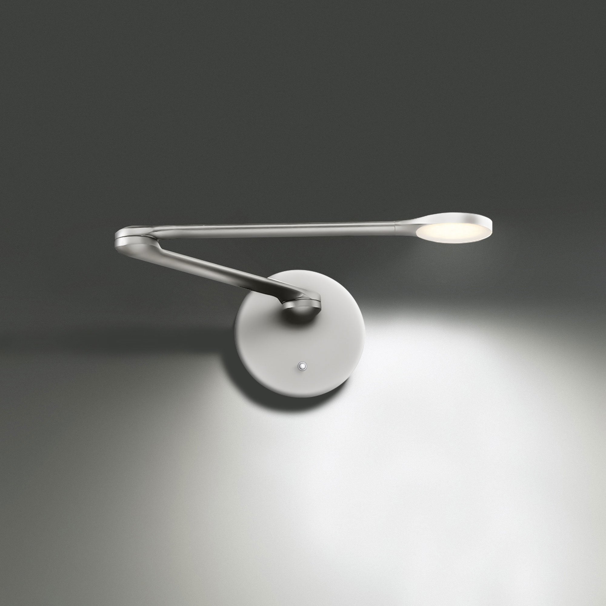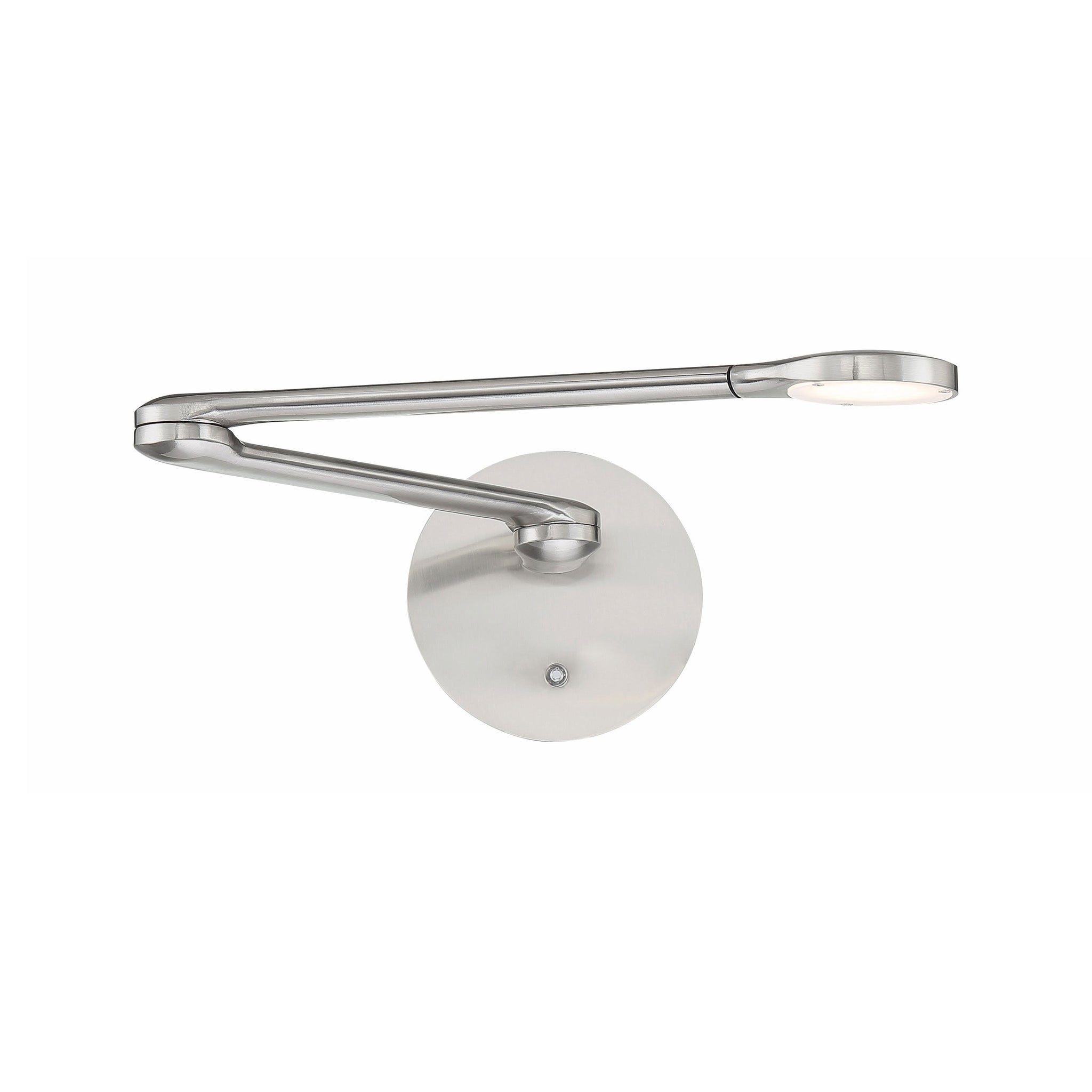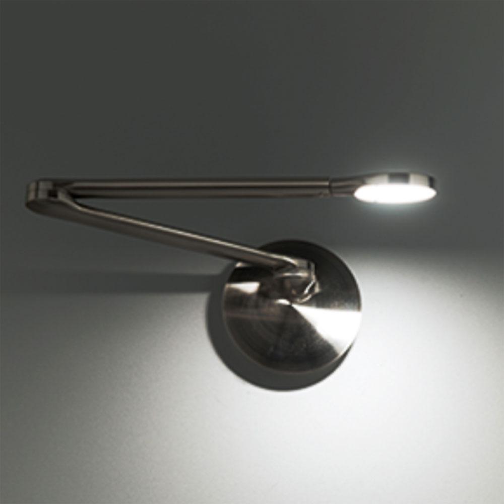 Contemporary task lamp for wall or desk applications. Personalized illumination with fingertip control in your private bedroom, office or workspace where functional down lighting is needed for effective reading. Ideal for senior living centers and hotels. Arm adjusts horizontally 180 degrees while head rotates 300 degrees. Available in black or white textured, or brushed nickel finish.