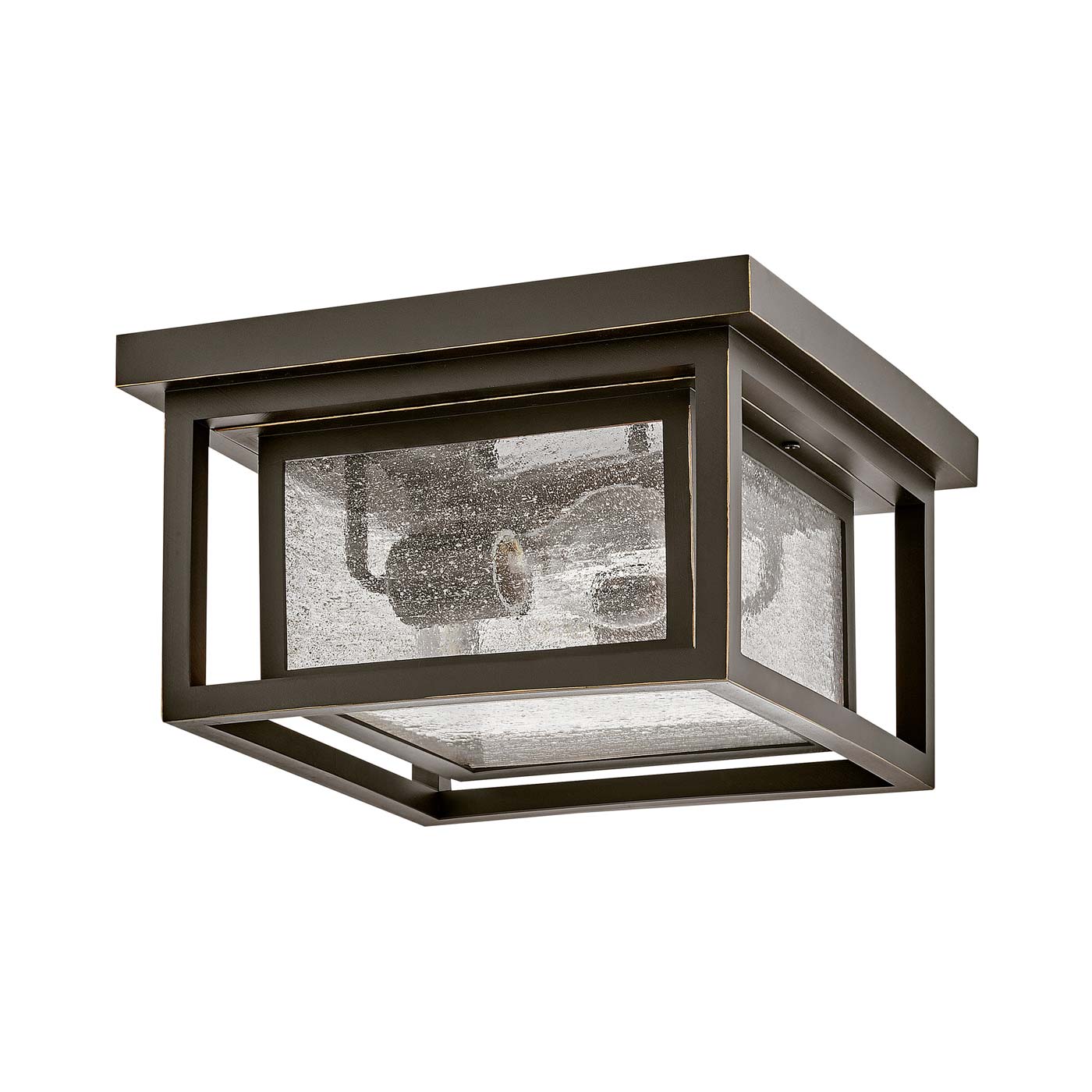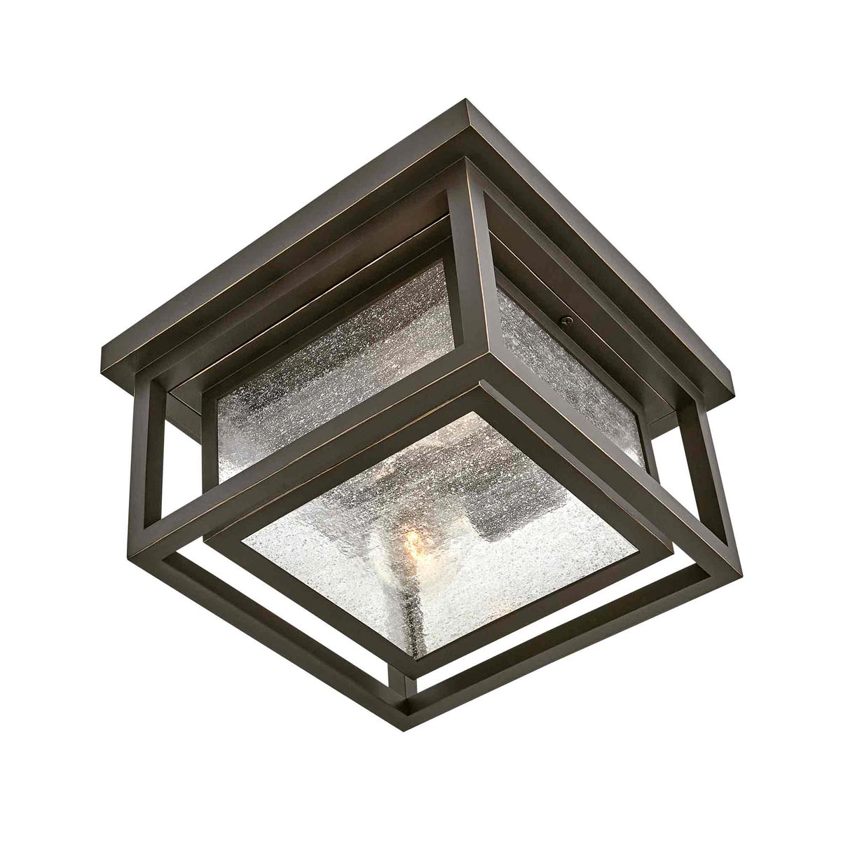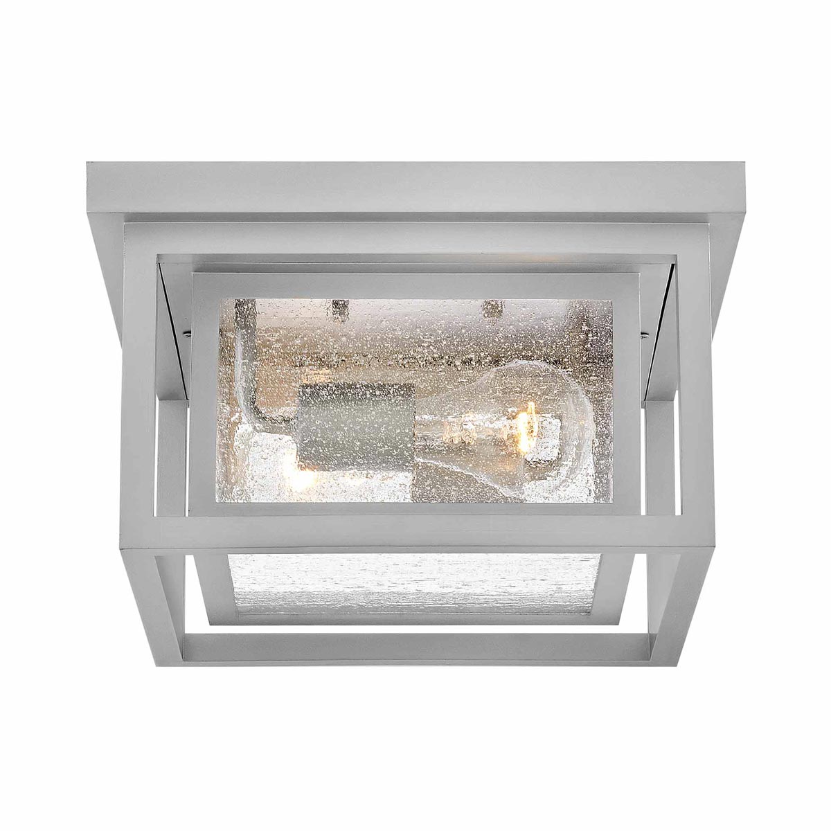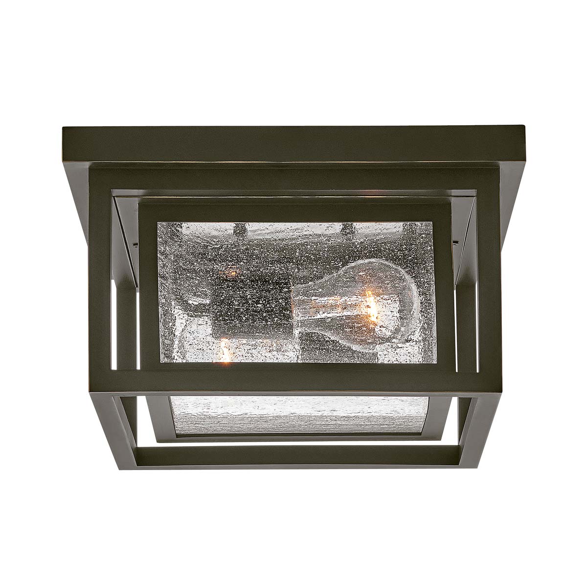 Structured double framing bring eye-catching dimension and texture to the rustic Republic Outdoor Flush Mount Ceiling Light from Hinkley. Its clean lines are accentuated with panes of clear seedy glass that create wonderful depth and texture as they soften the light from within. Choose vintage style bulbs for an added dose of charm and character.
