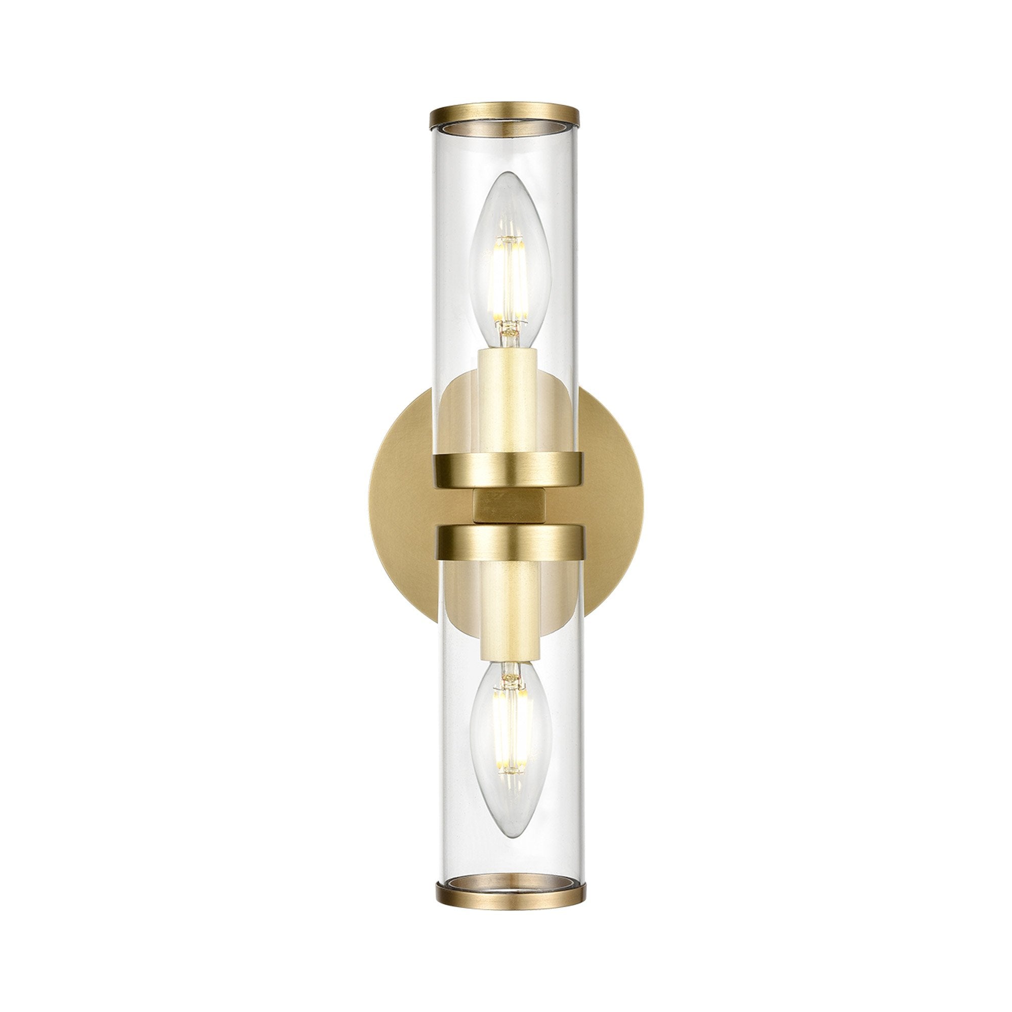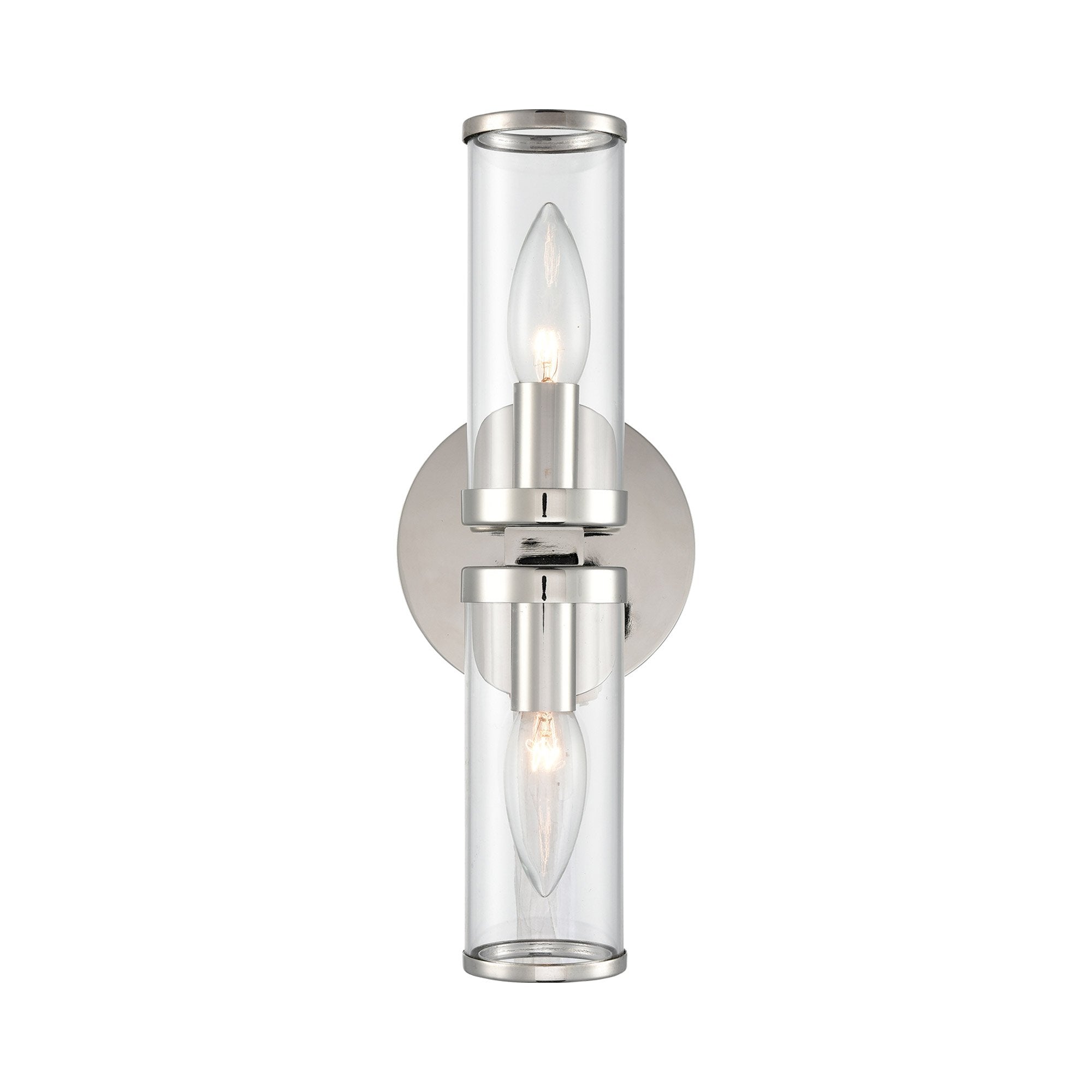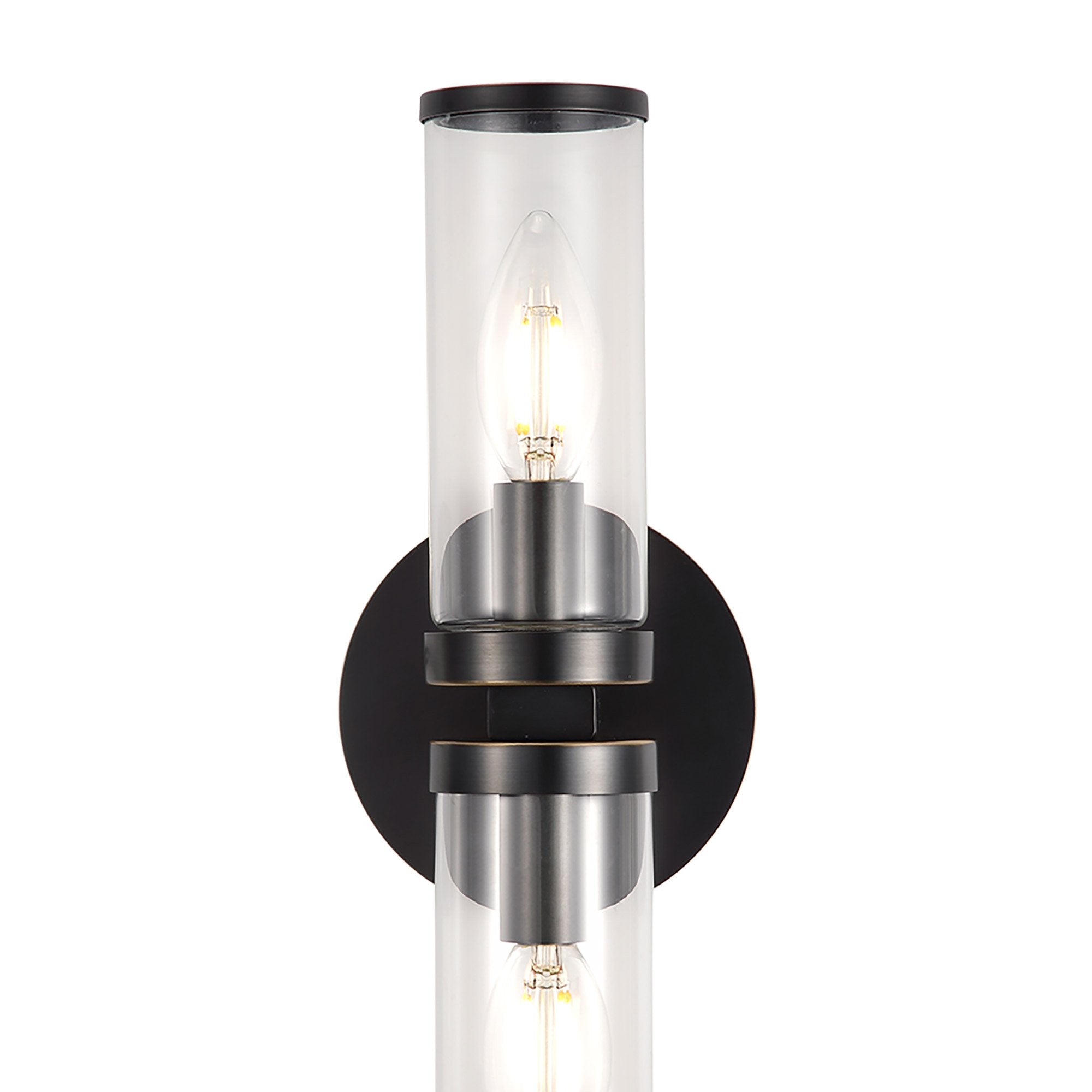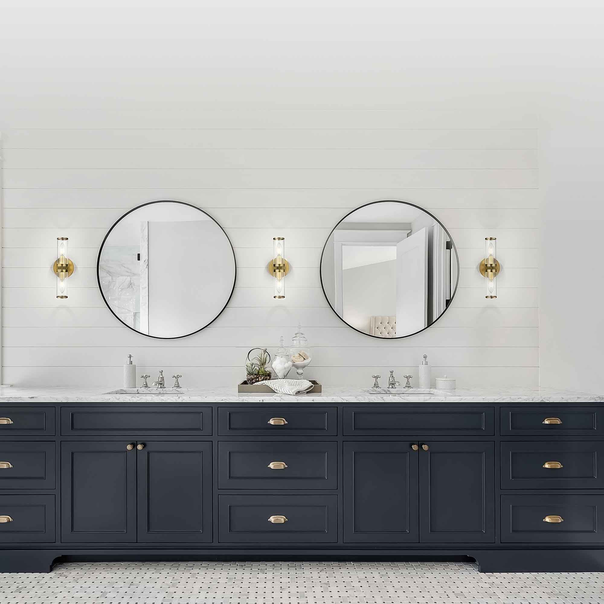 Cool clear cylinders are capped with metal rings that bring a sense of elegance and elevated character to the Revolve Bath Double Wall Light from Alora Lighting.