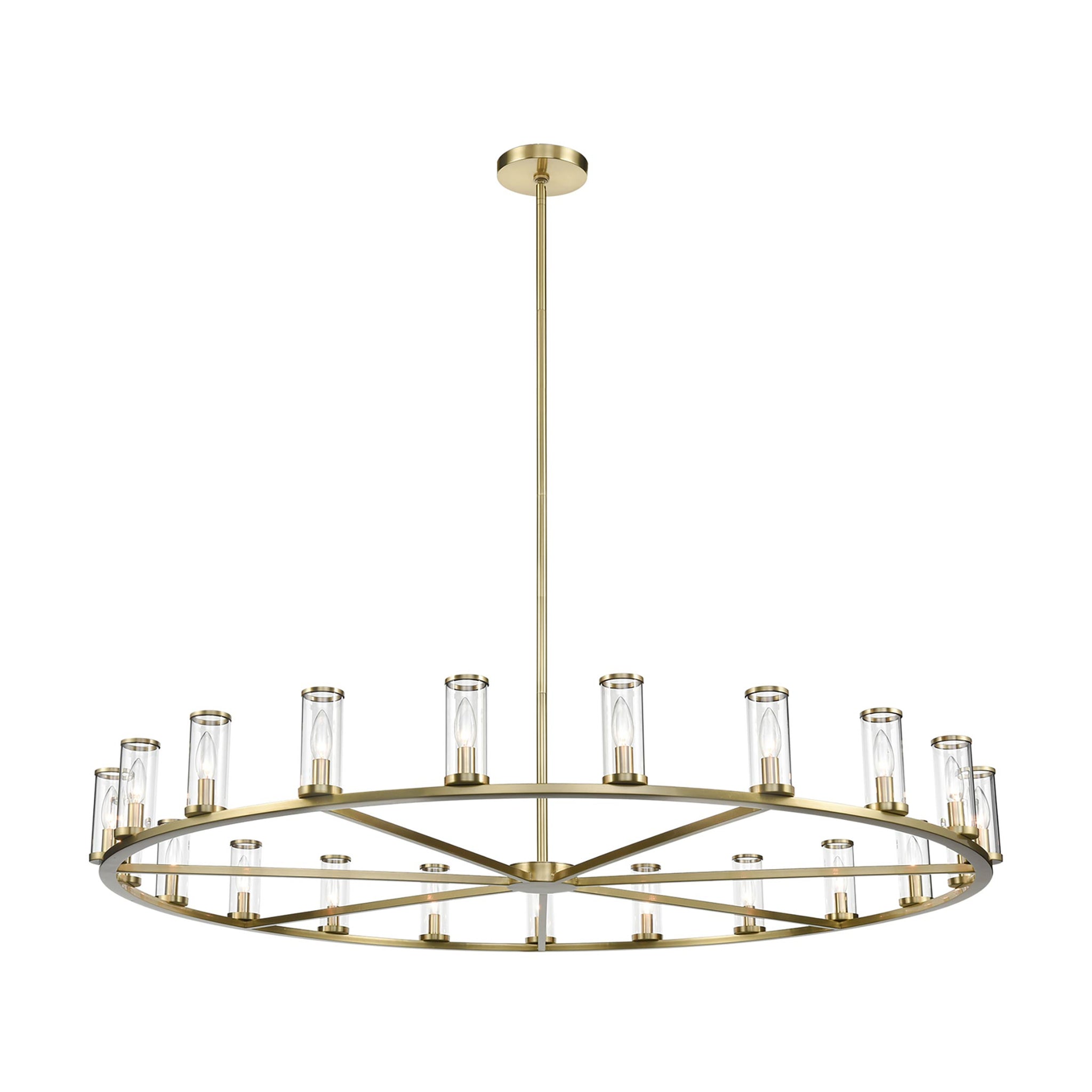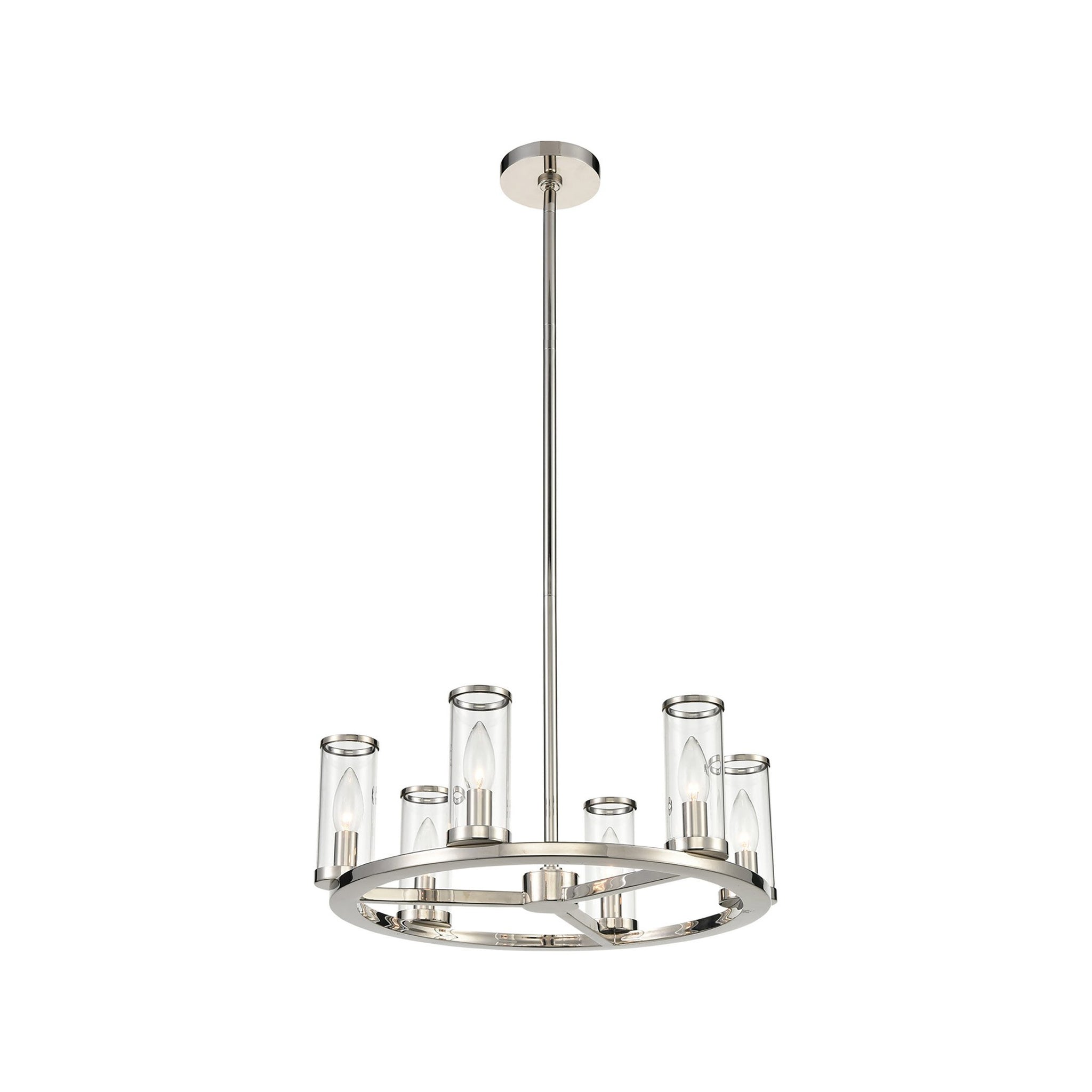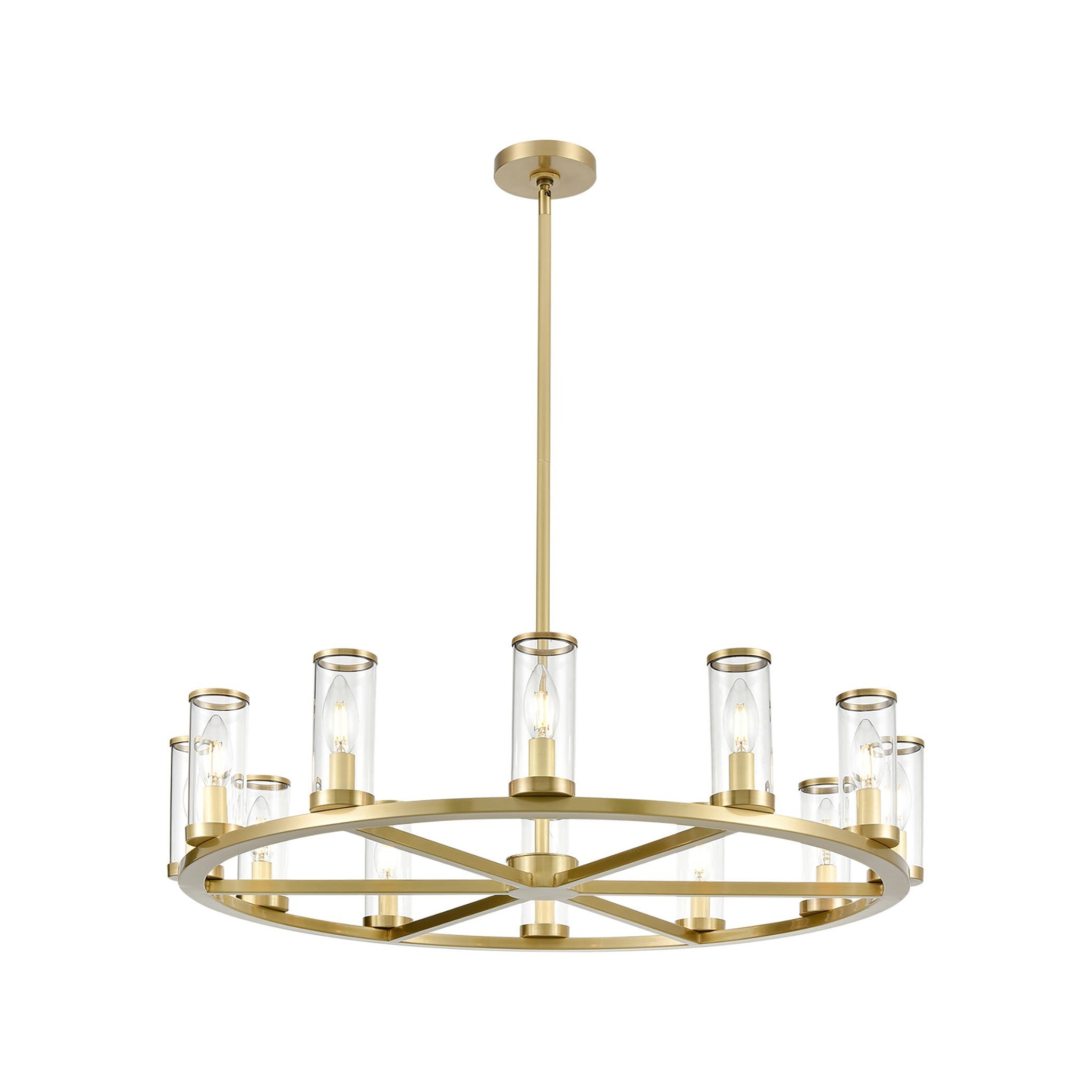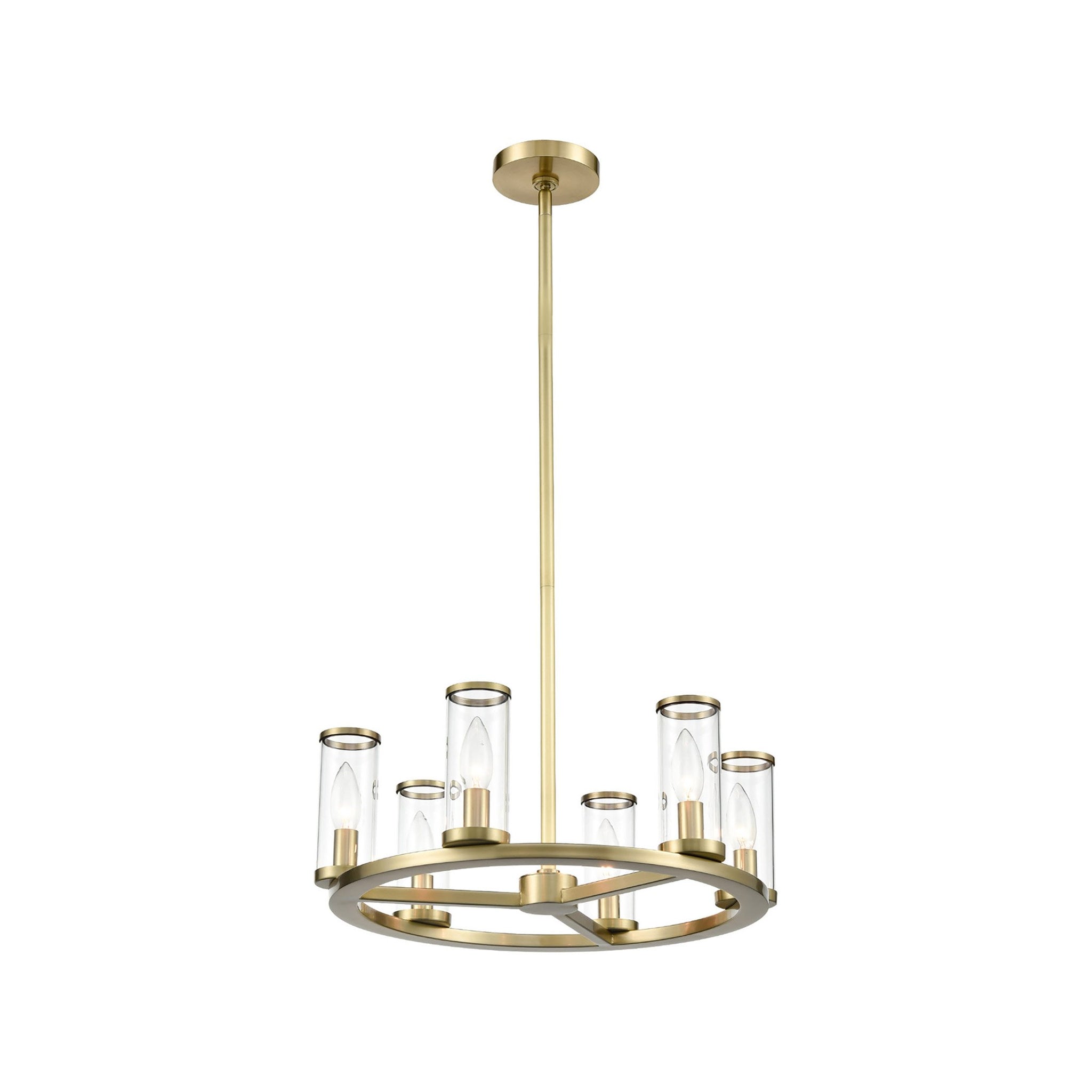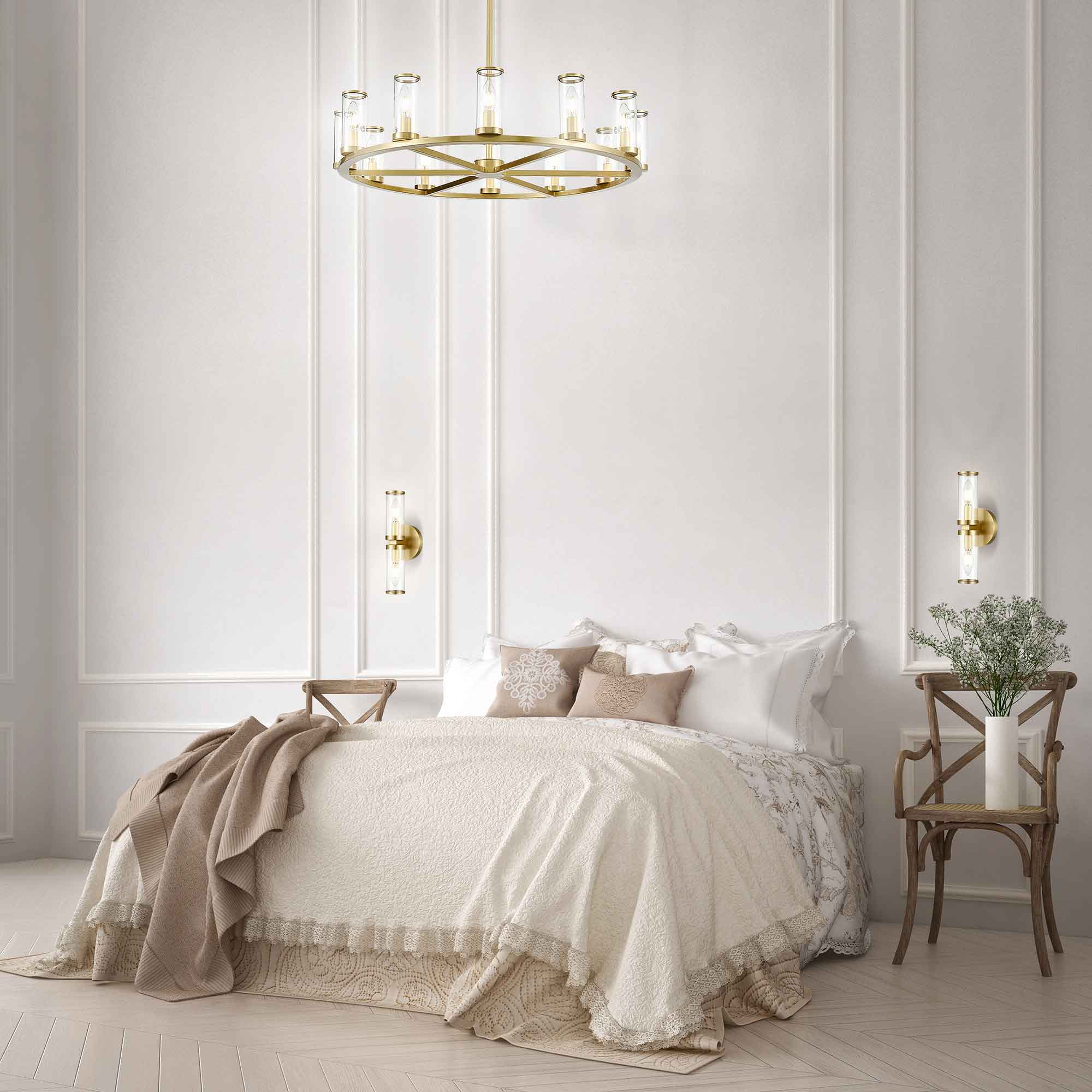 A contemporary aesthetic borrows from Euro-castle inspired design to create the multi-light Revolve Chandelier from Alora Lighting, delivering a glam look with tall glass cylinder shades and an enchanting spoked metal frame.