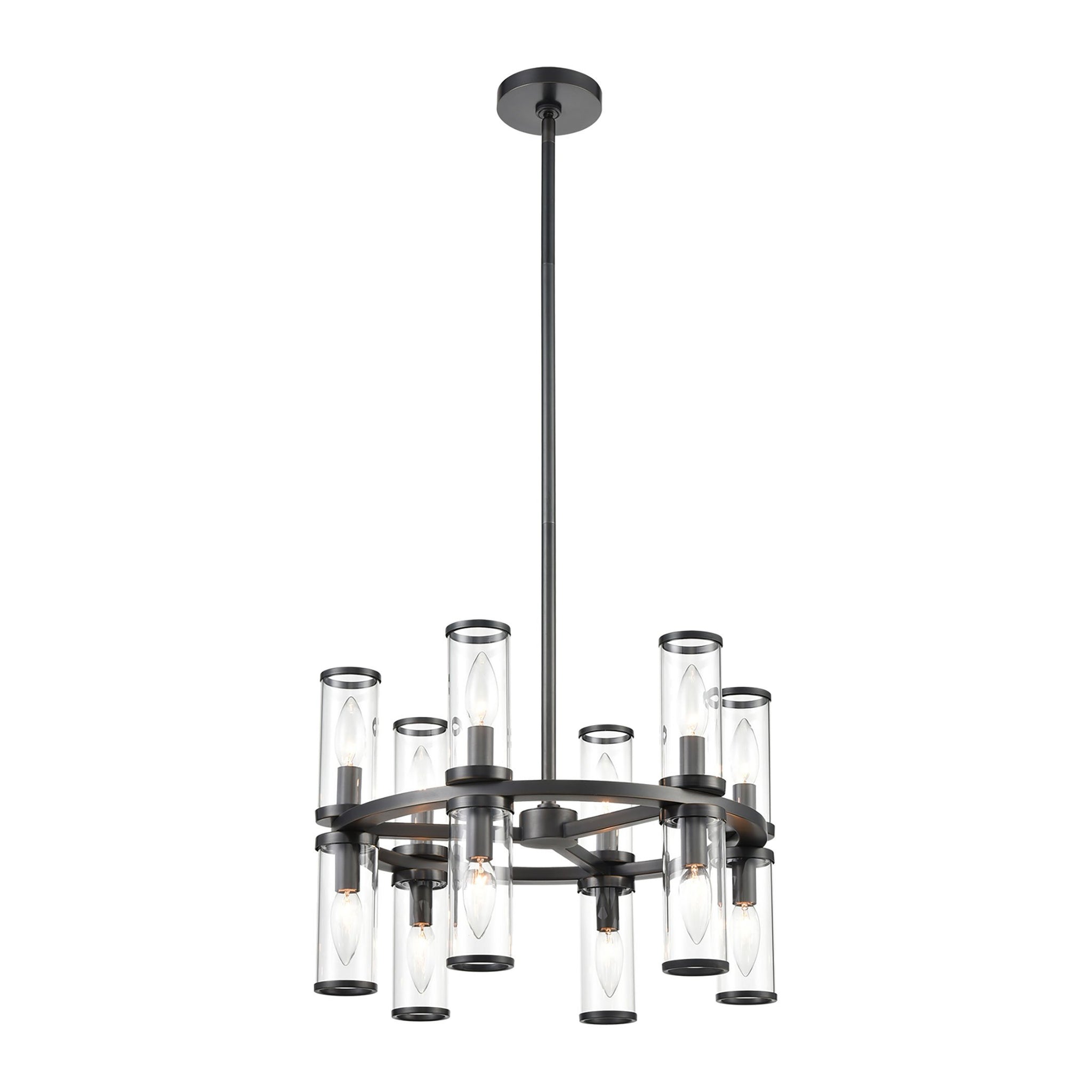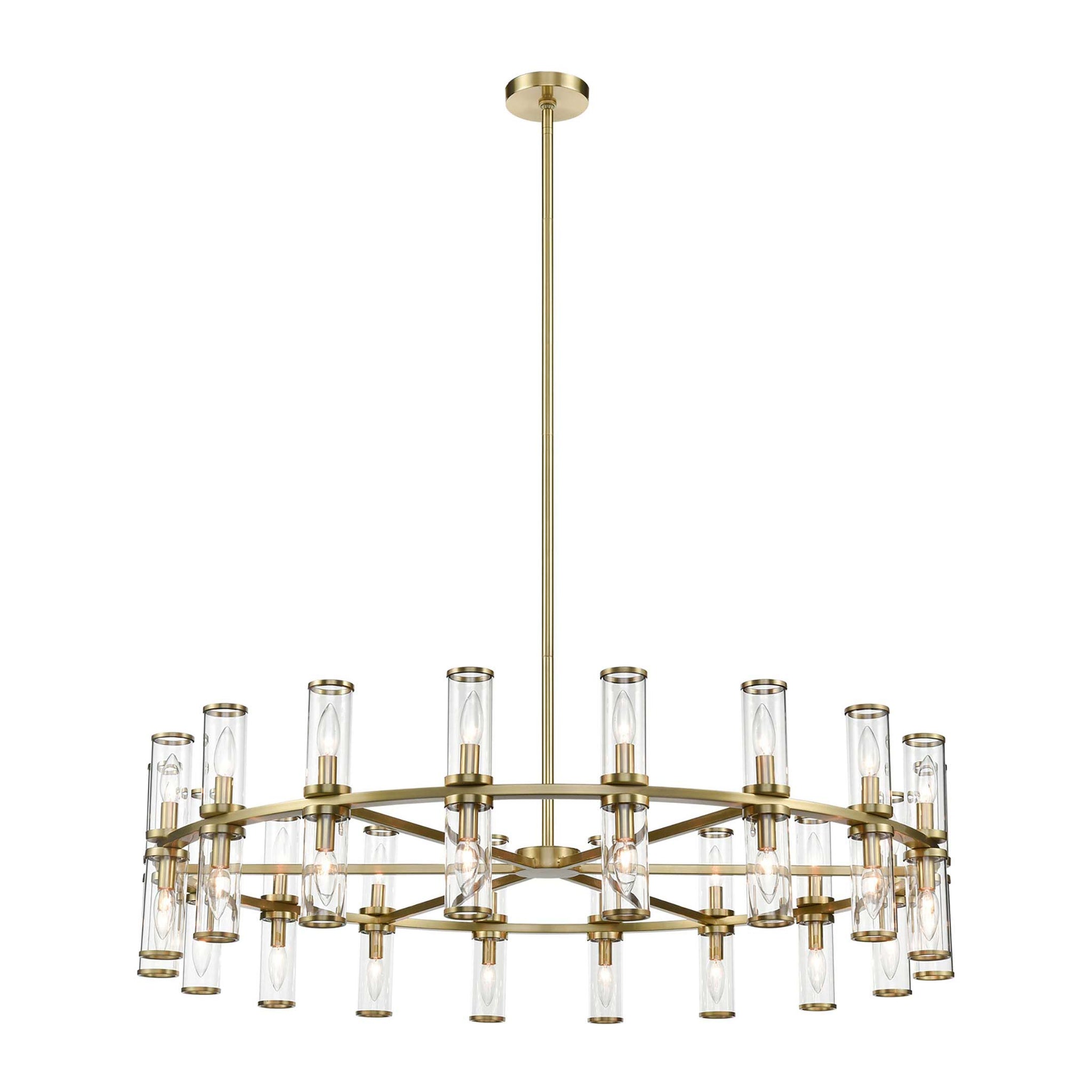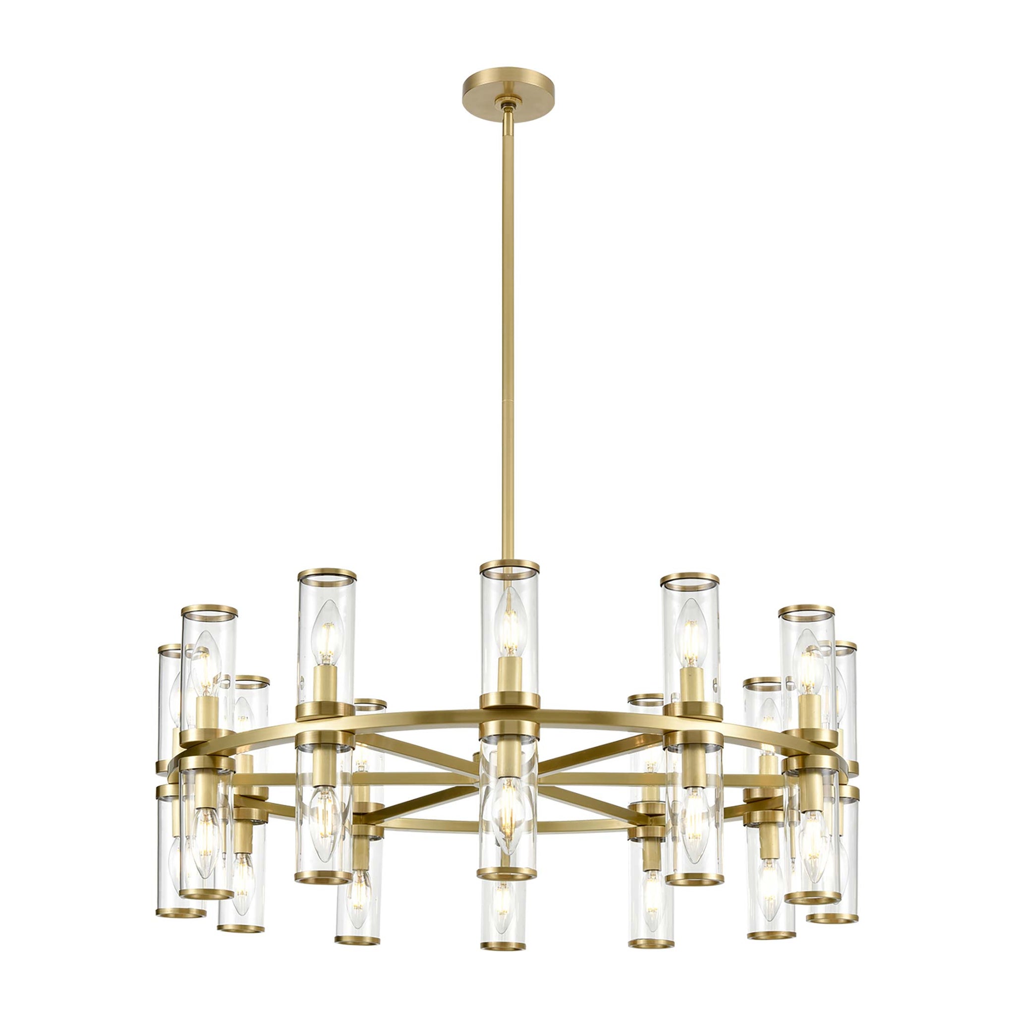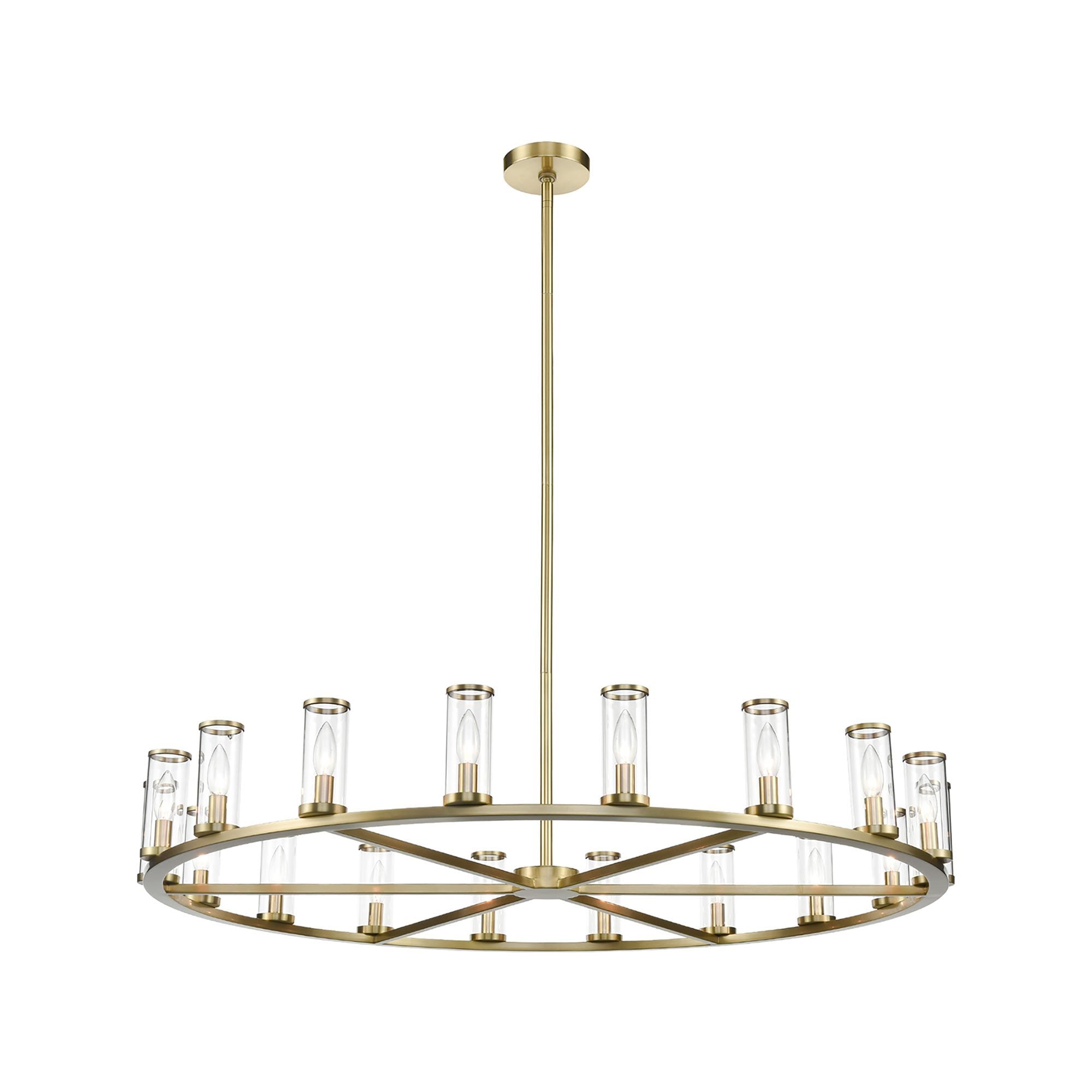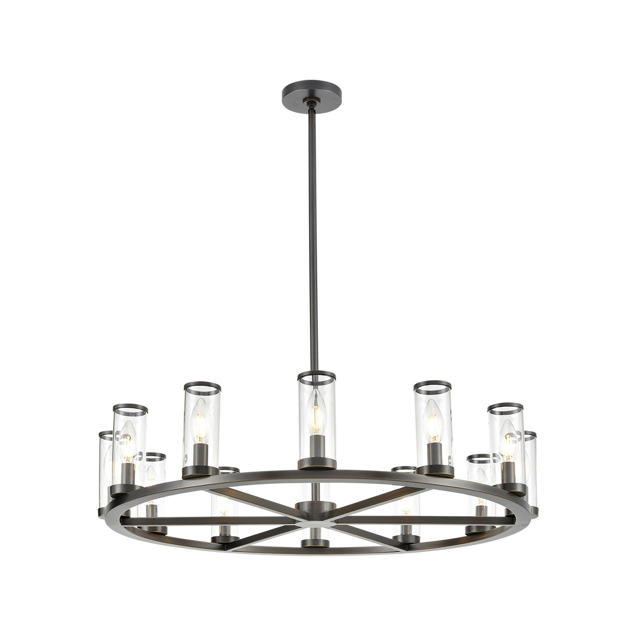 A contemporary aesthetic borrows from Euro-castle inspired design to create the multi-light Revolve Chandelier from Alora Lighting, delivering a glam look with tall glass cylinder shades and an enchanting spoked metal frame.