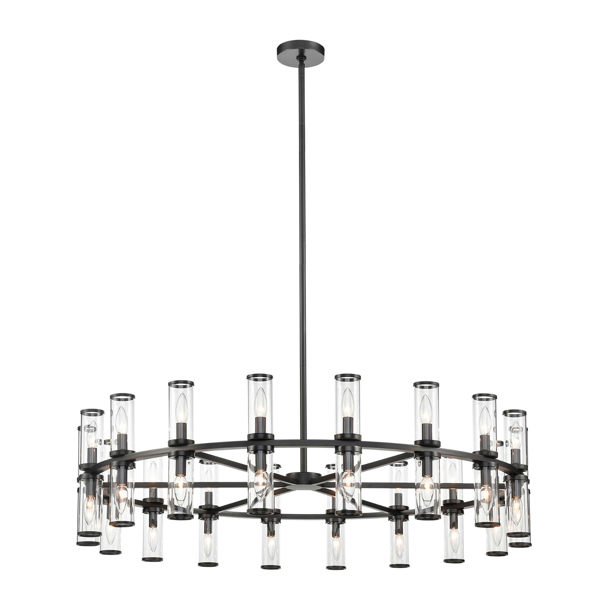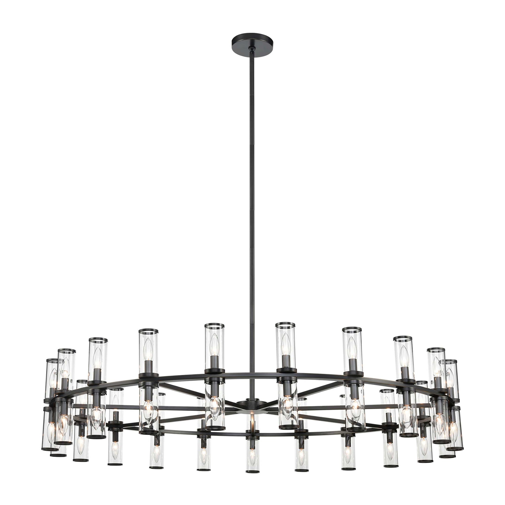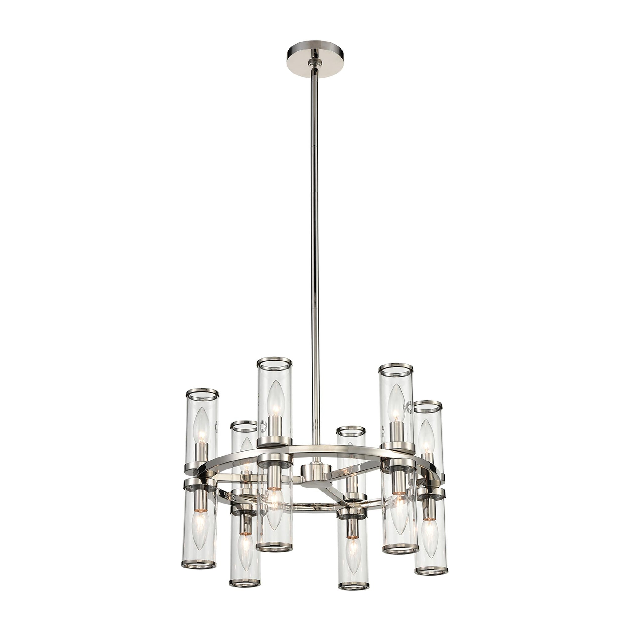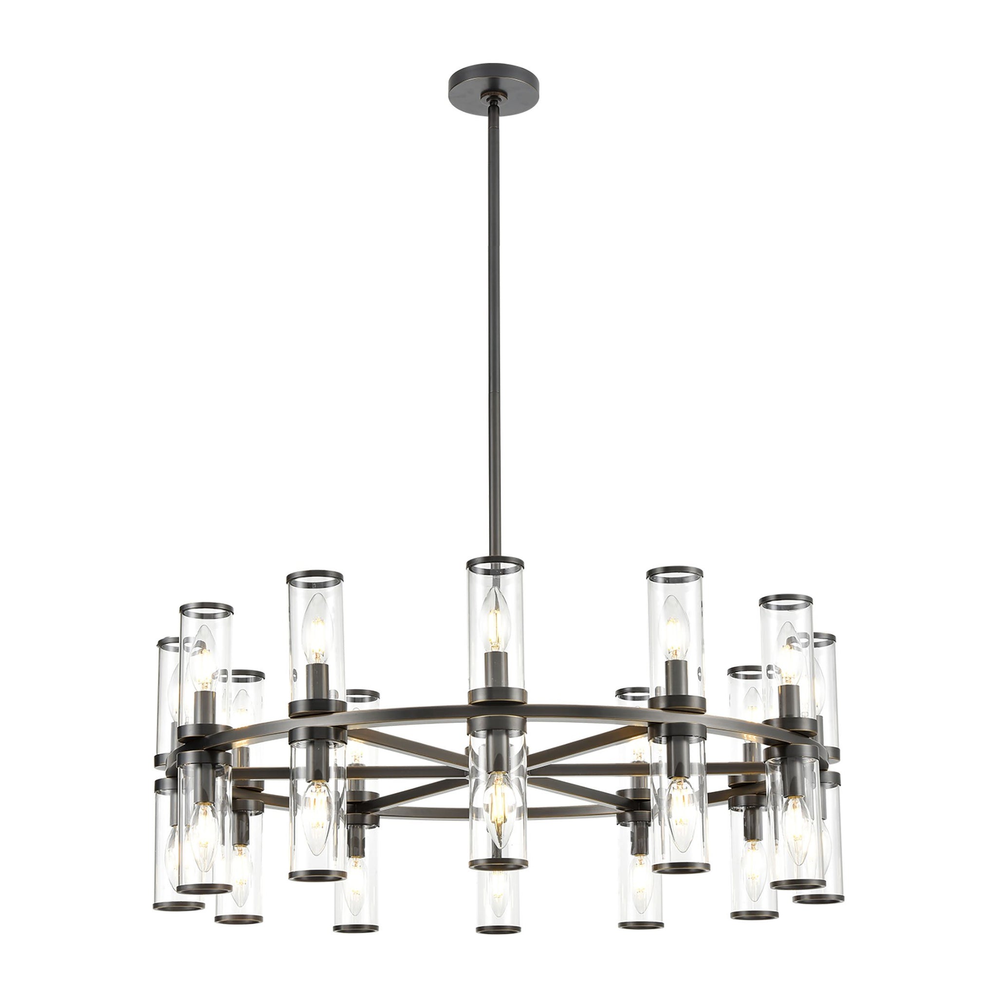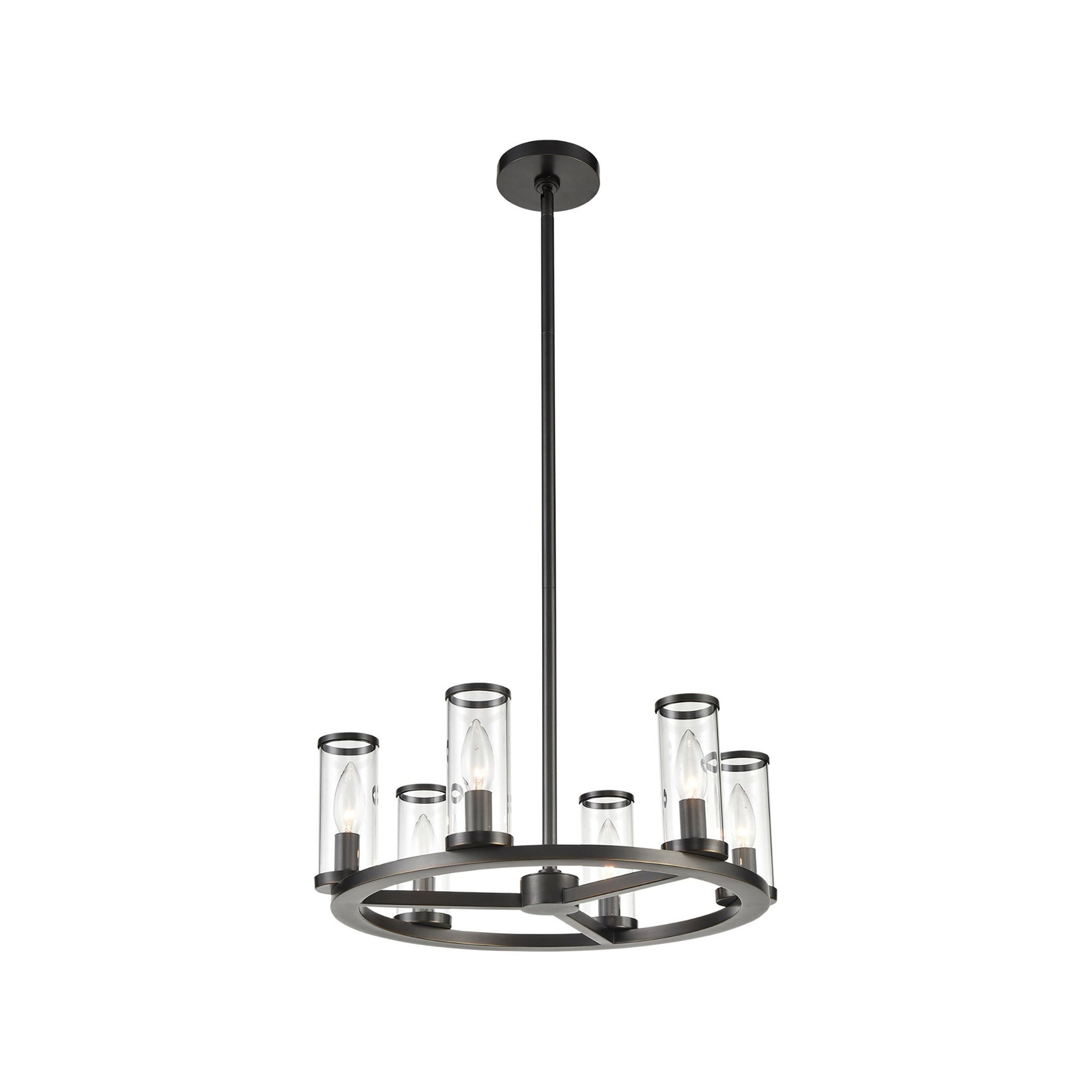 A contemporary aesthetic borrows from Euro-castle inspired design to create the multi-light Revolve Chandelier from Alora Lighting, delivering a glam look with tall glass cylinder shades and an enchanting spoked metal frame.