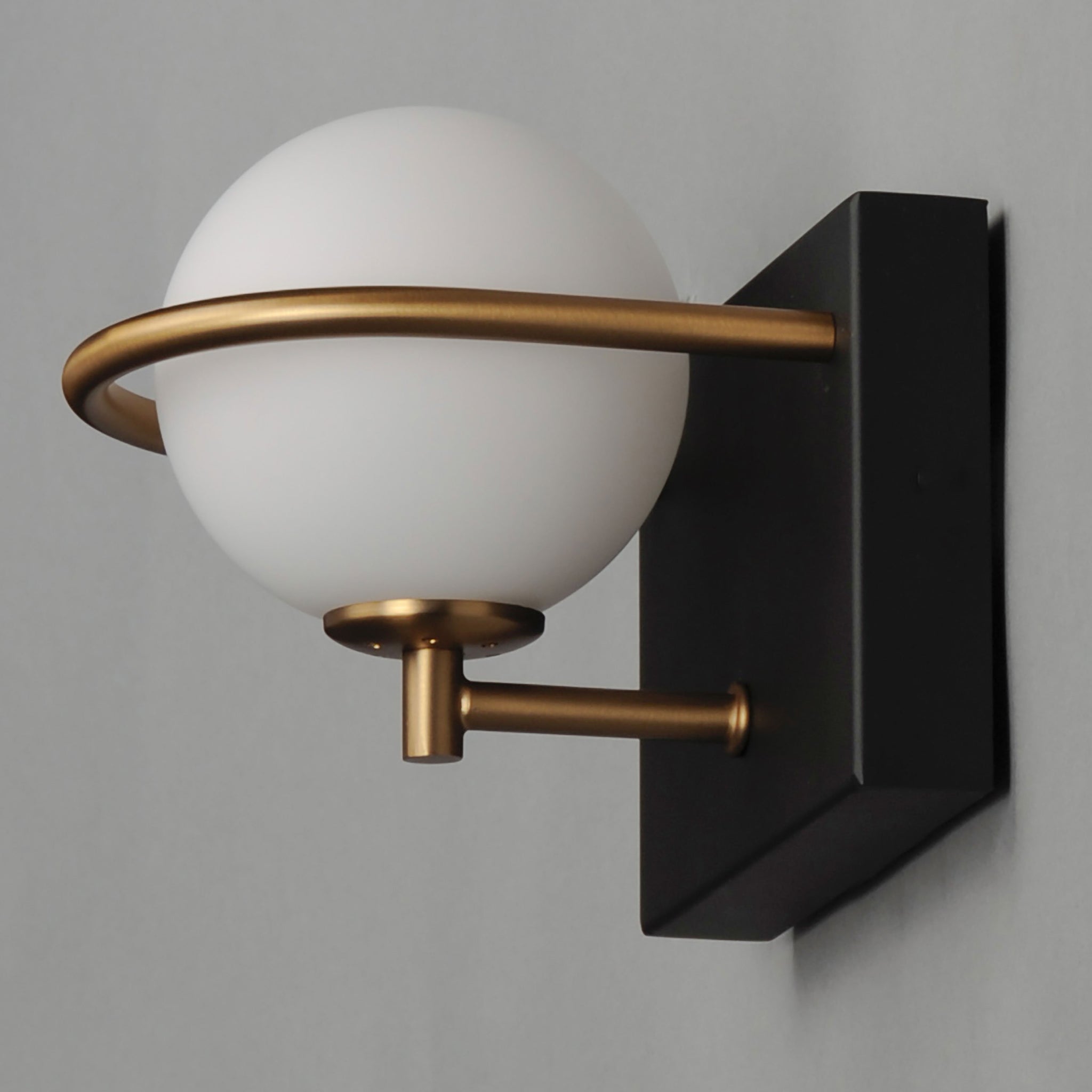 With a galactic-inspired look, the Revolve Bath Light from Maxim Lighting features a glowing orb inset behind a contrasting gilded ring, creating a striking illumination to hallways, bathroom spaces and more.