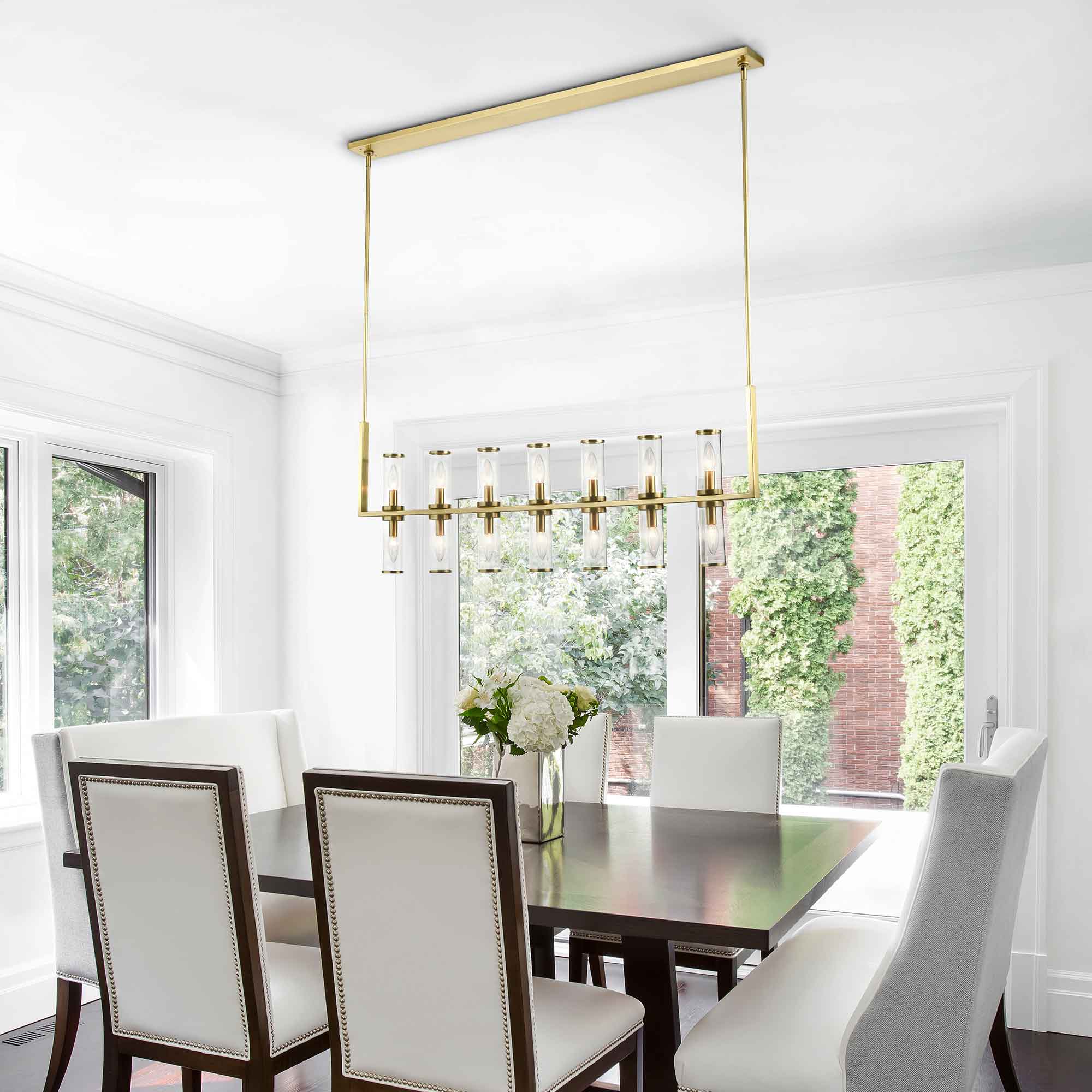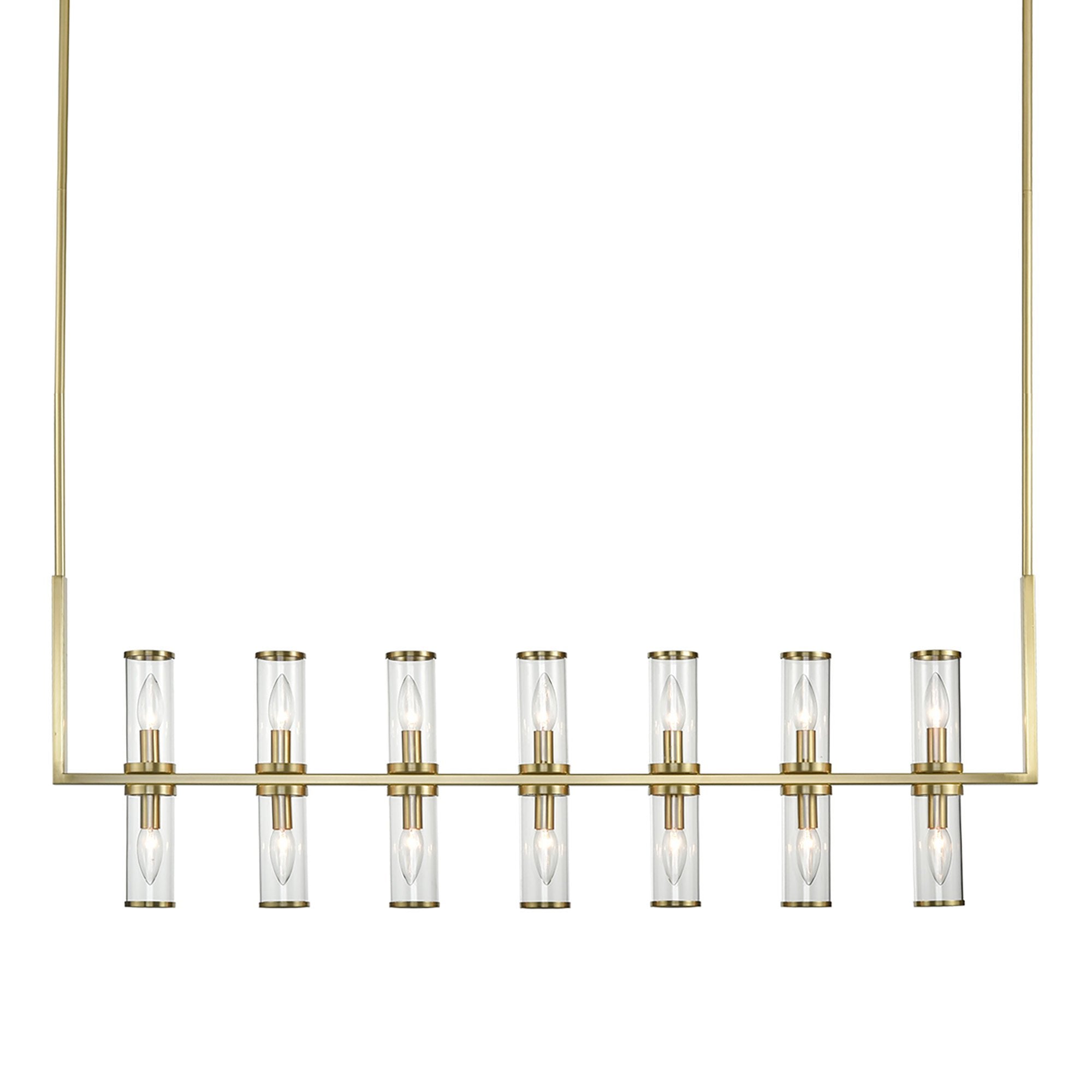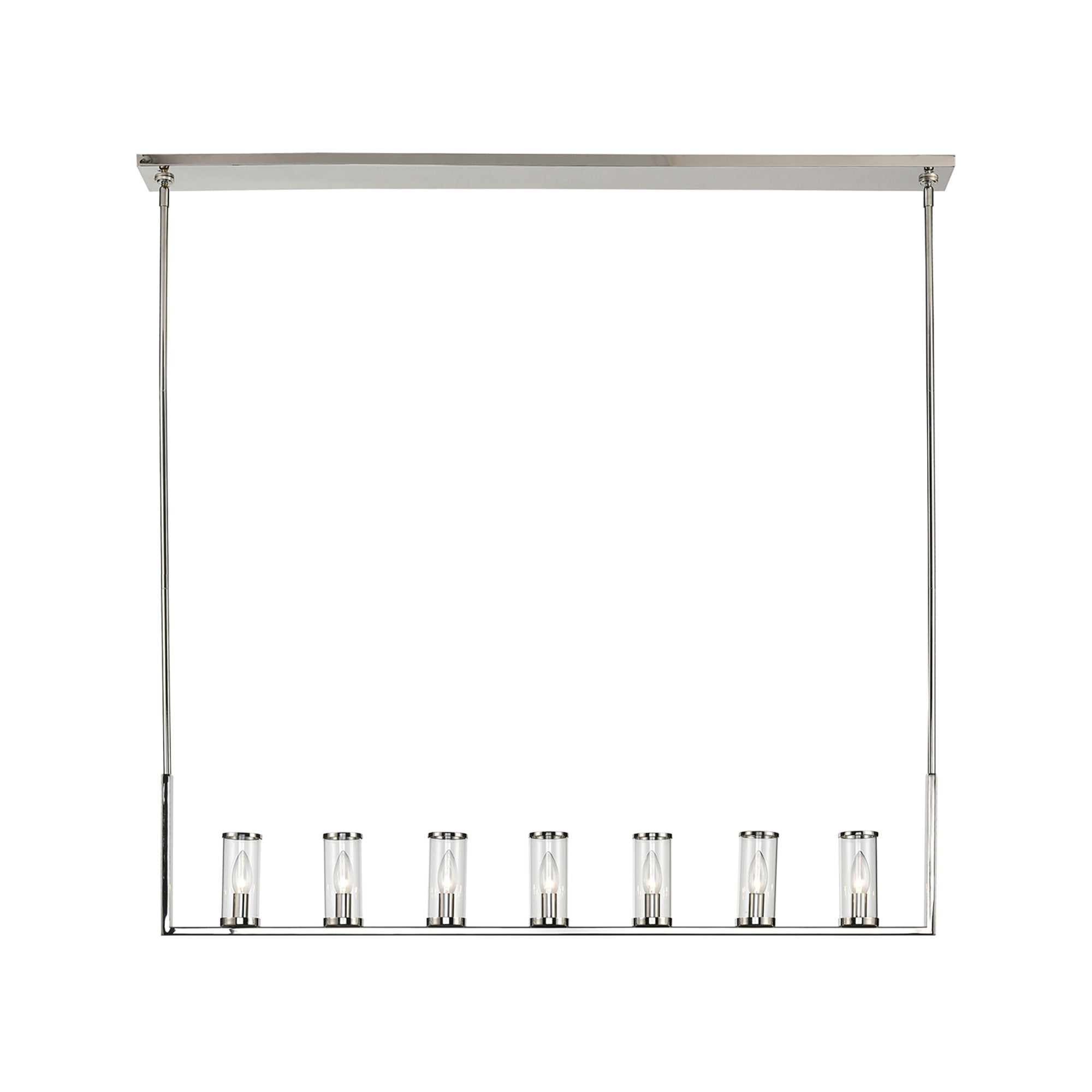 Metal rings bring simple sophistication to glass hurricane shades situated along the slender frame of the Revolve Linear Pendant Light from Alora Lighting.