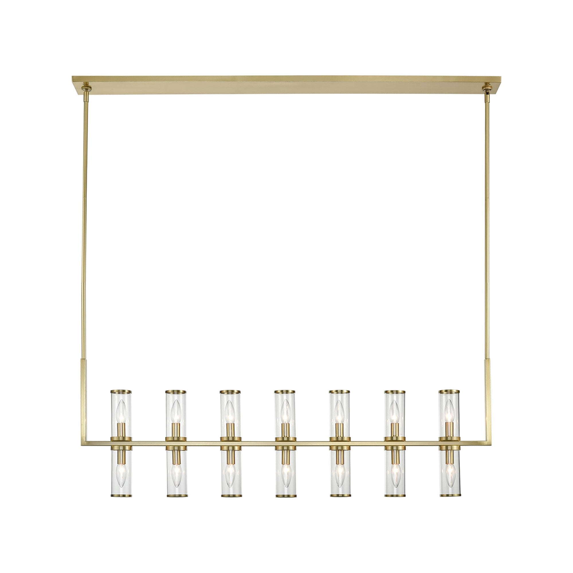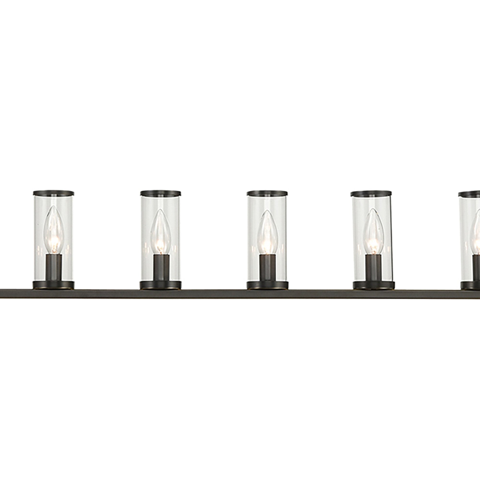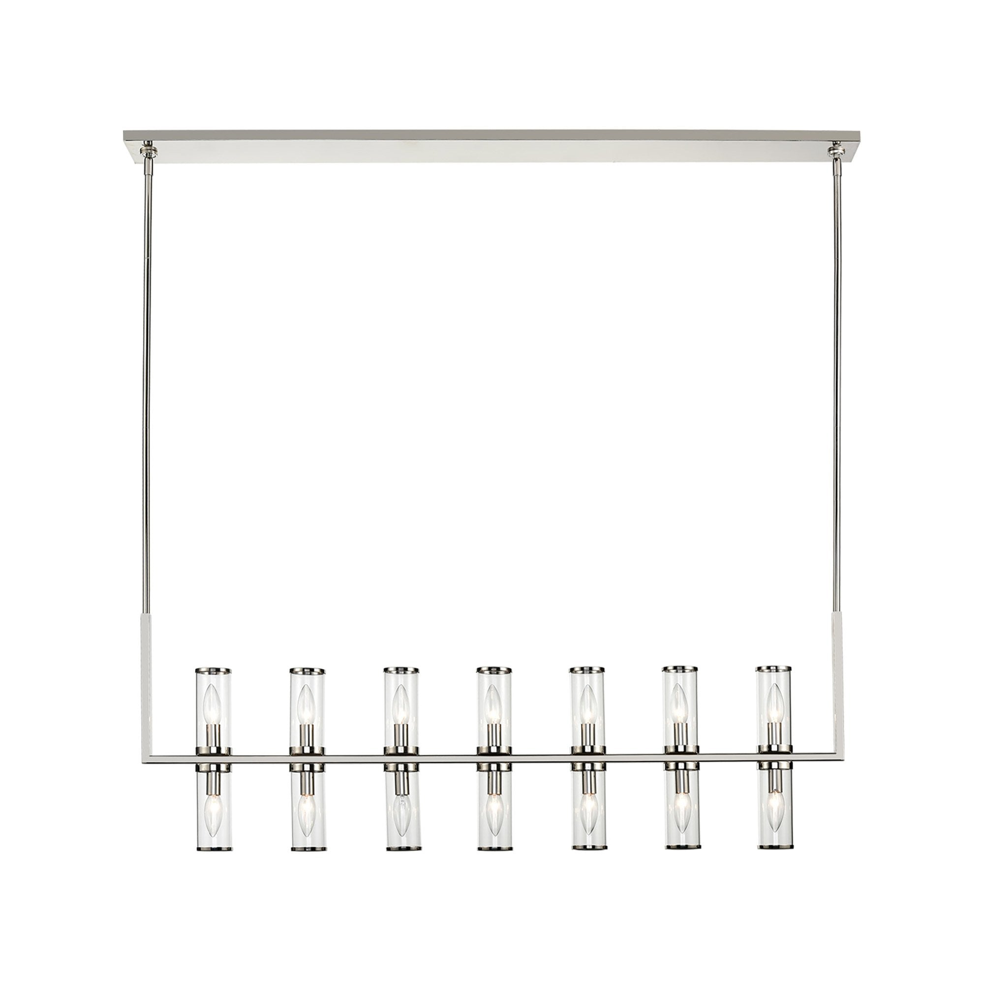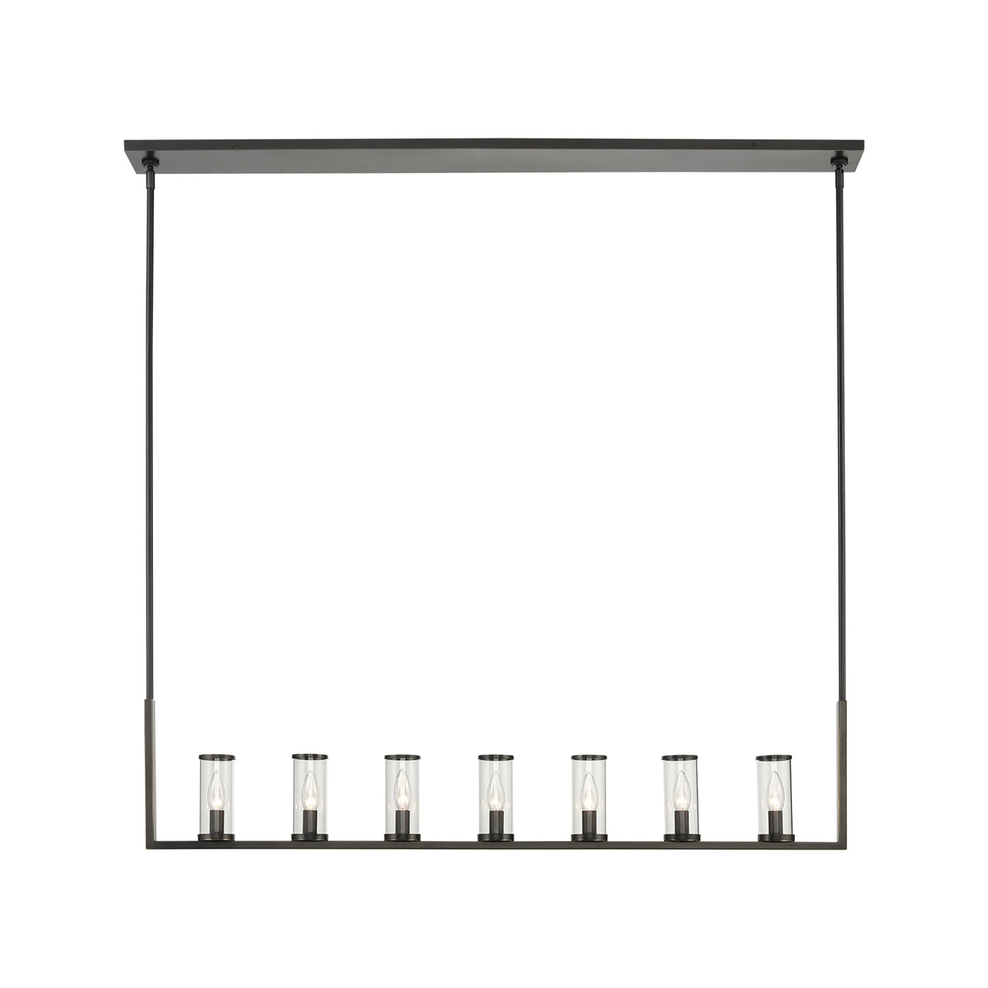 Metal rings bring simple sophistication to glass hurricane shades situated along the slender frame of the Revolve Linear Pendant Light from Alora Lighting.