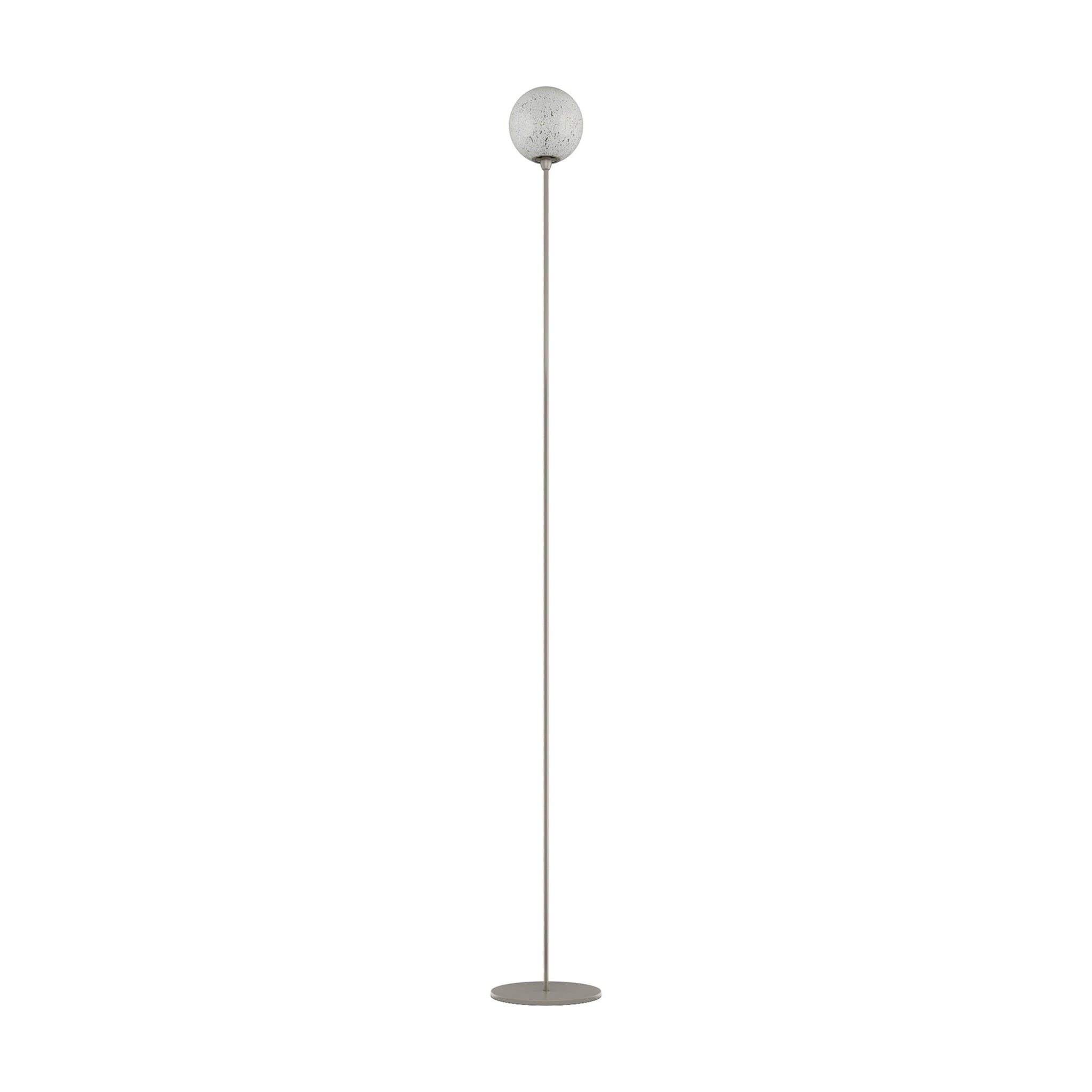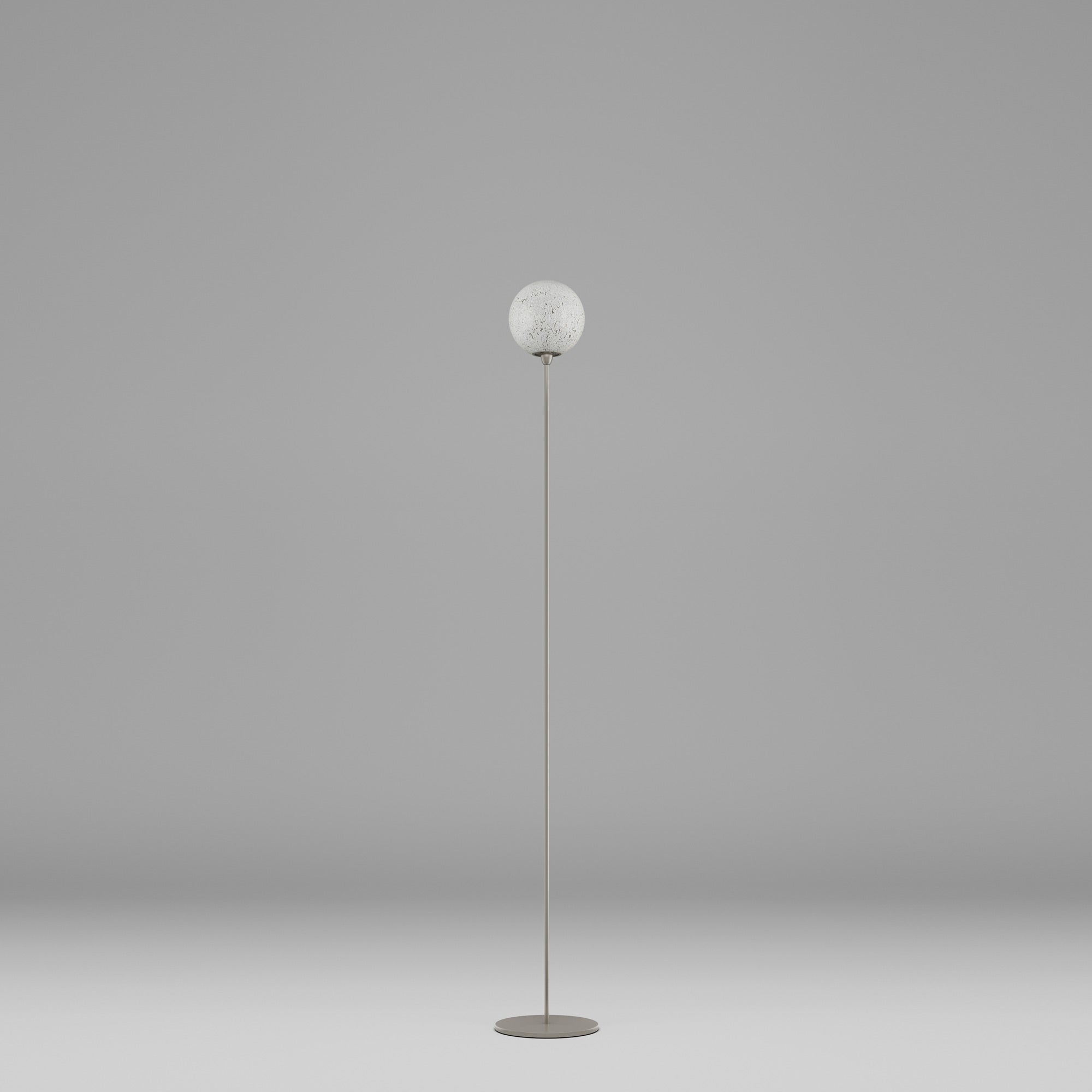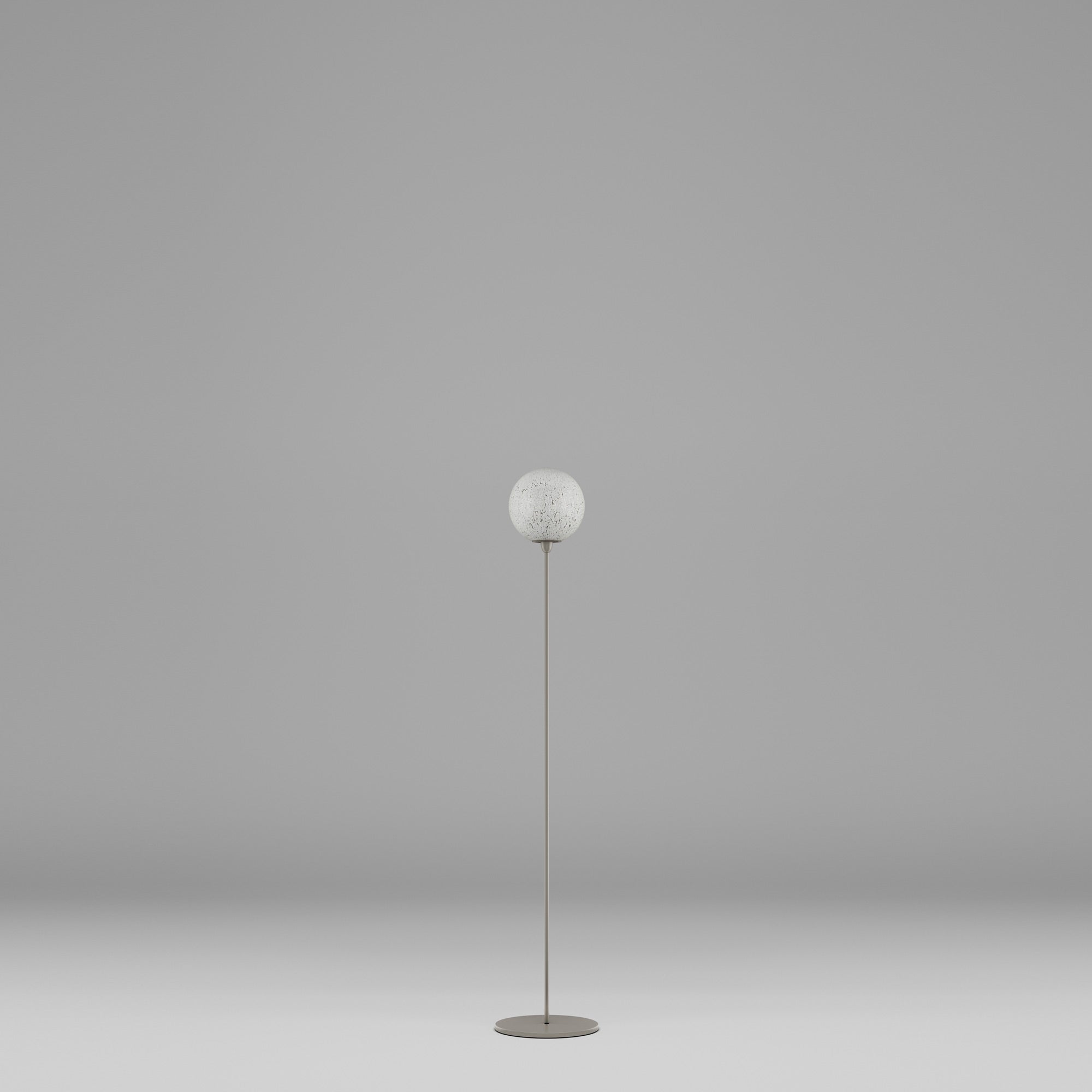 An exotic look of texture coats the circular shade of the Rina Floor Lamp from Vistosi, supplying exceptional style and intrigue perfect for a custom space. This lamp maintains the essence of minimalism with sleek detail as it embellishes and coordinates surrounding décor. A white murrina finish glass sphere shade adds an aged look that enhances a simple metal frame and base.