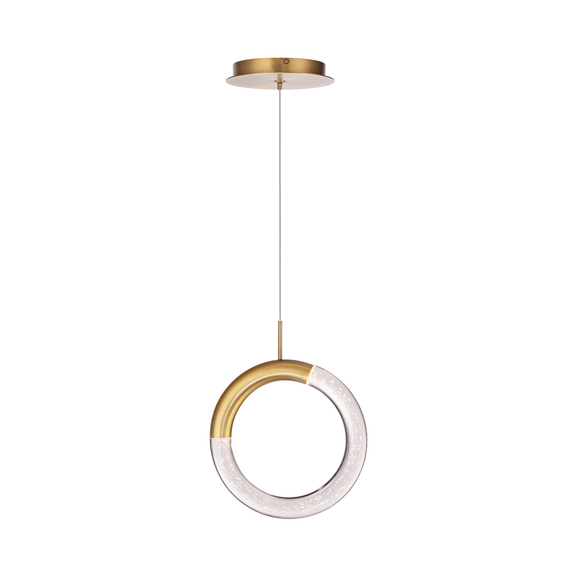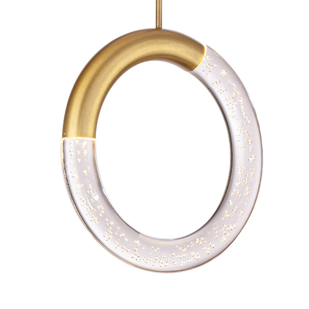 Art Deco takes on a whimsical twist with a light fixture destined to add lightness and energy-efficient light. The Ringlet LED Pendant Light from dweLED is heavy on asymmetry and light on mood, blending a circular open bubble acrylic diffuser with just a hint of aged brass finish metal accenting. Its playful yet artisanal style calls attention to a fixture that becomes a focal point.