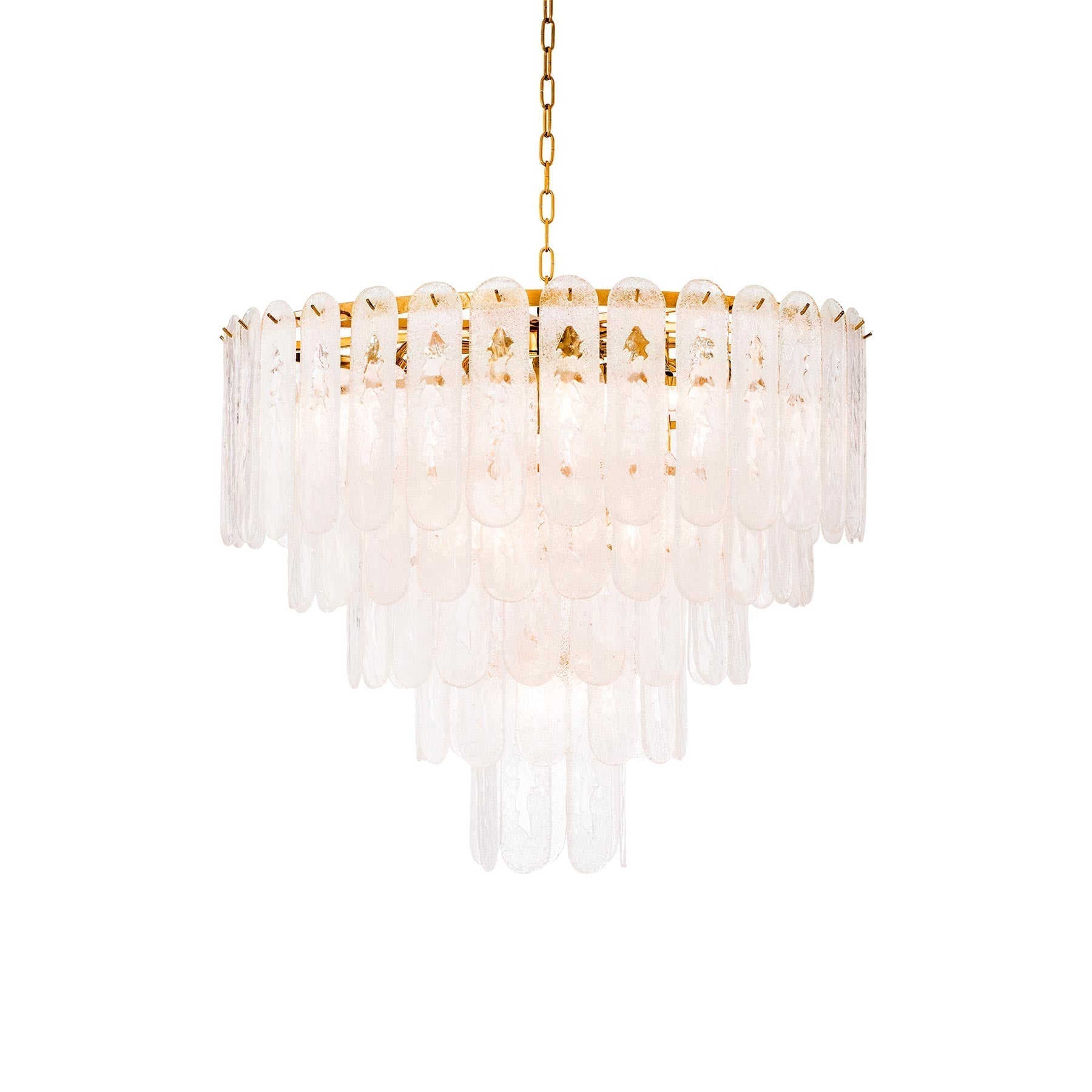 Handcrafted frosted glass panes surround the Riveria Chandelier from EICHHOLTZ Lighting to create a raw nature and breathtakingly beautiful glow. Lustrous warm metallics lend a luxurious surprise, contrasted against the serene organic elements of the tiered cascading silhouette.
