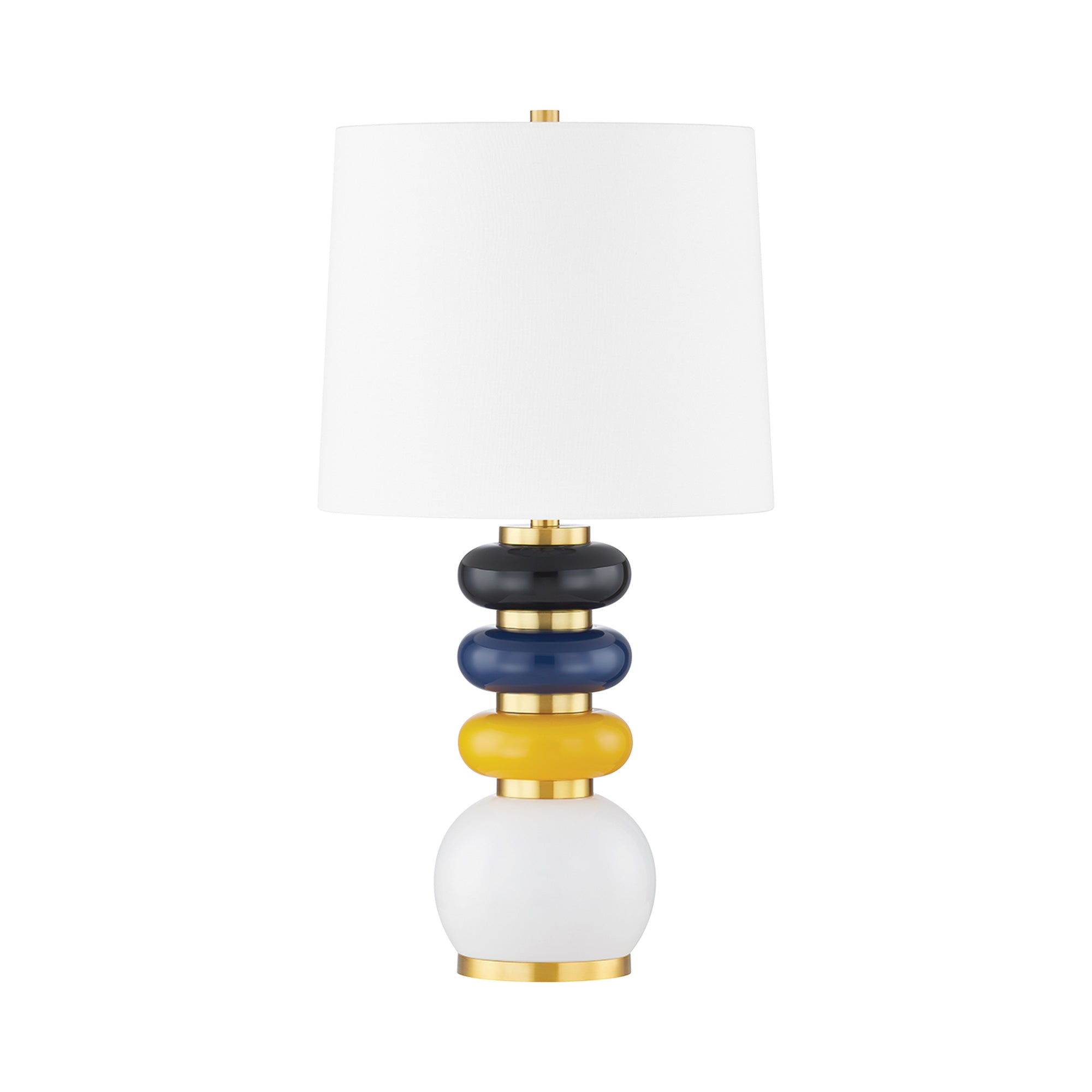 Stacked rings in varying hues and sizes create a jewelry inspired look for the Robyn Table Lamp from Mitzi. A striking choice for a side table or console in your living room, it's a mix of modern and classical design motifs that combine to create a fresh, refined fixture. An aged brass accent finish and a white linen tapered drum shade complete the look with a brilliant mix of warm, sleek style.