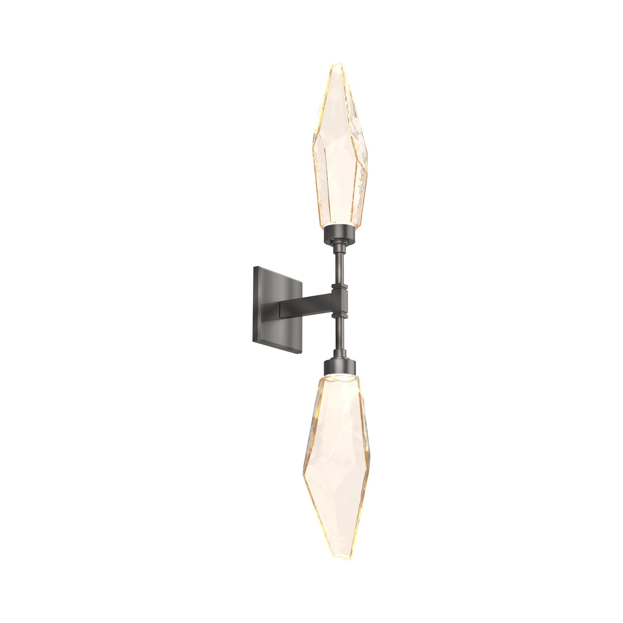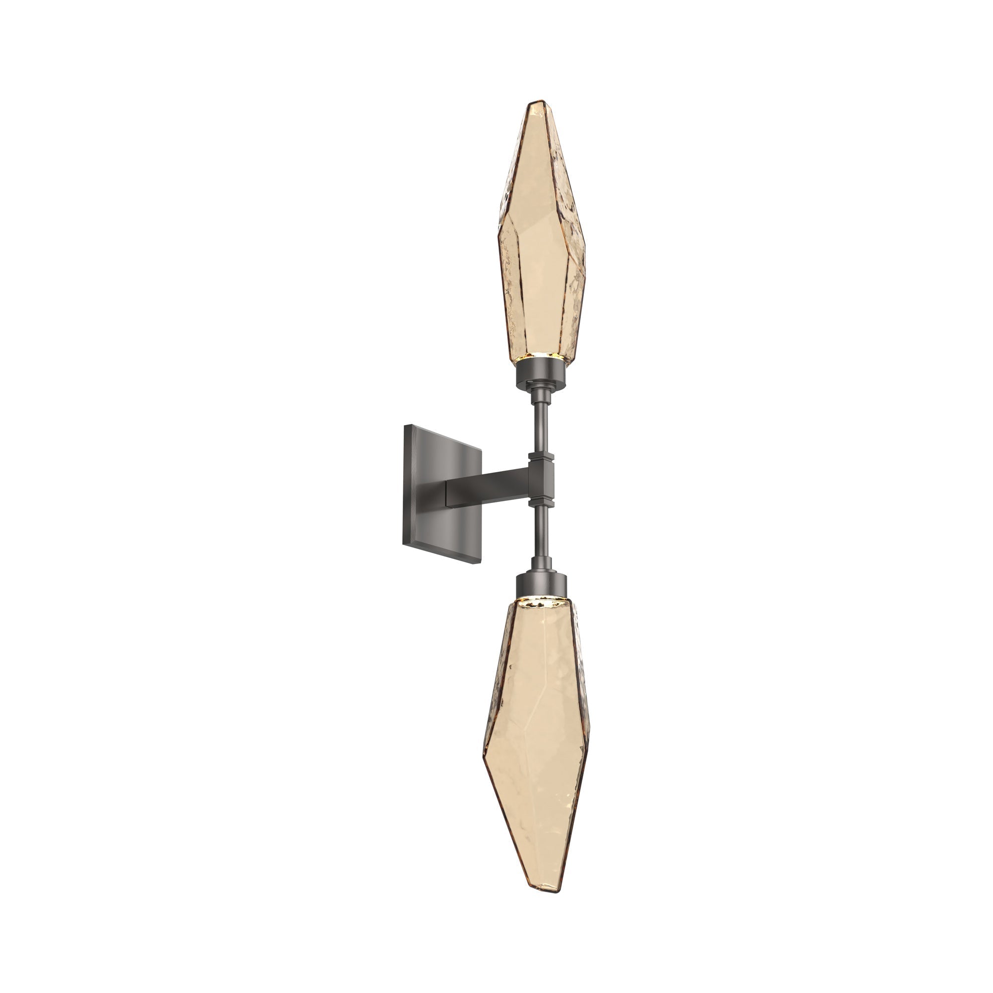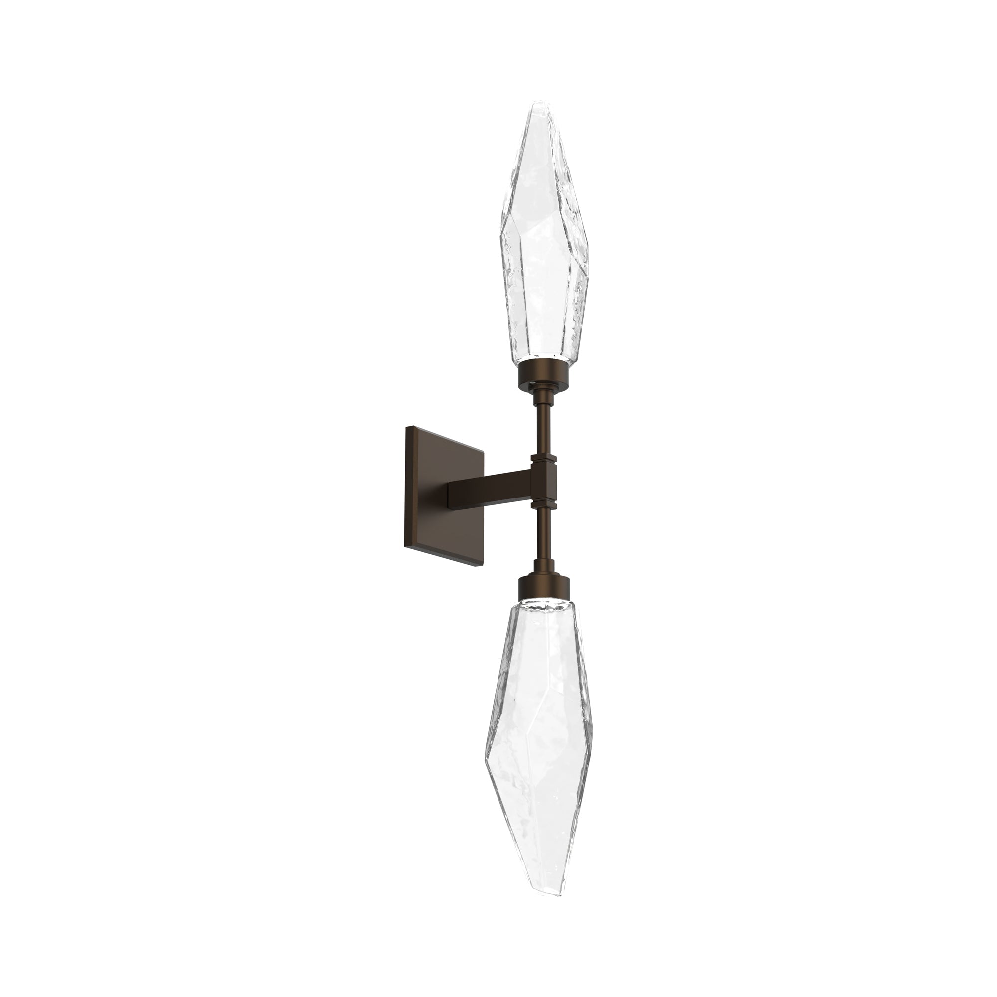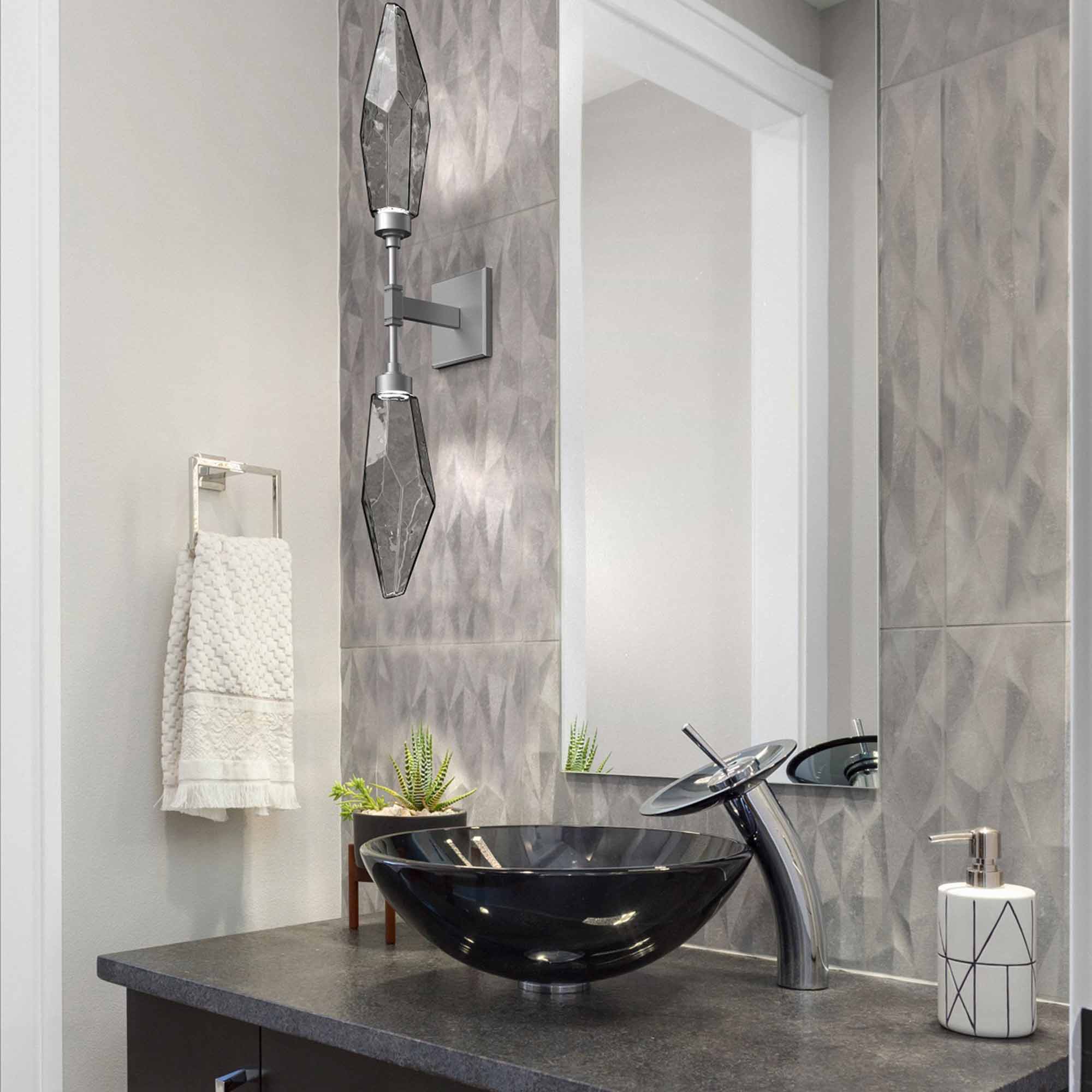 Cast a dreamy glow across a focal wall or hallway corridor with the stunning Rock Crystal LED Double Wall Light from Hammerton Studio. Designed as a dual torchiere style wall light, two breathtaking artisan blown glass shades send out a lovely diffused light, creating a scintillated effect with their gem-like faceted silhouettes. A slender linear frame is capped at both ends by these charming precious stone-inspired angular globes, giving off a bohemian touch to this fantastical energy-efficient double wall light.