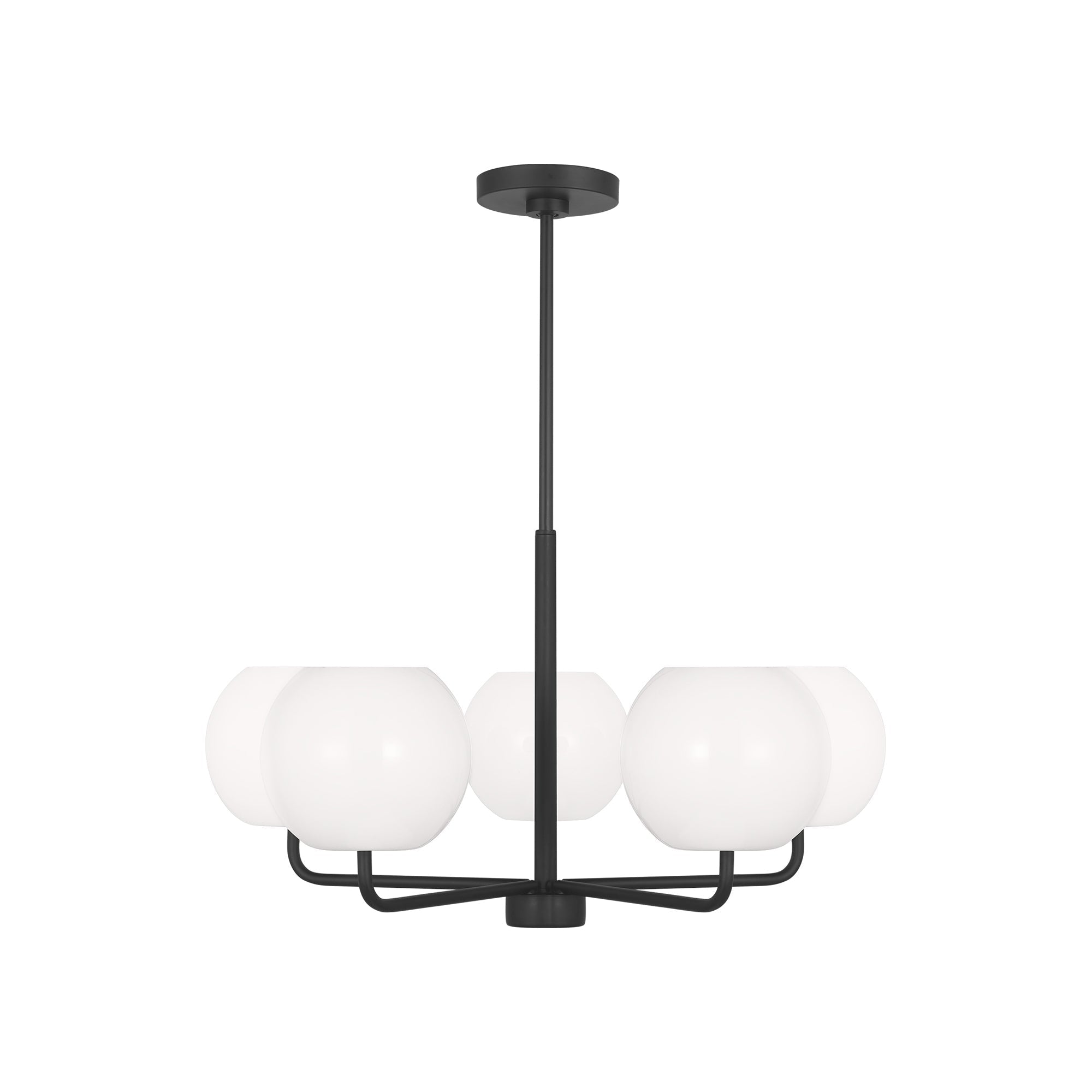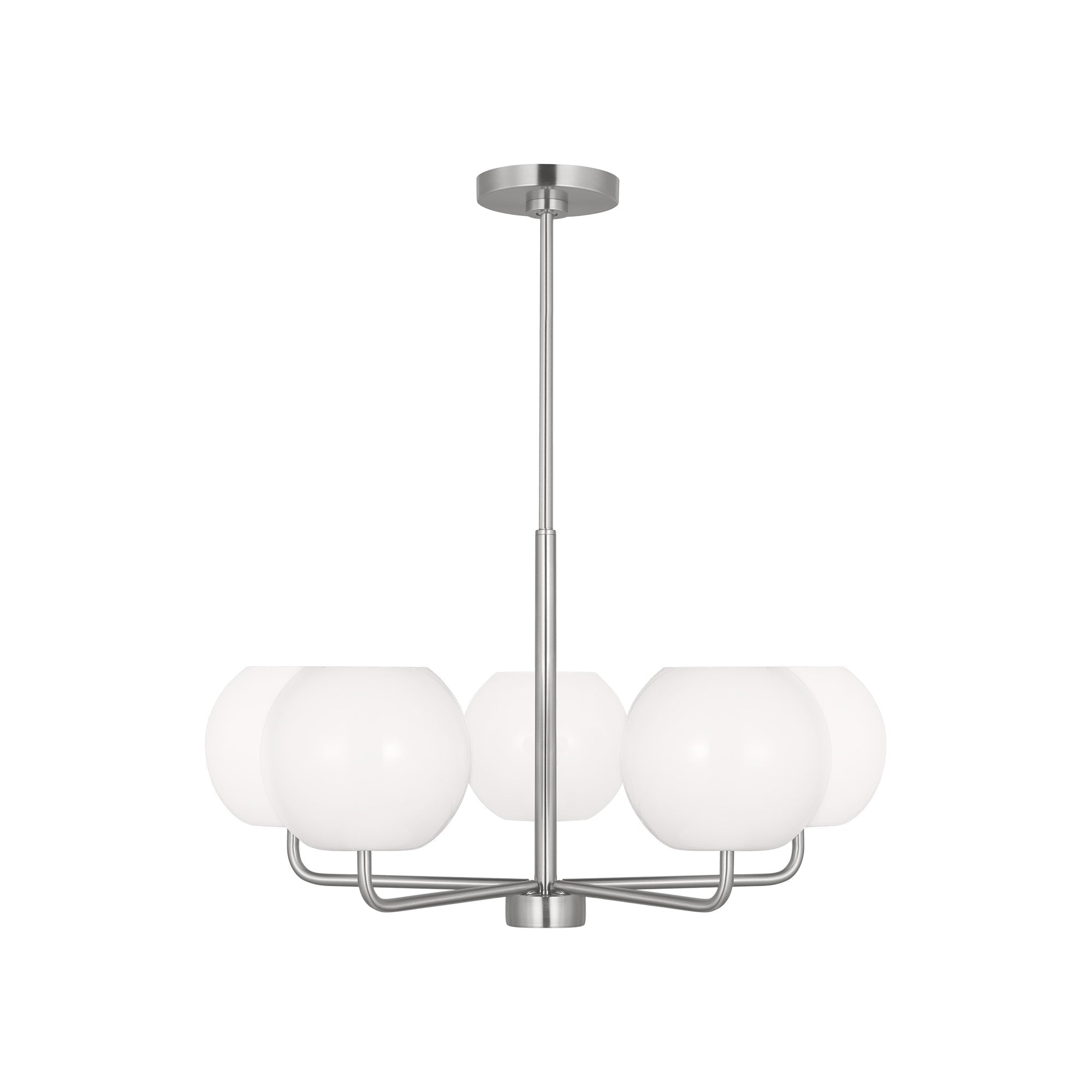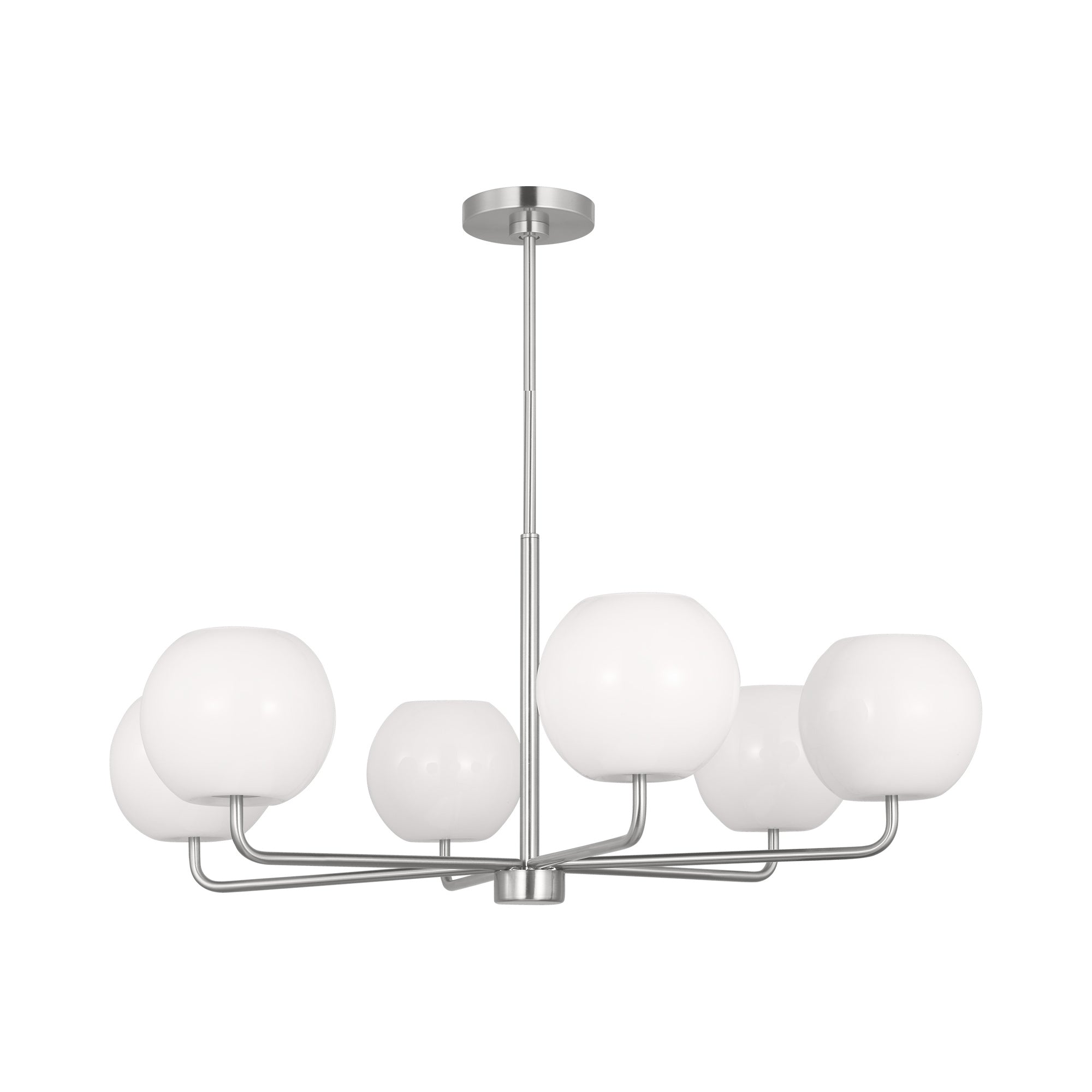 The Rory Chandelier from Generation Lighting embraces a mix of industrial and cheeky modern design aesthetics. This multi-light fixture is a perfect fit for light, easy dining and living spaces. Metal framing with ultimate symmetry supports semi-globe shades made of milky glass.