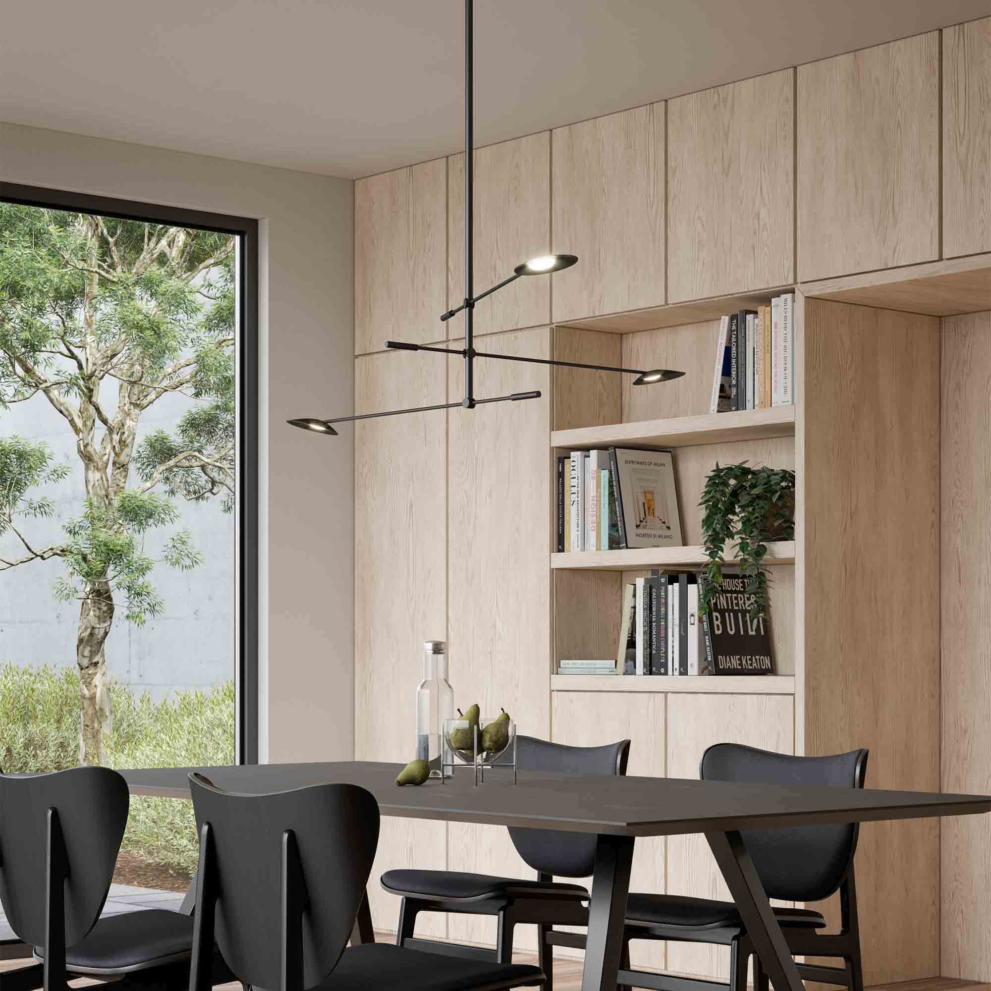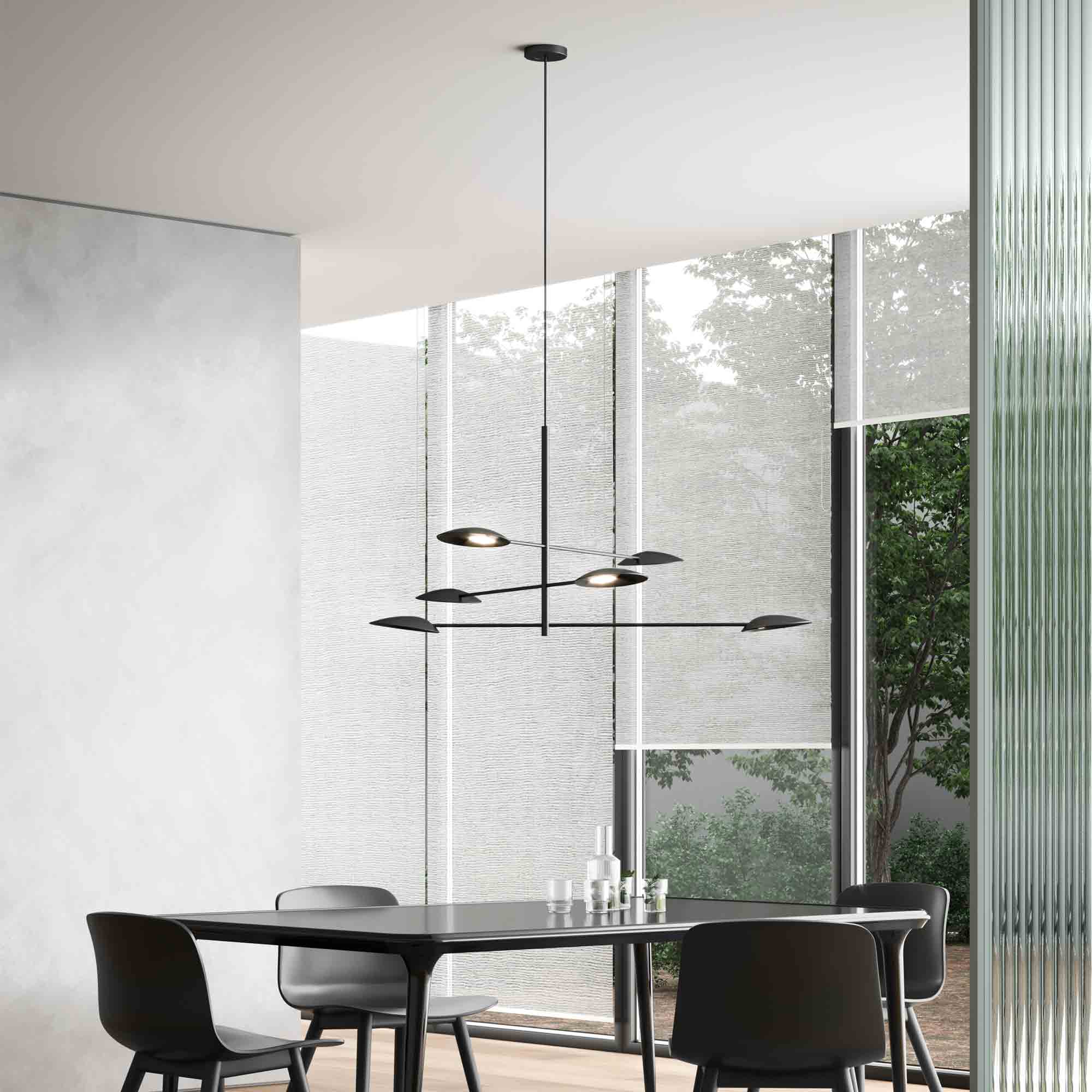 Intersecting linear elements reflect a sleek contemporary customization to the Rotaire LED Chandelier from Kuzco Lighting, offering a central focus to a modern dining or living space. Bold black finish metal forms a tree-inspired minimalist design with frosted acrylic diffusers sending energy-efficient directional lighting in an up or down direction.